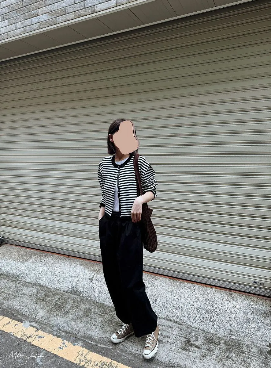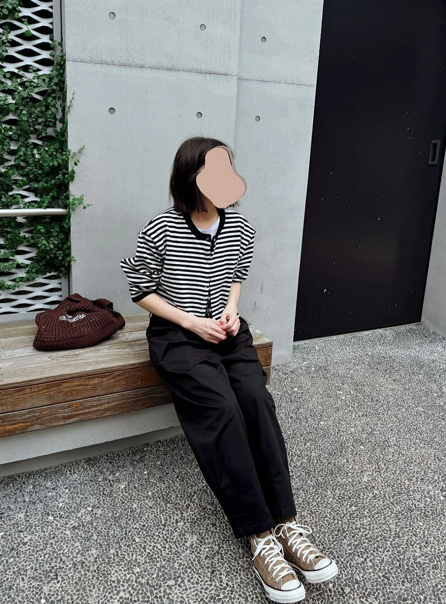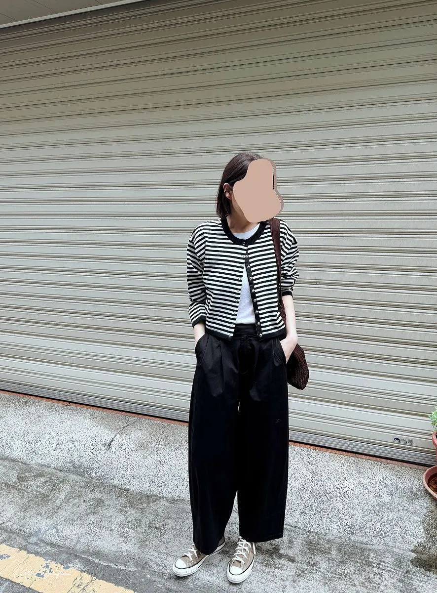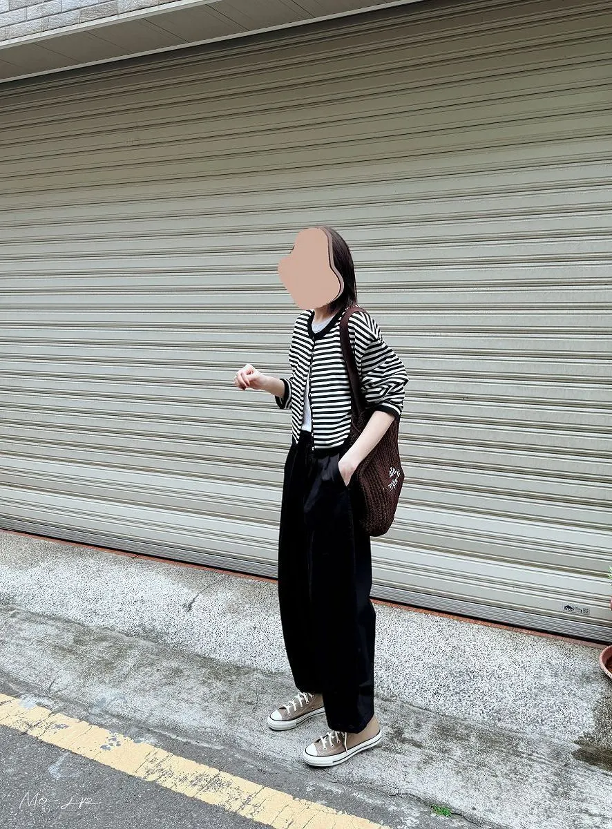 下面的圖片穿搭<黑色嬌小版M號>搭配條紋針織外套