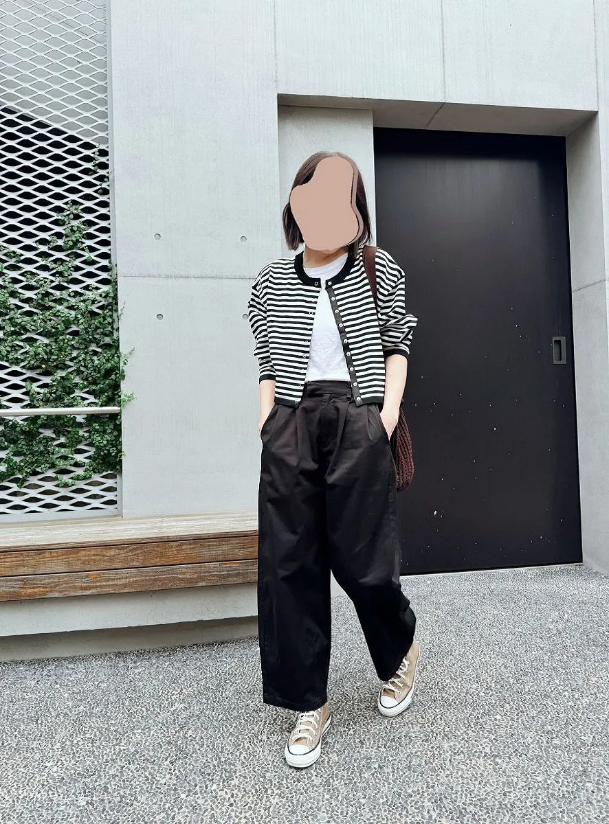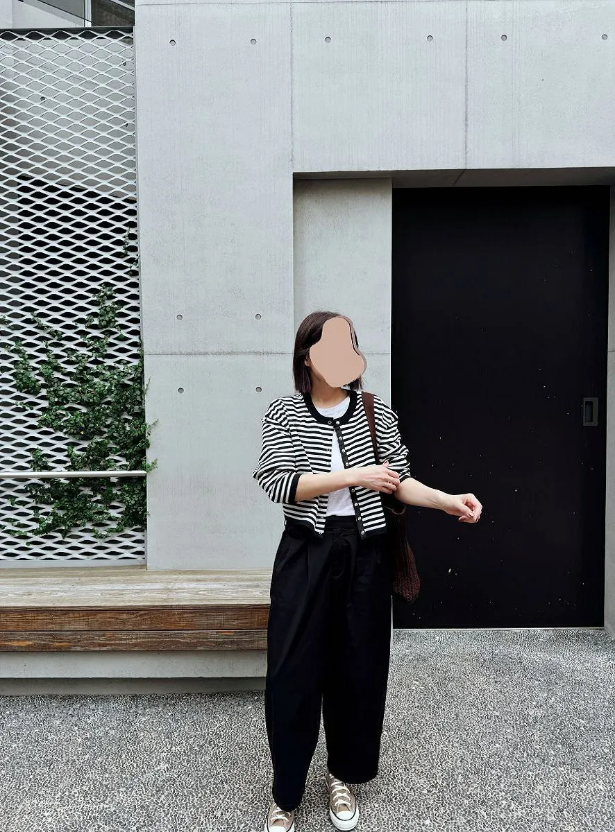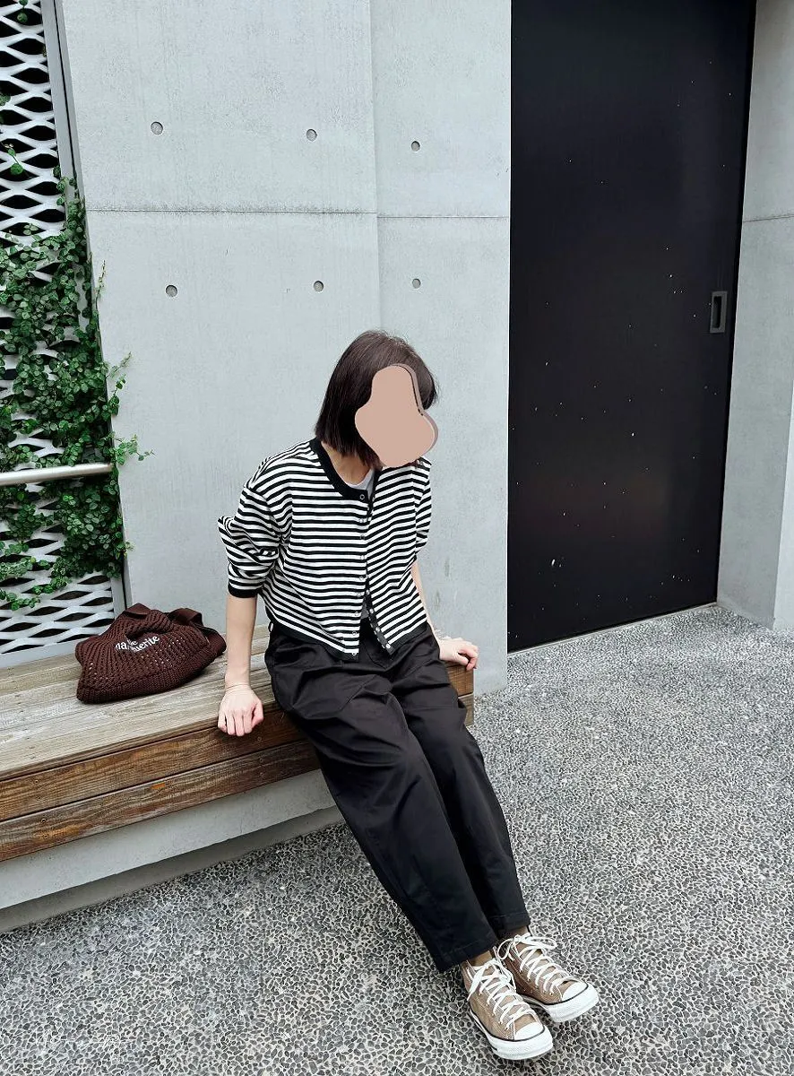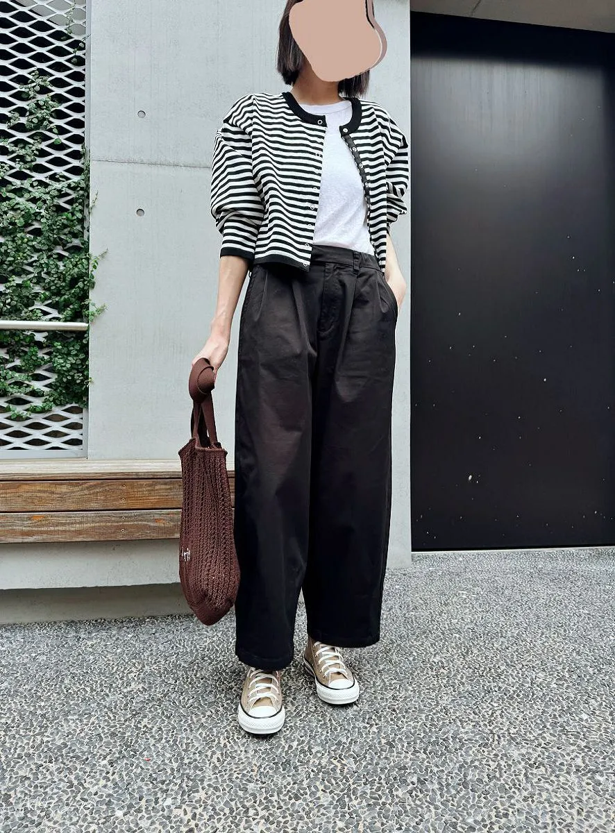 下面的圖片穿搭<黑色嬌小版M號>搭配條紋針織外套