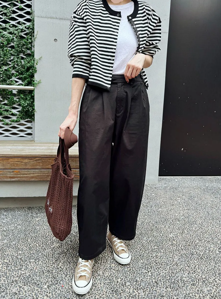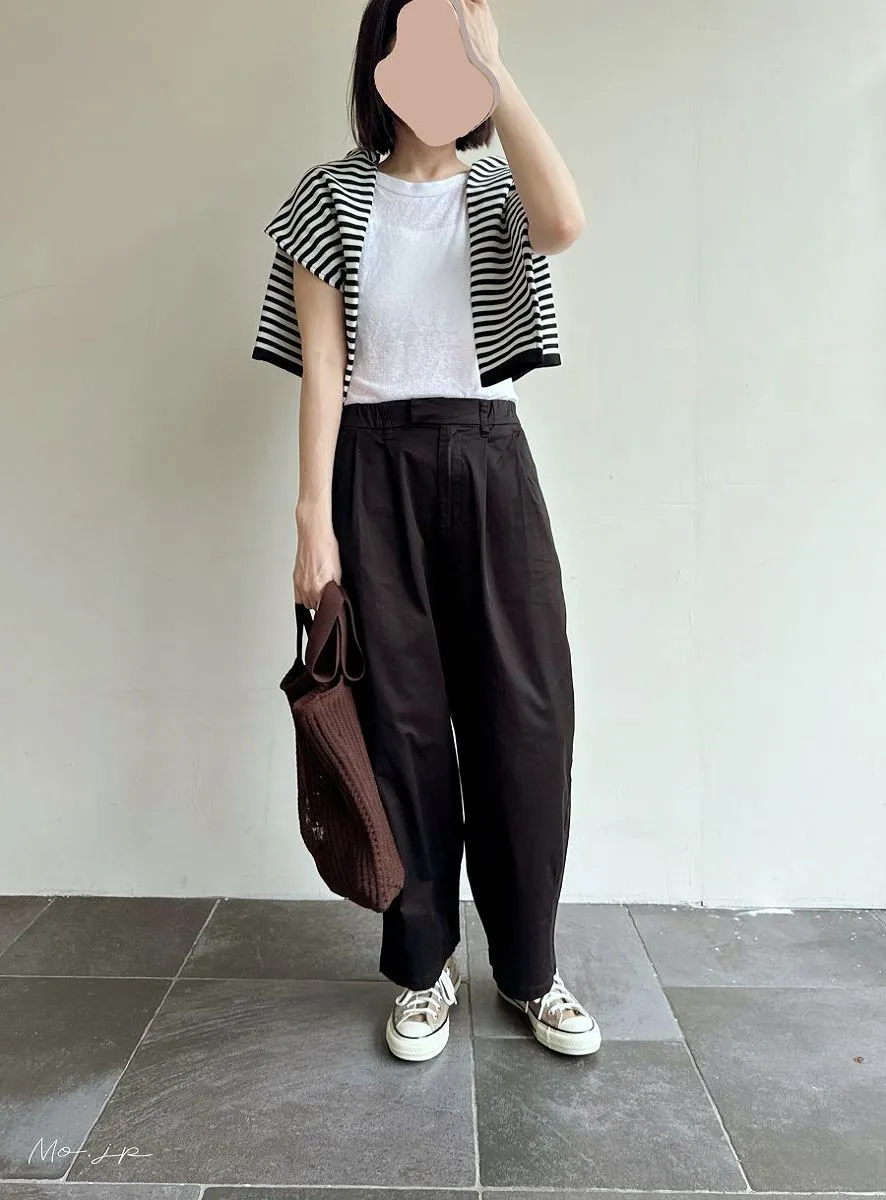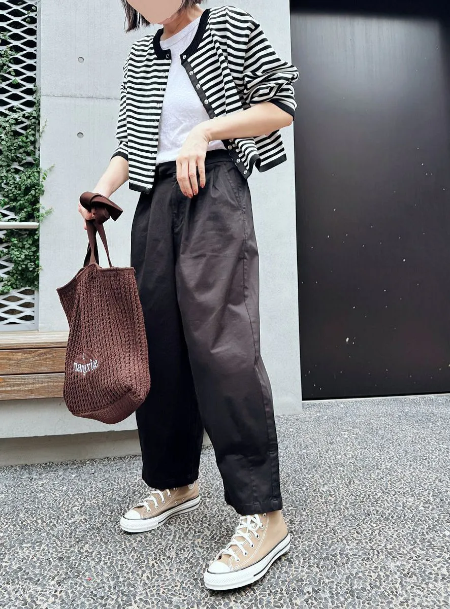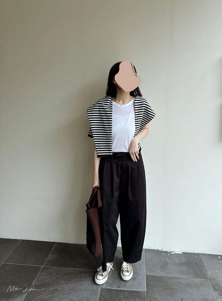 下面的圖片穿搭<黑色嬌小版M號>搭配條紋針織外套