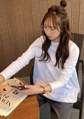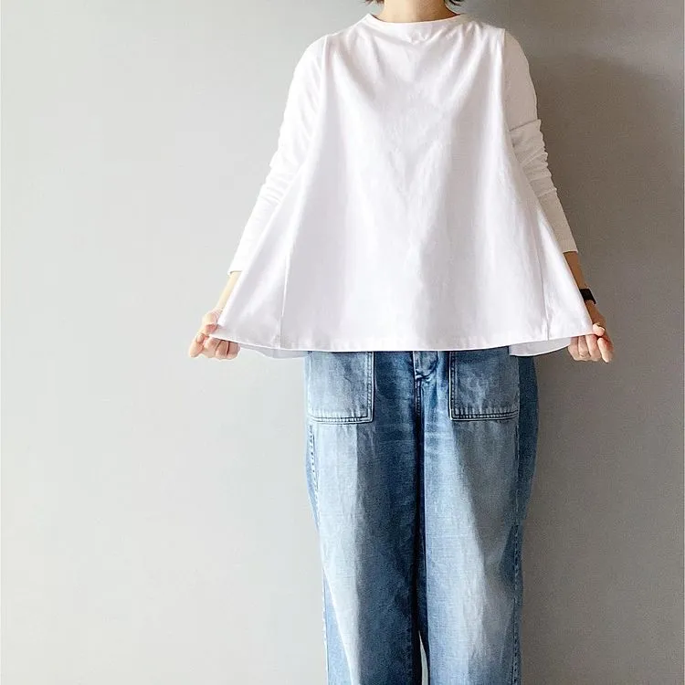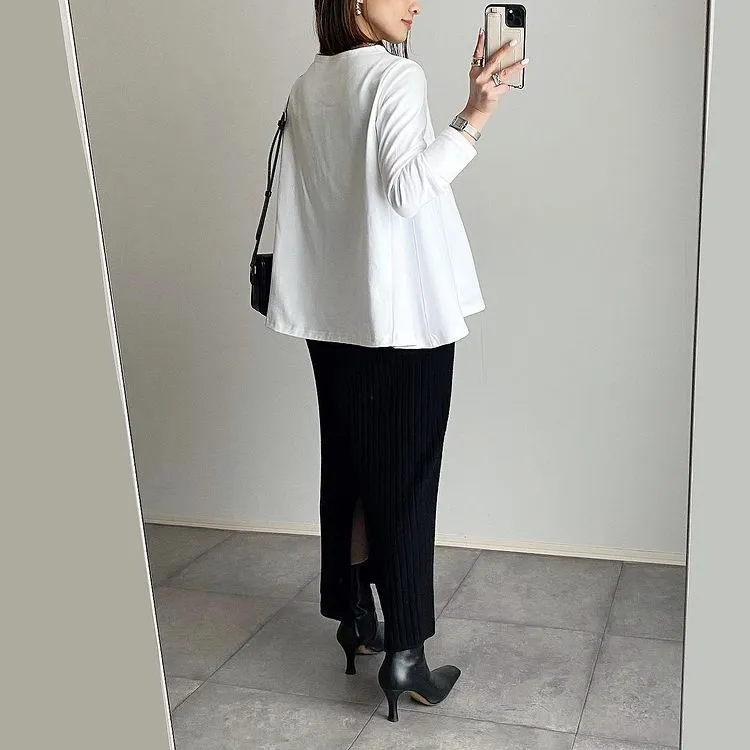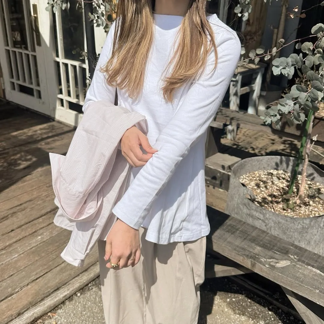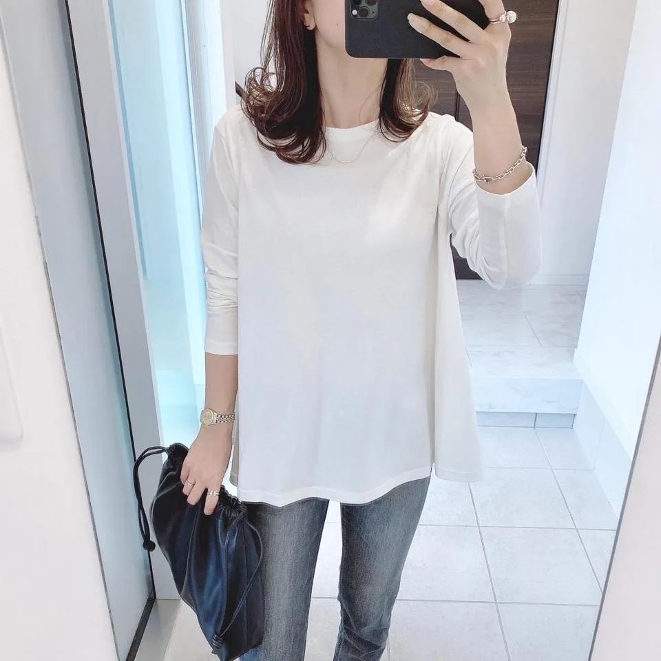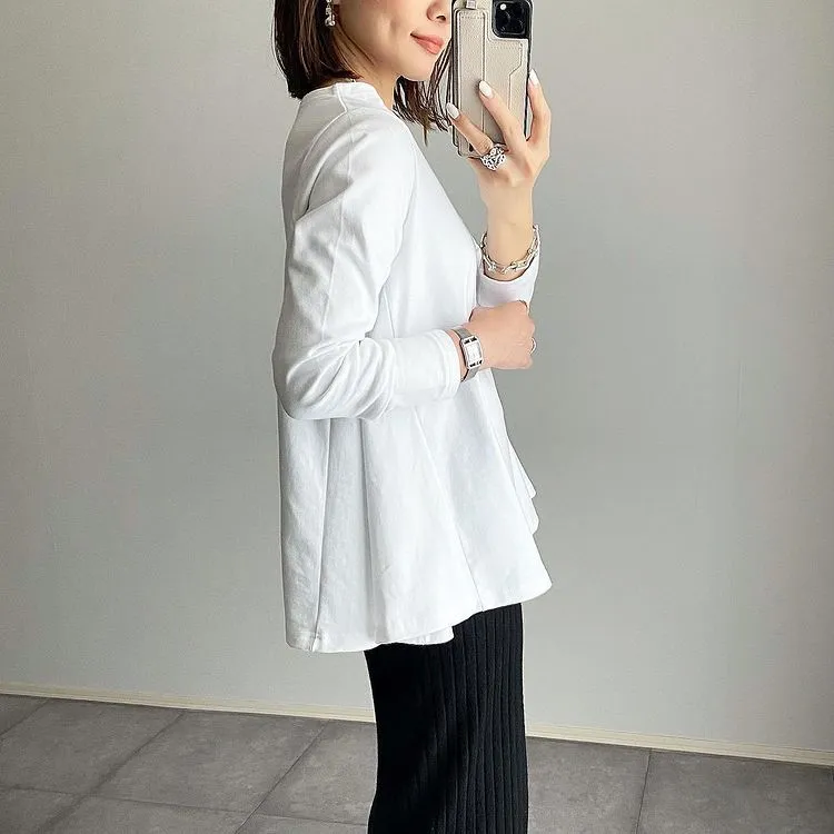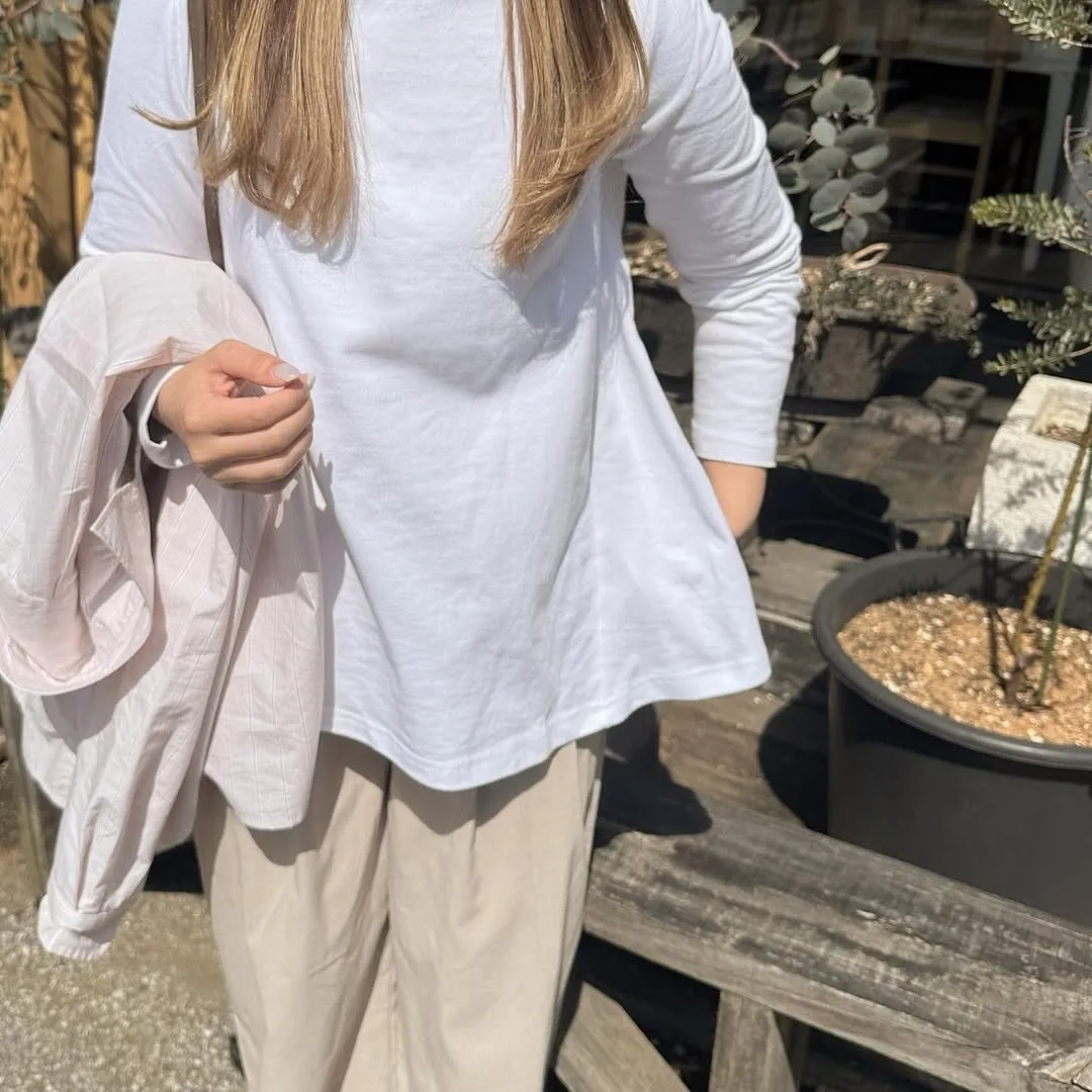嘟嘟好版型小幫推薦款夏天賣過短袖款喔~爆炸好評沒想到~專櫃發售秋冬款了~太棒了!!一件很簡單又不簡單的白TEE!真的很推薦這款喔很不簡單的一件白TEE喔版型立體剪裁~穿起來弧度很美非常好看可以單穿就有特色~~很多日妞披毛衣~好看!!整體的下襬弧度很美面料很挺!可以單穿