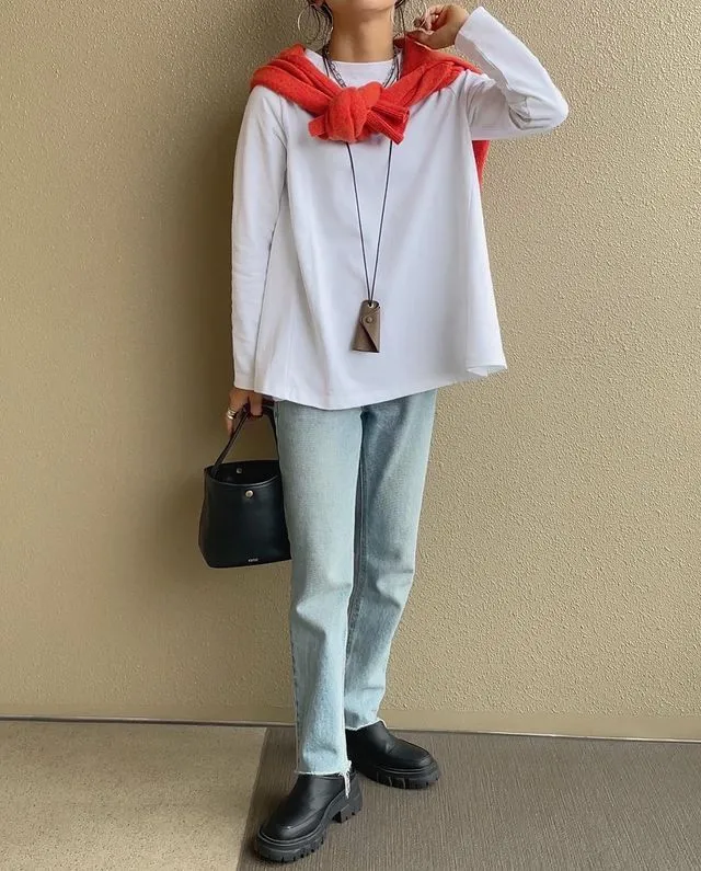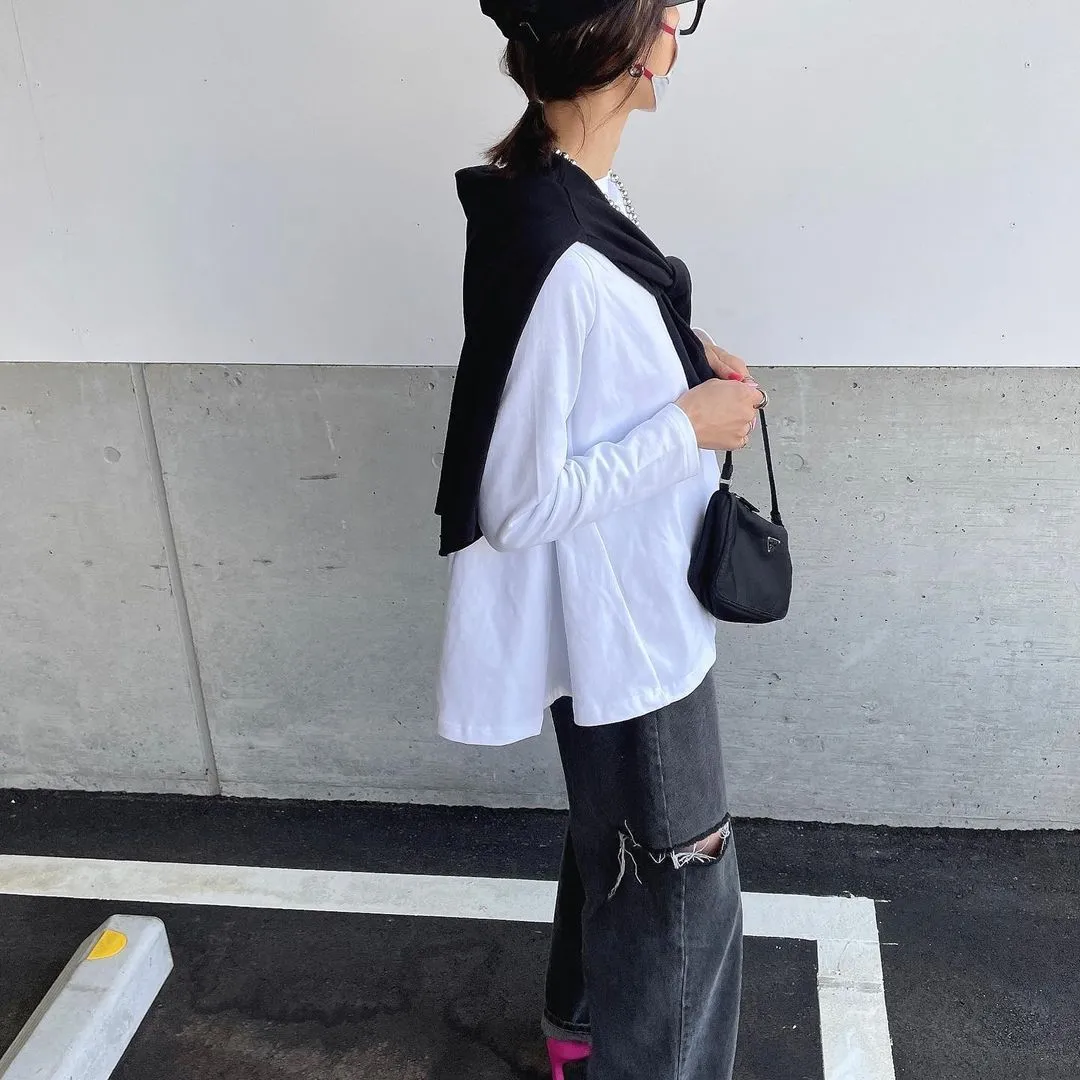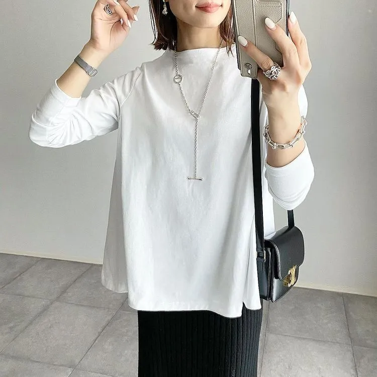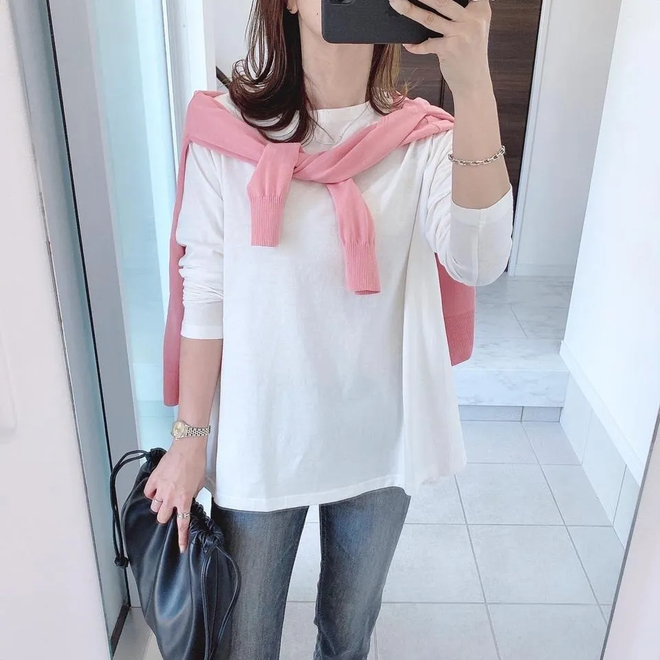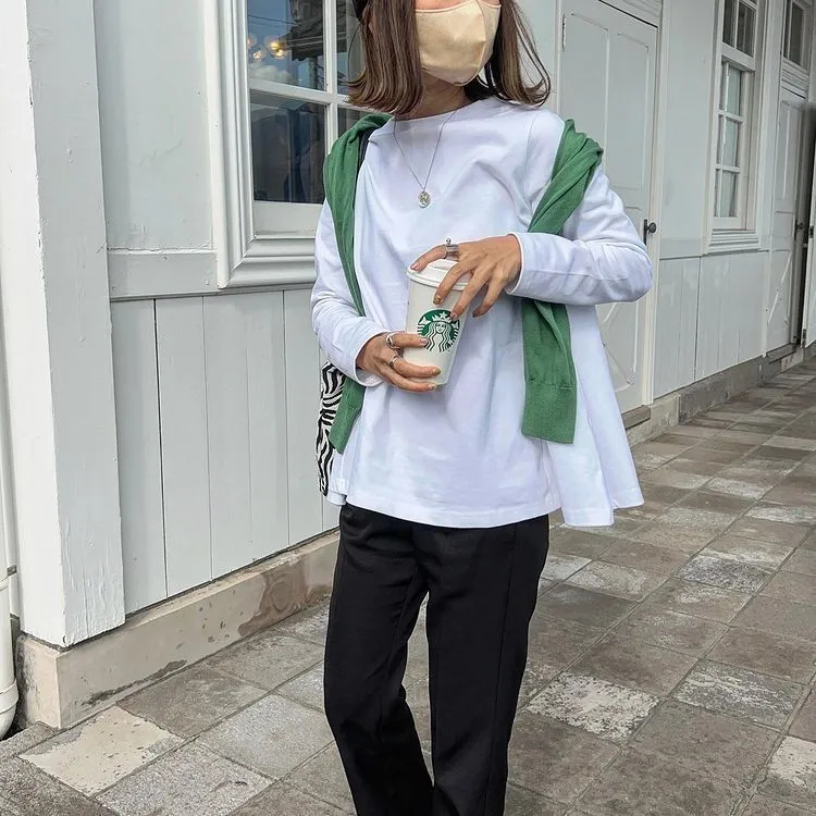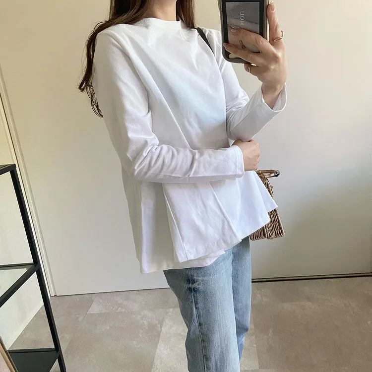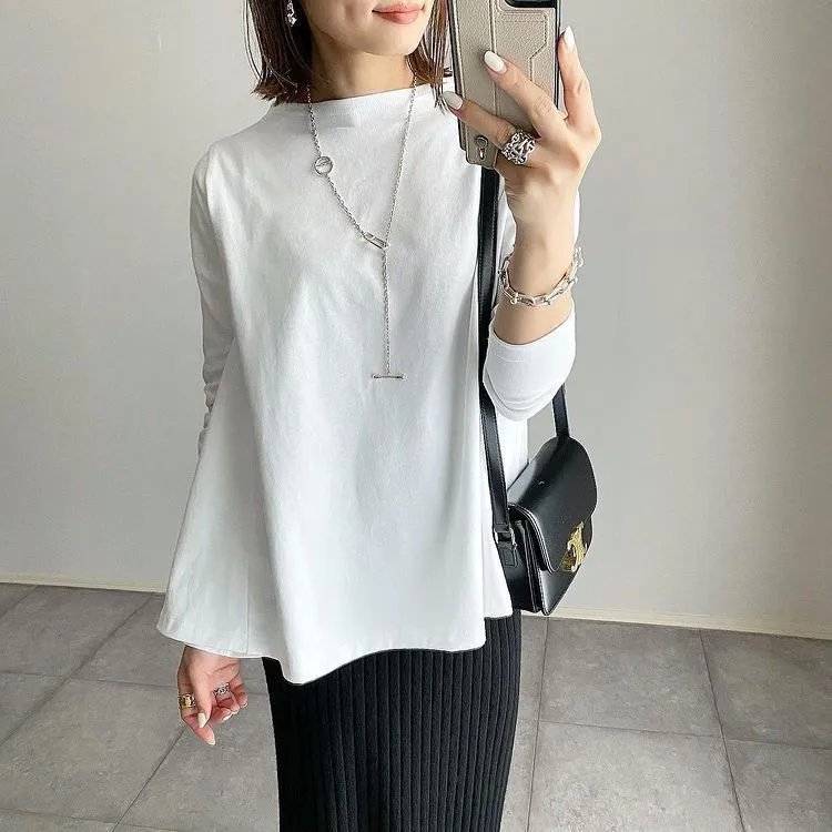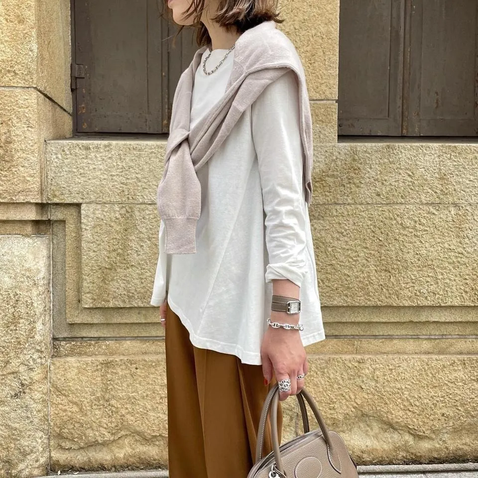 嘟嘟好版型小幫推薦款夏天賣過短袖款喔~爆炸好評沒想到~專櫃發售秋冬款了~太棒了!!一件很簡單又不簡單的白TEE!真的很推薦這款喔很不簡單的一件白TEE喔版型立體剪裁~穿起來弧度很美非常好看可以單穿就有特色~~很多日妞披毛衣~好看!!整體的下襬弧度很美面料很挺!可以單穿