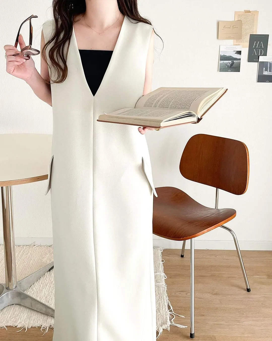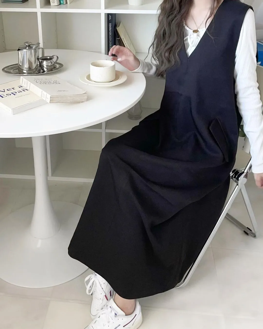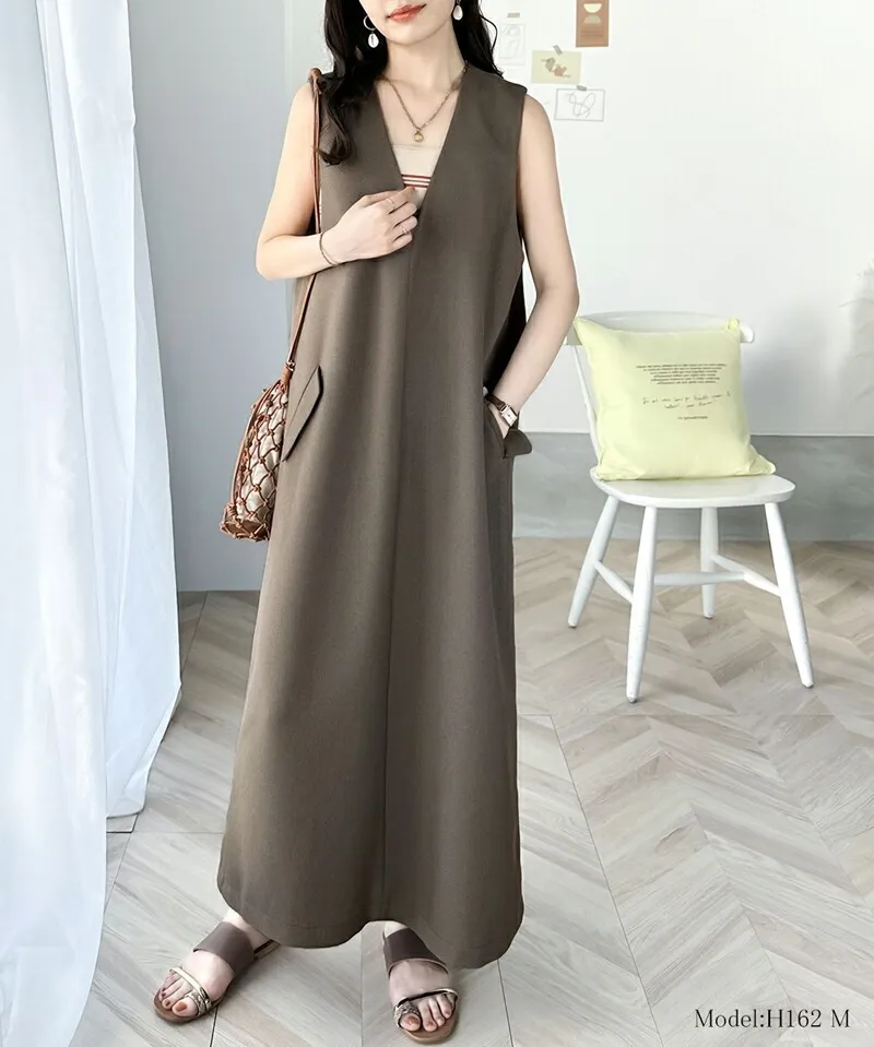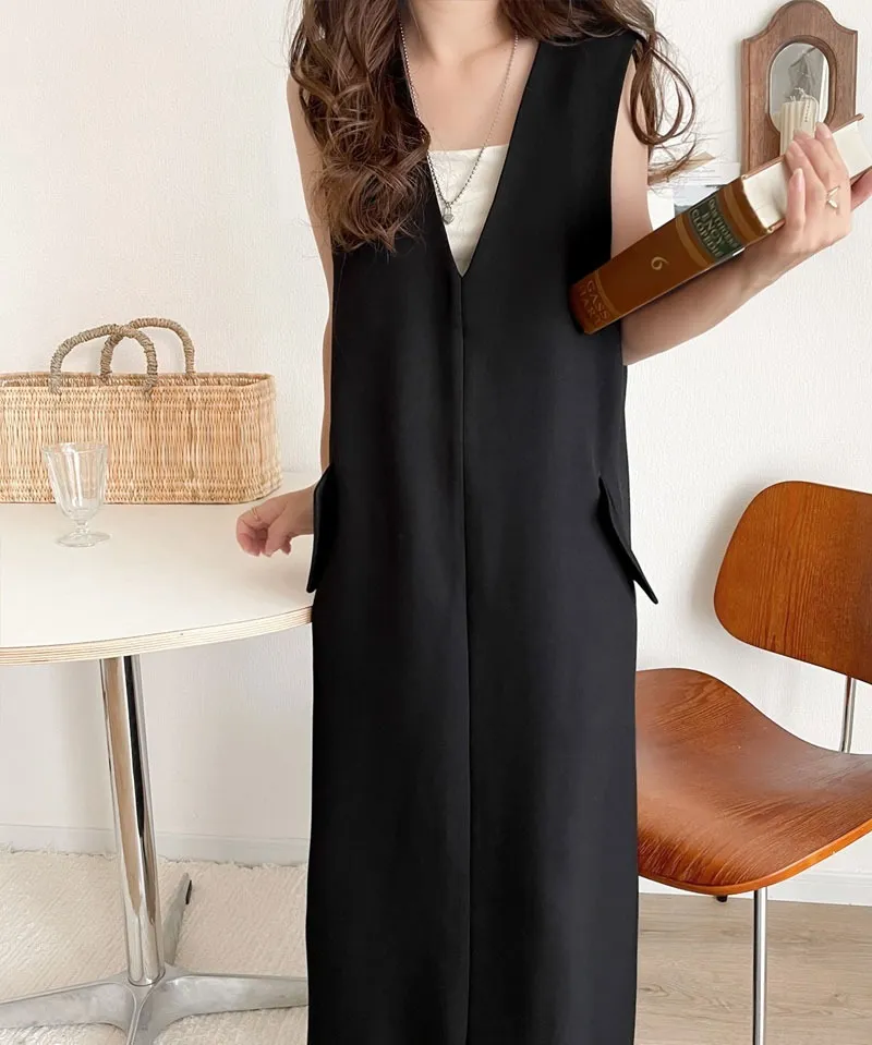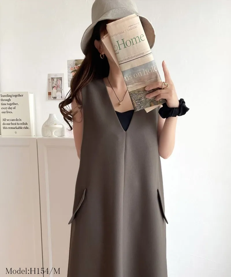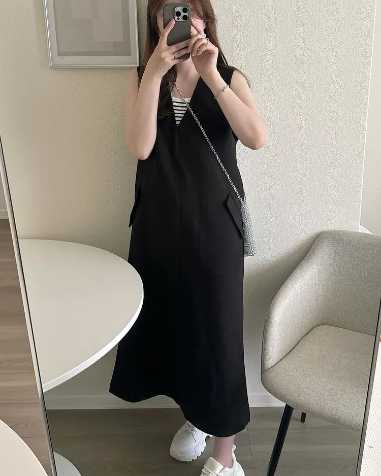 這款連身裙設計簡單,但前面飾有 V 領和帶蓋口袋。