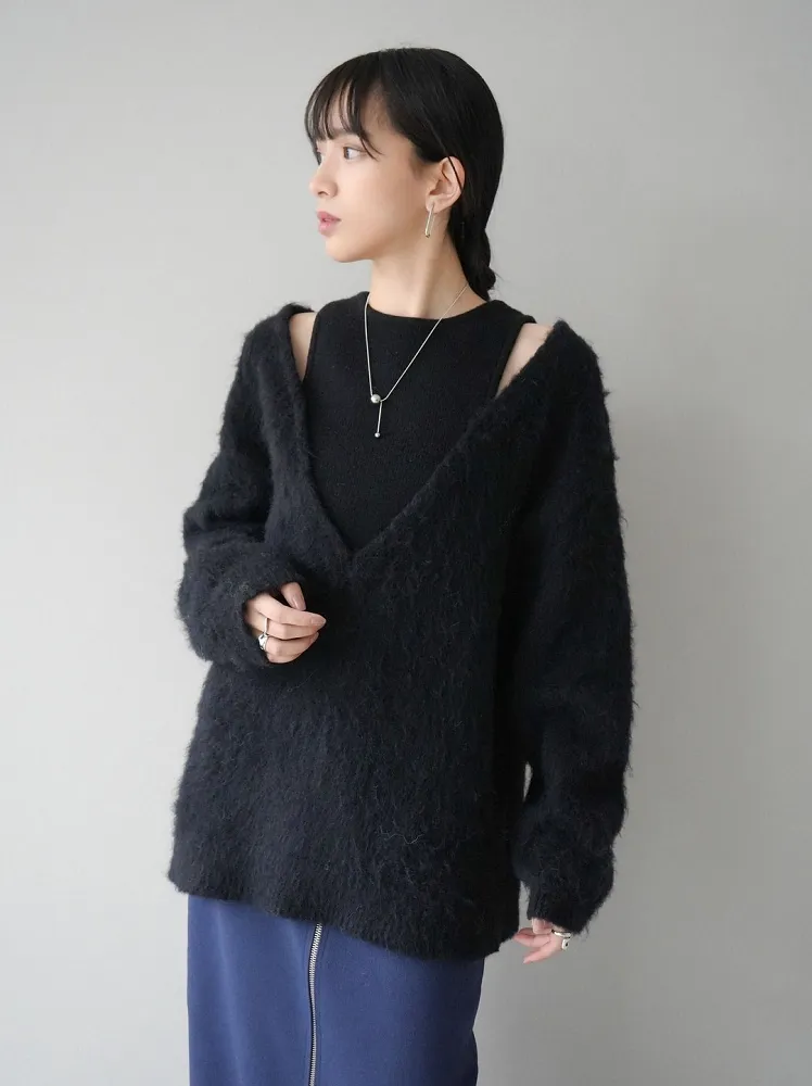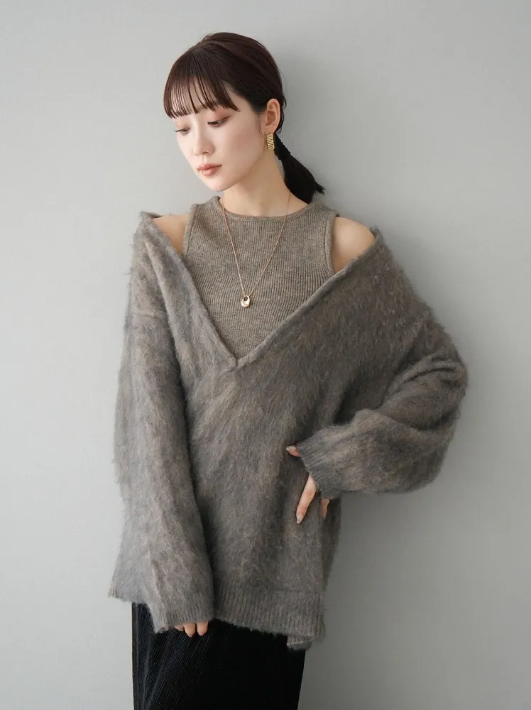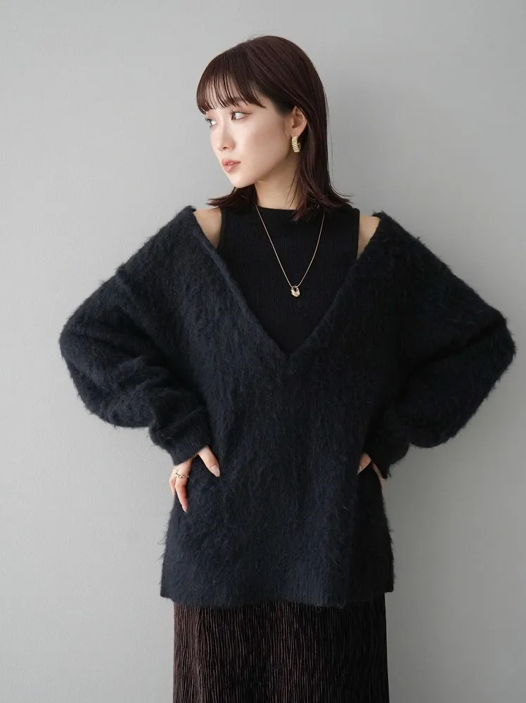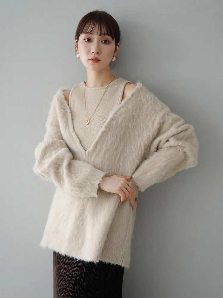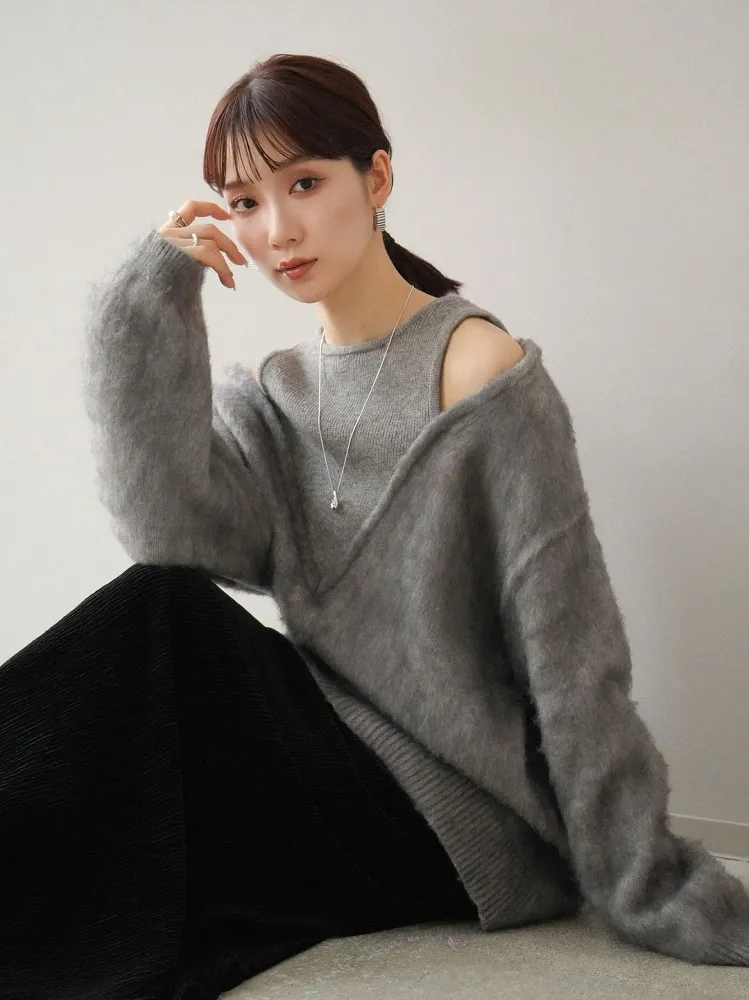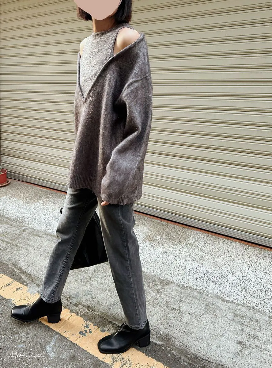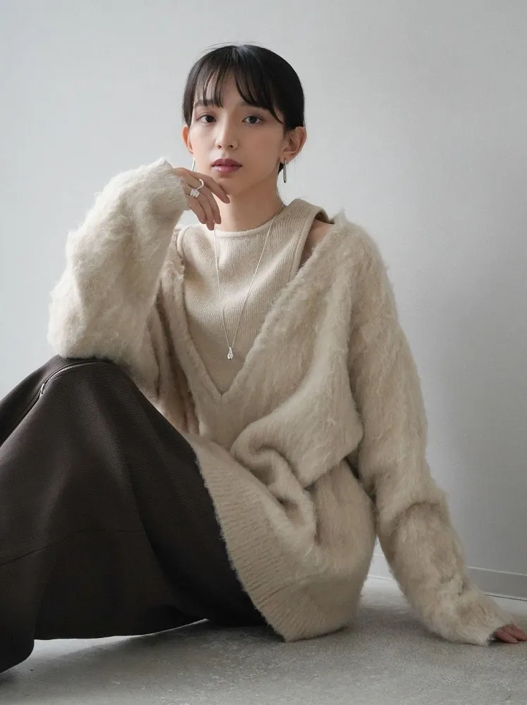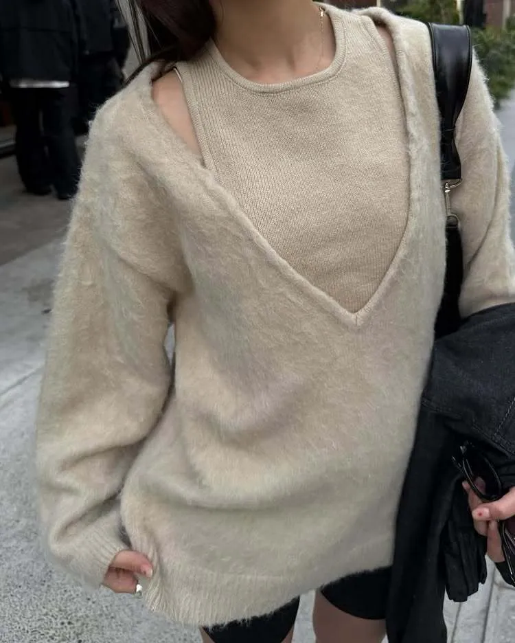 背心處是彈性螺紋針織~外拼接毛海毛衣