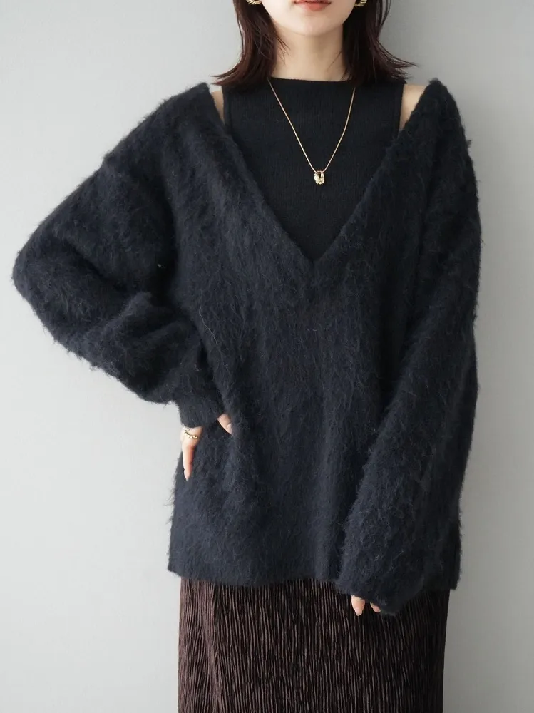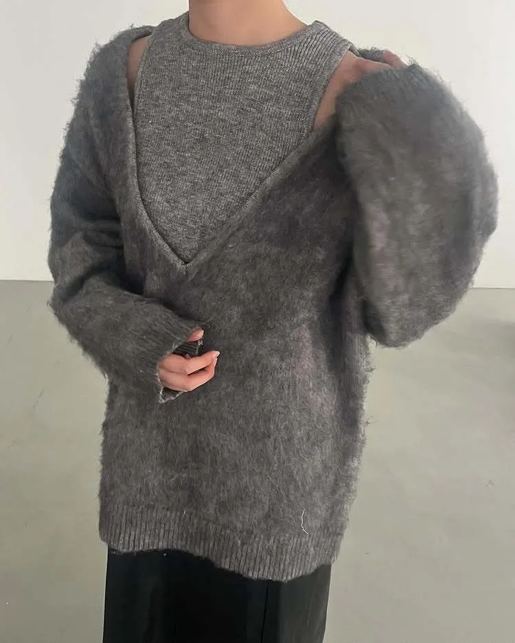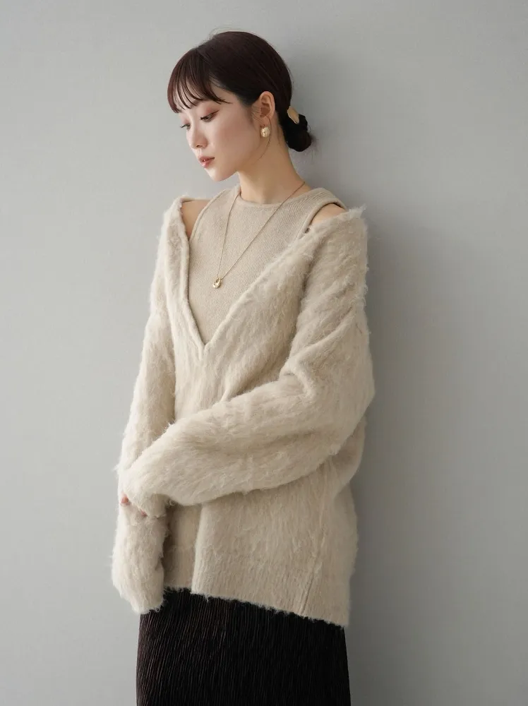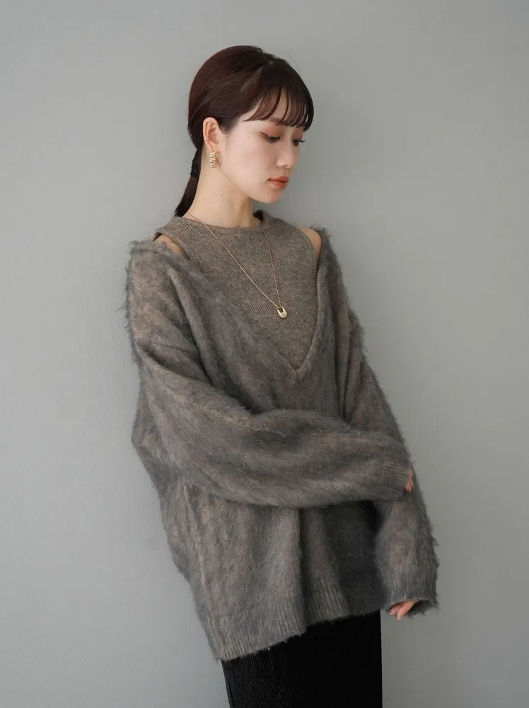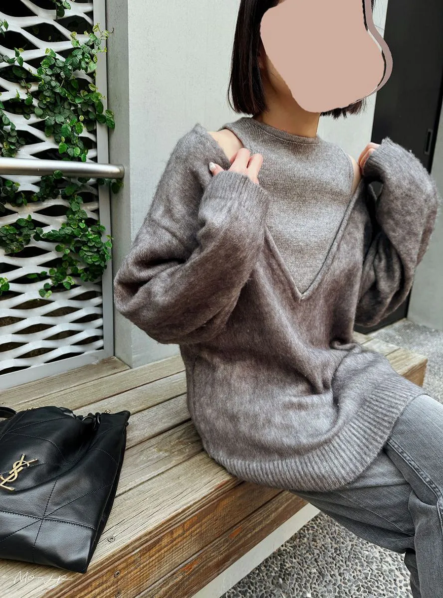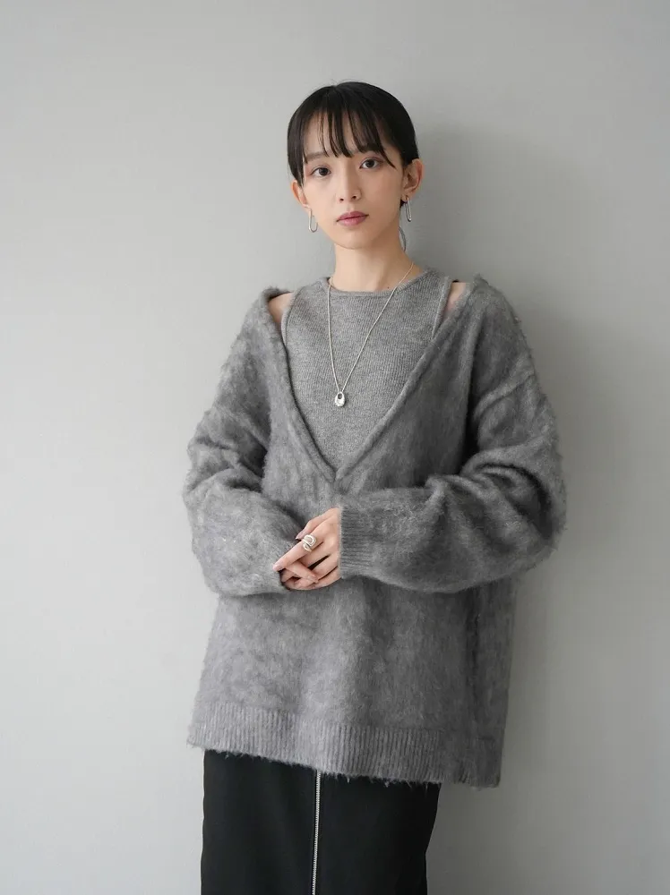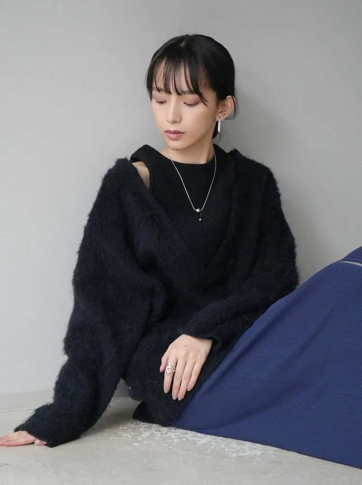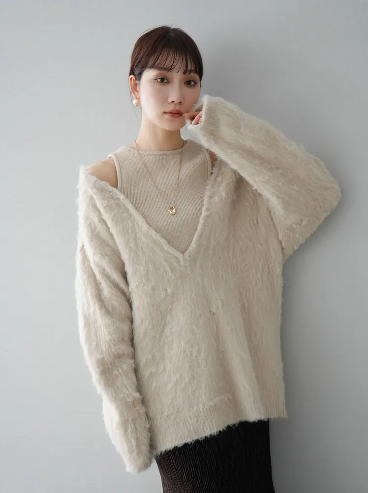 背心處是彈性螺紋針織~外拼接毛海毛衣