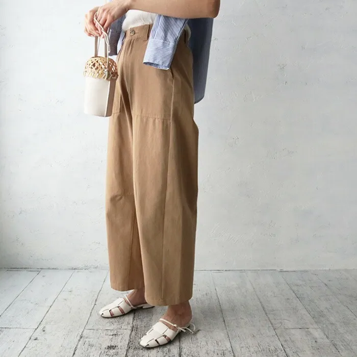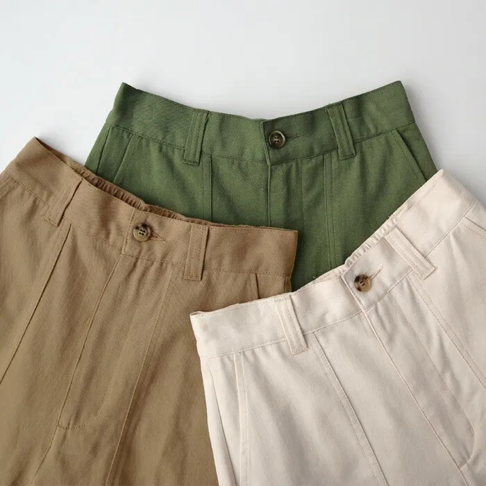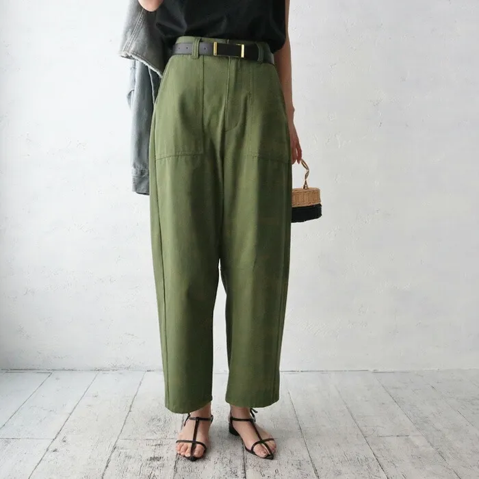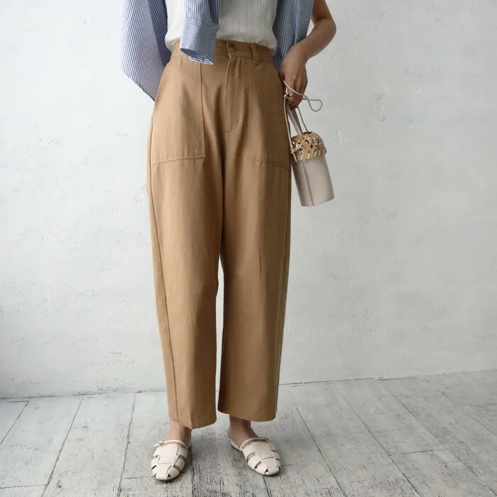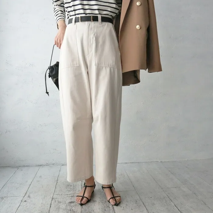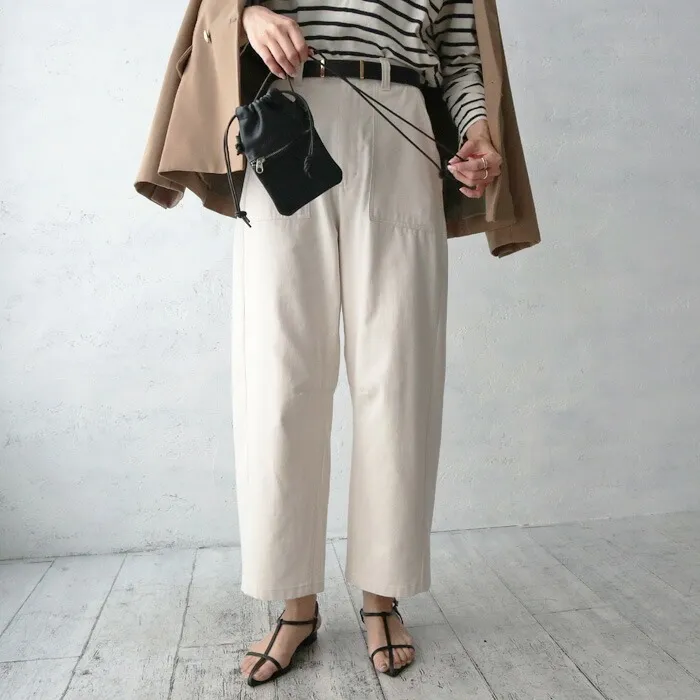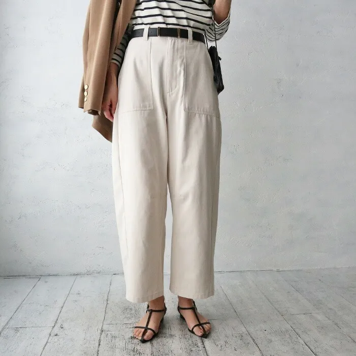 高腰繭型立體弧型剪裁挺版工作褲 這一兩季大人氣的立體弧形繭型設計的剪裁外縫口袋造型的挺版純棉工作褲高腰剪裁修飾身形拉長腿部線條工裝風大口袋設計經典基本百搭三色選擇奶油米/卡其/軍綠100%卡其棉材質搭配條紋T簡單舒服文青風格