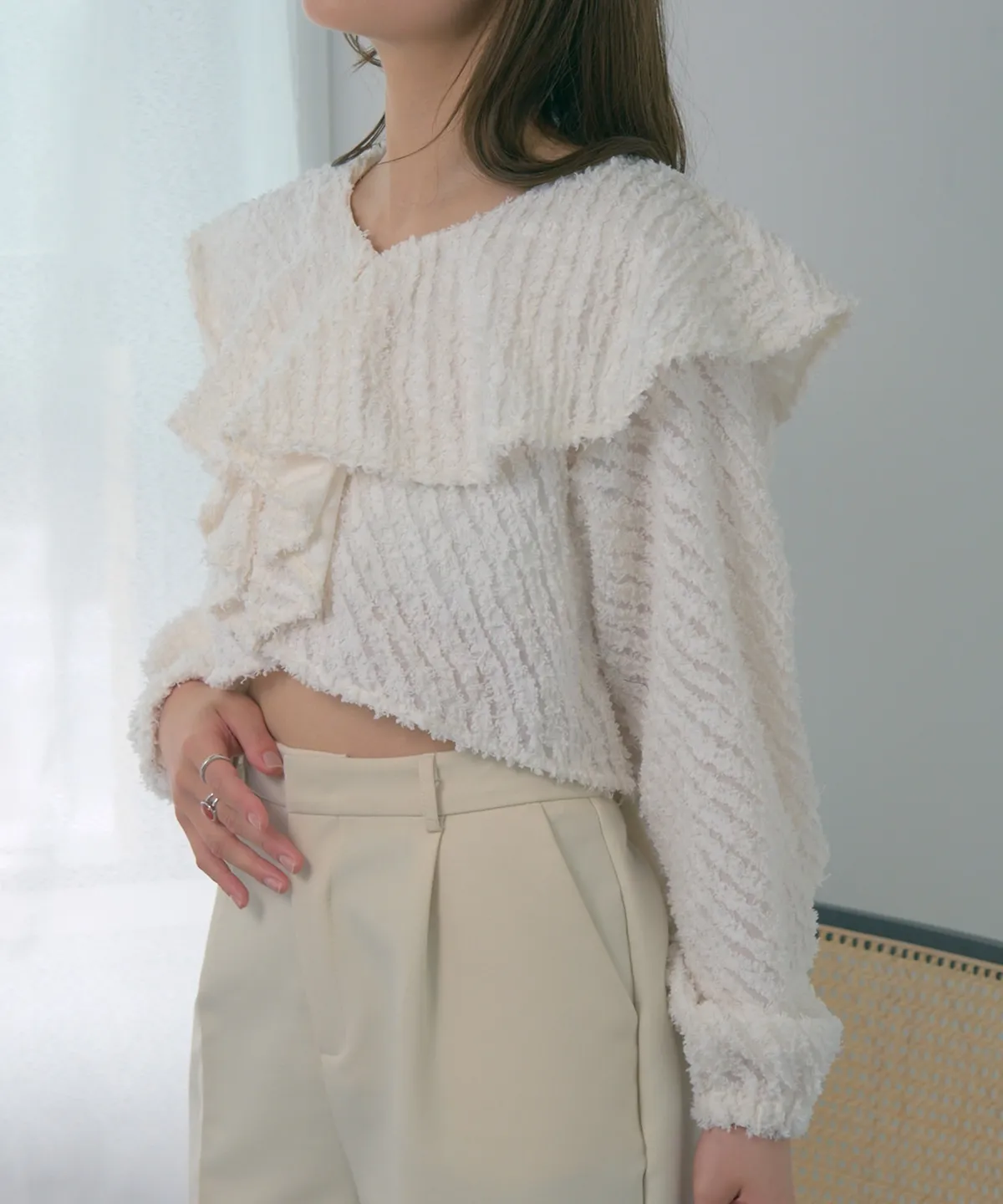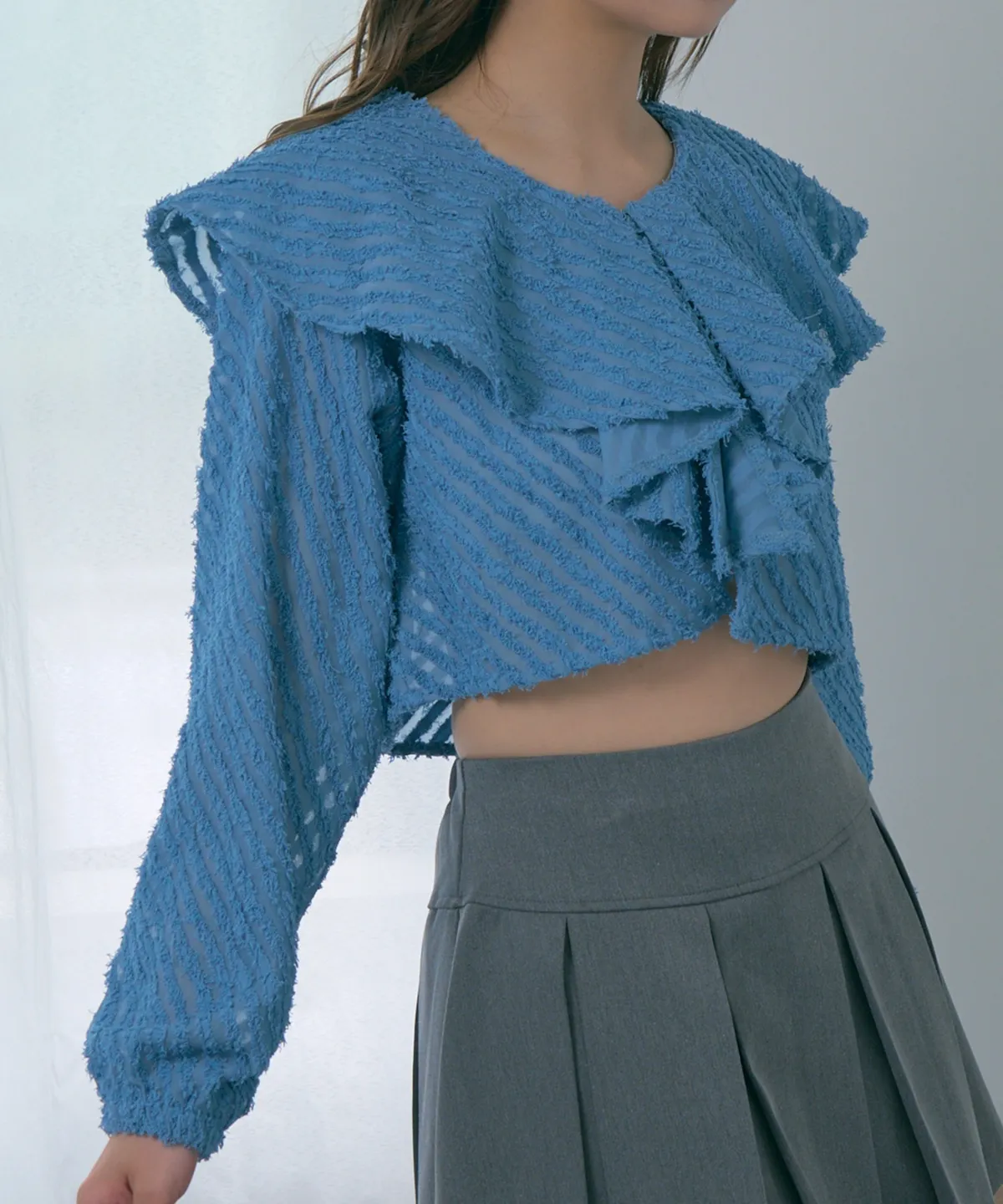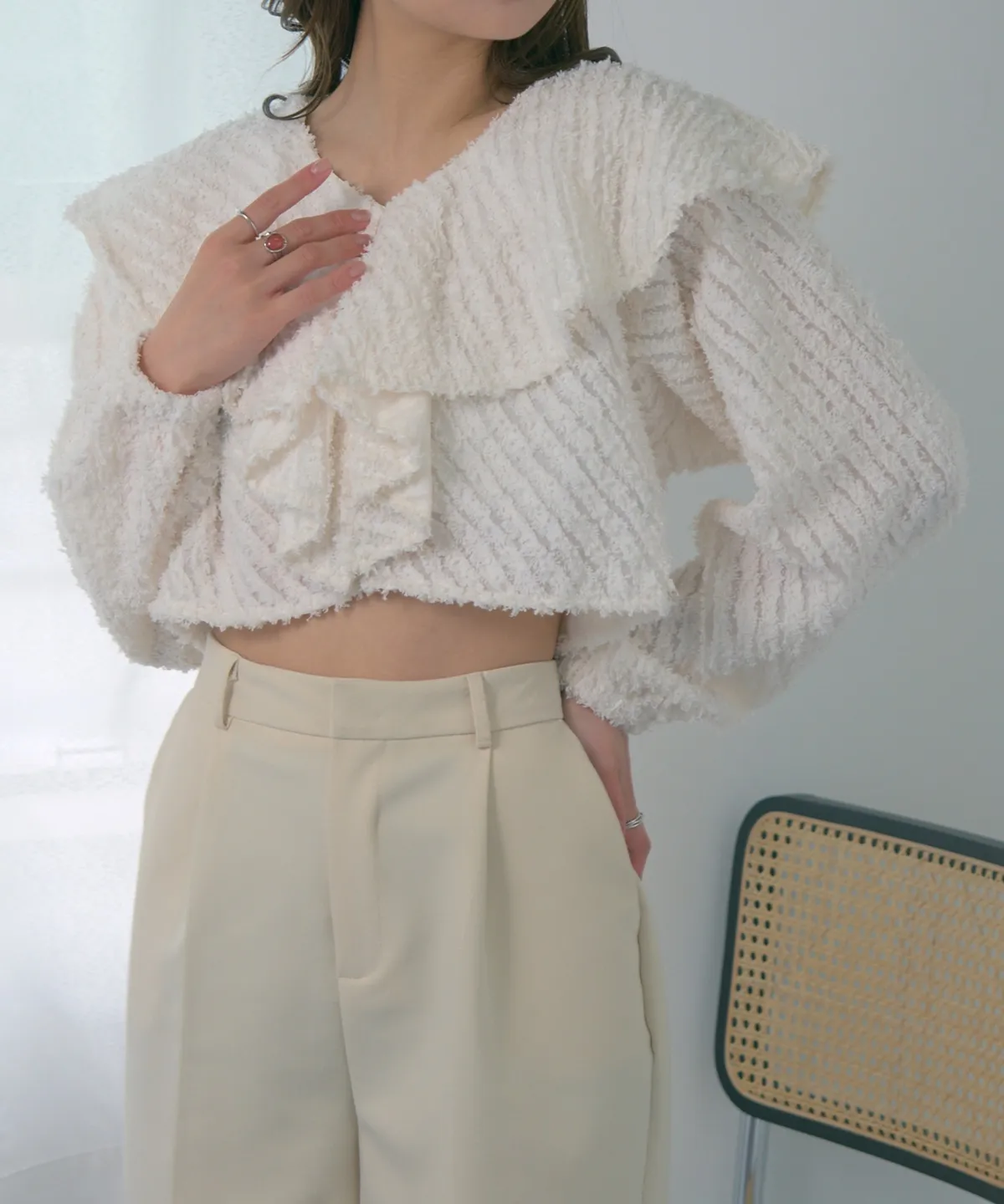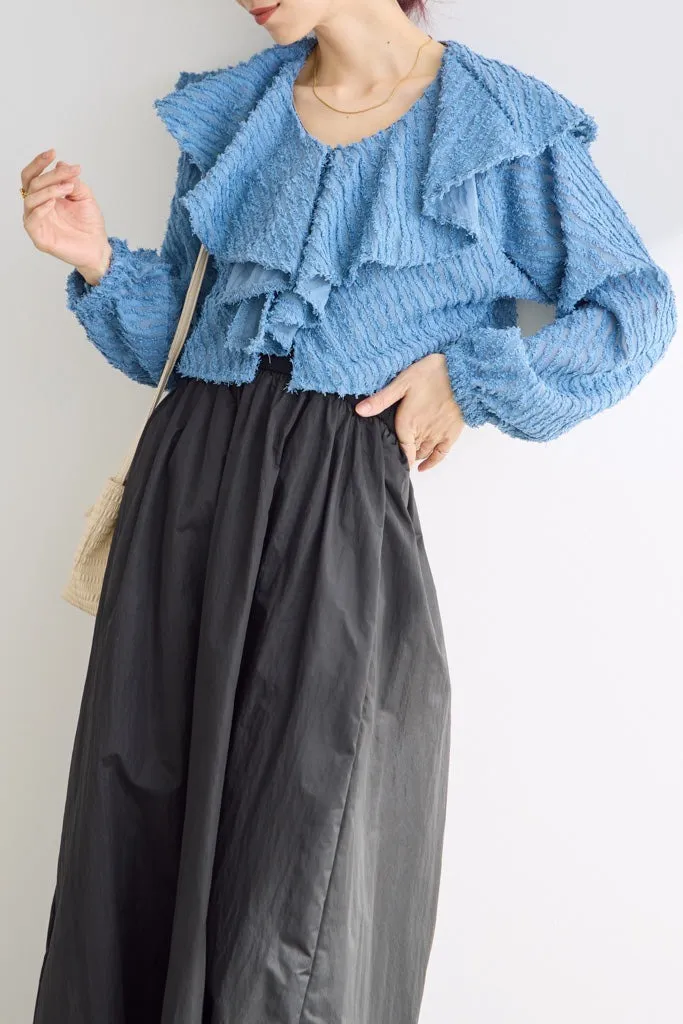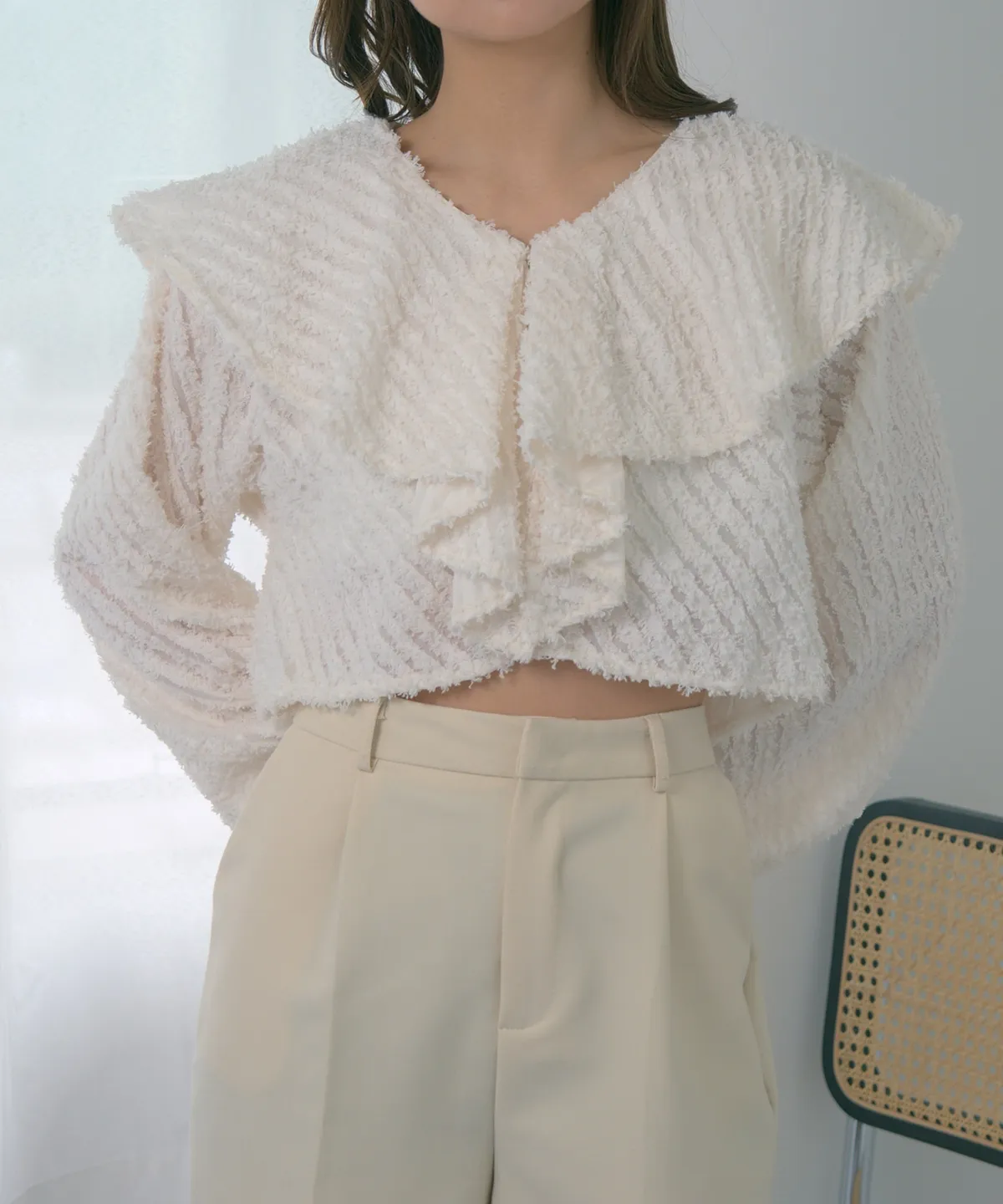HAPPY PRICE細緻立體感的雪紡材質這款上衣最大亮點就是前胸與肩膀的大面積荷葉領設計,營造出柔和浪漫氣息、富有層次的輪廓線條。袖口做了微澎收束設計,讓整體更加可愛。 短版剪裁設計搭配高腰長裙或是牛仔褲結合整體成完美必例同款材質也有長裙可以成套搭配 3色