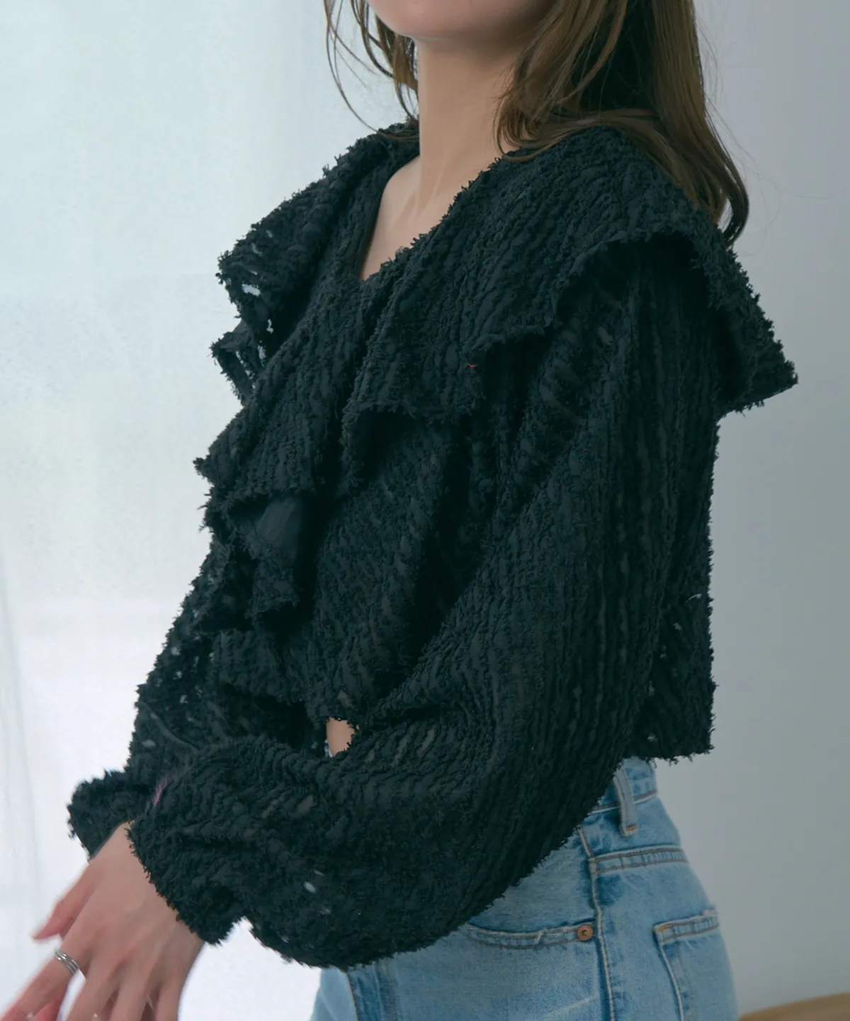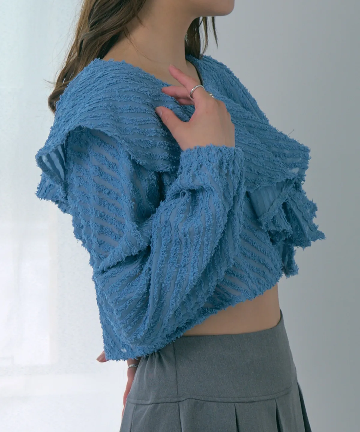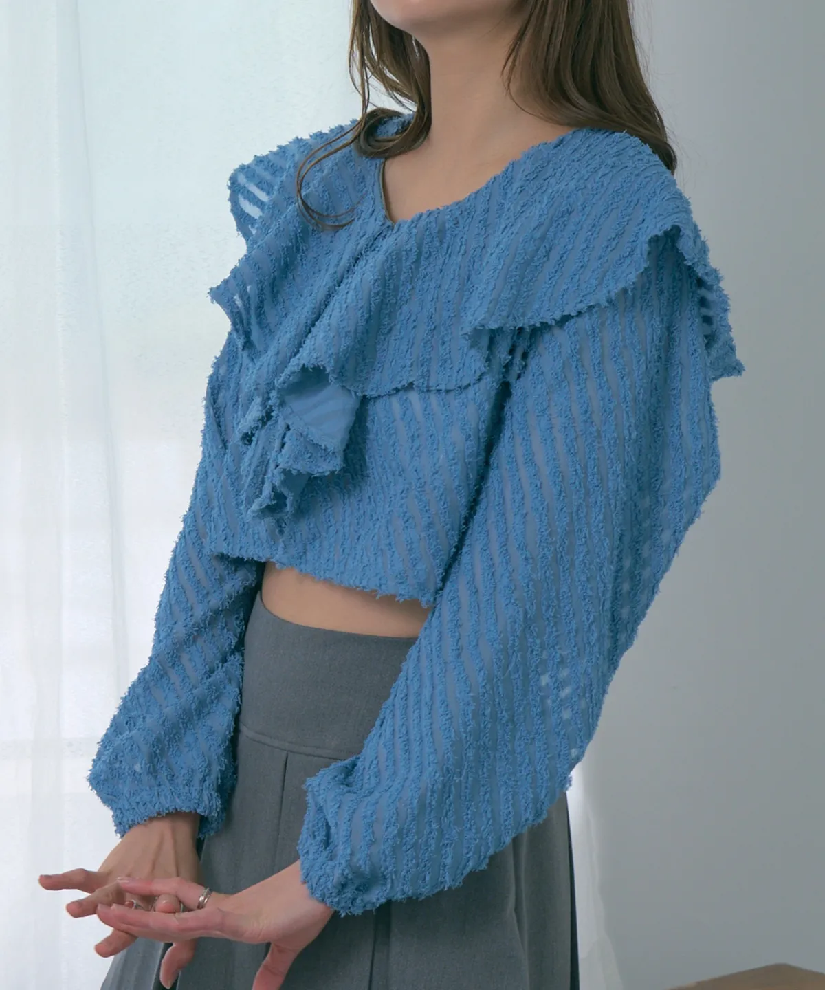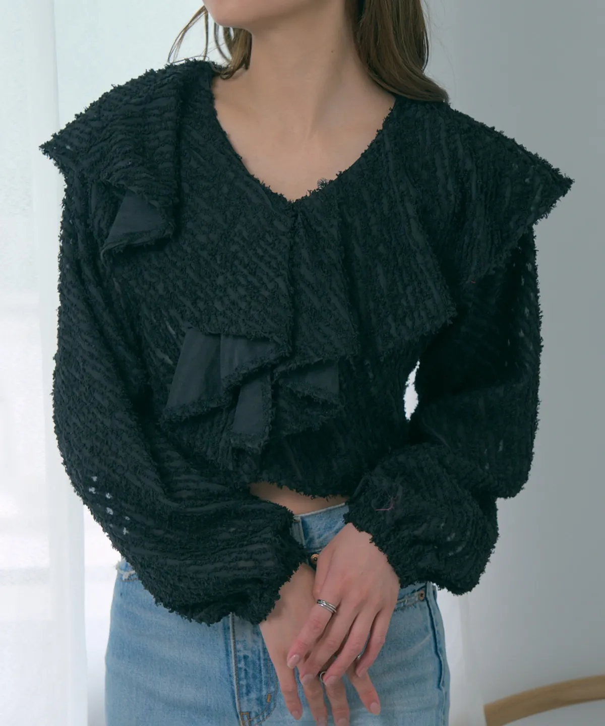HAPPY PRICE細緻立體感的雪紡材質這款上衣最大亮點就是前胸與肩膀的大面積荷葉領設計,營造出柔和浪漫氣息、富有層次的輪廓線條。袖口做了微澎收束設計,讓整體更加可愛。 短版剪裁設計搭配高腰長裙或是牛仔褲結合整體成完美必例同款材質也有長裙可以成套搭配 3色