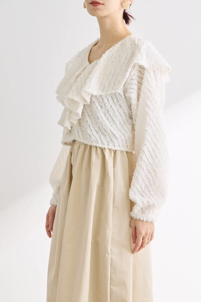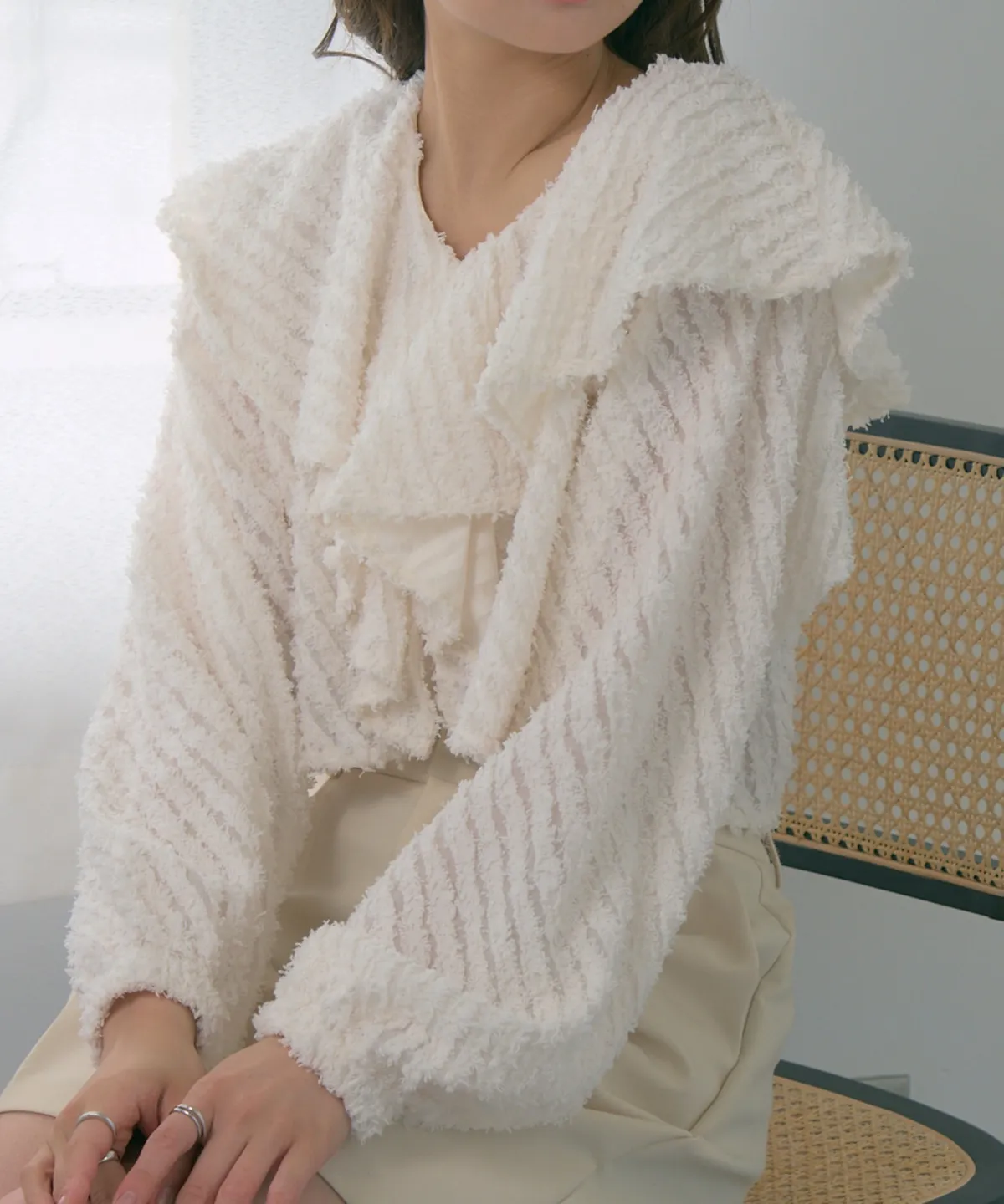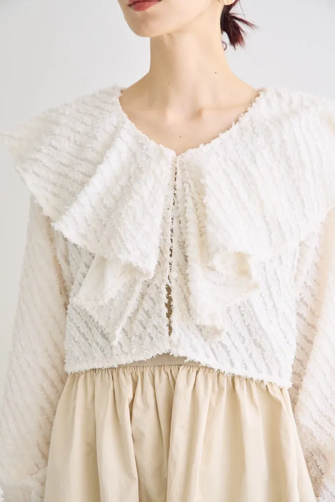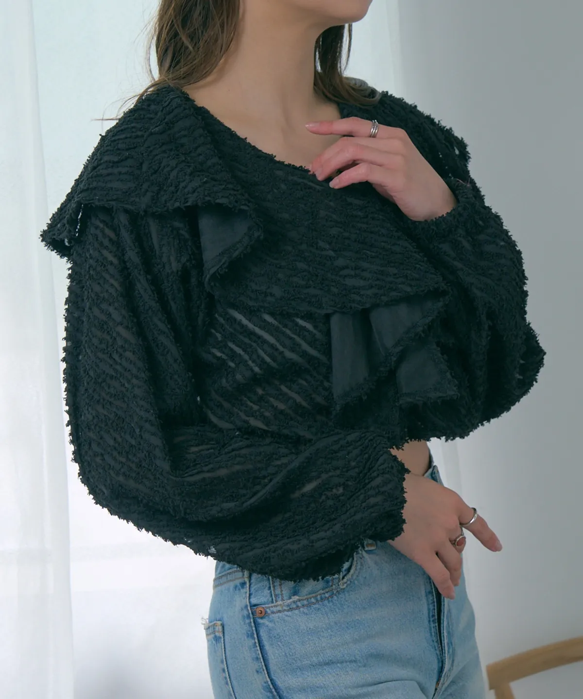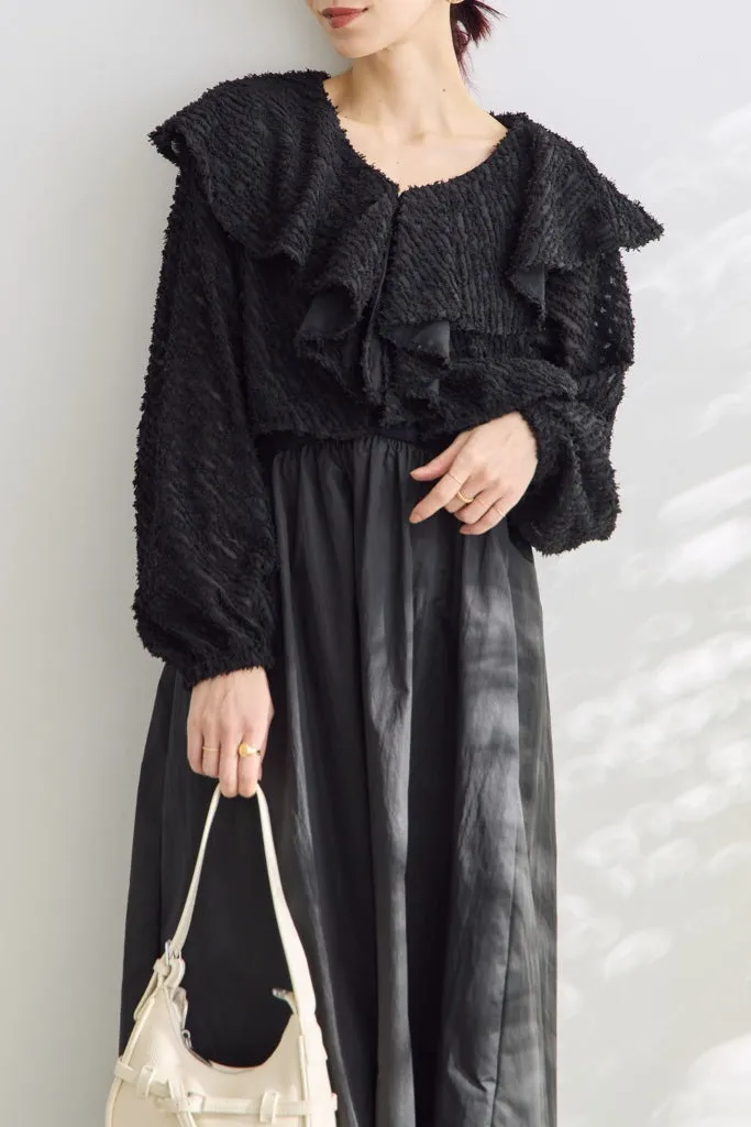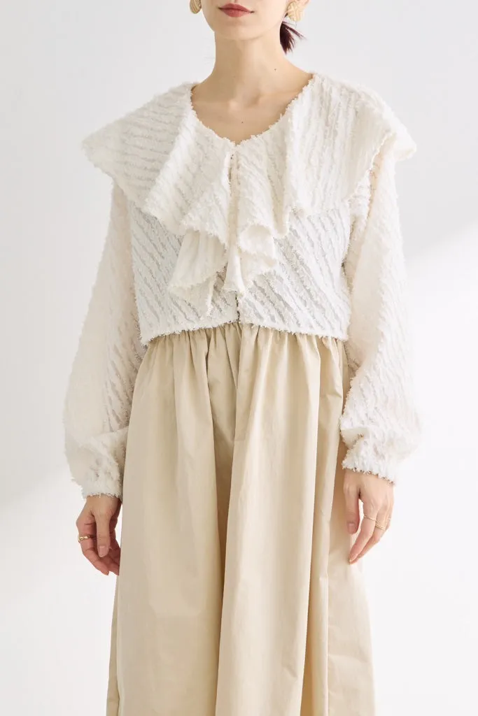 HAPPY PRICE細緻立體感的雪紡材質這款上衣最大亮點就是前胸與肩膀的大面積荷葉領設計,營造出柔和浪漫氣息、富有層次的輪廓線條。袖口做了微澎收束設計,讓整體更加可愛。 短版剪裁設計搭配高腰長裙或是牛仔褲結合整體成完美必例同款材質也有長裙可以成套搭配 3色