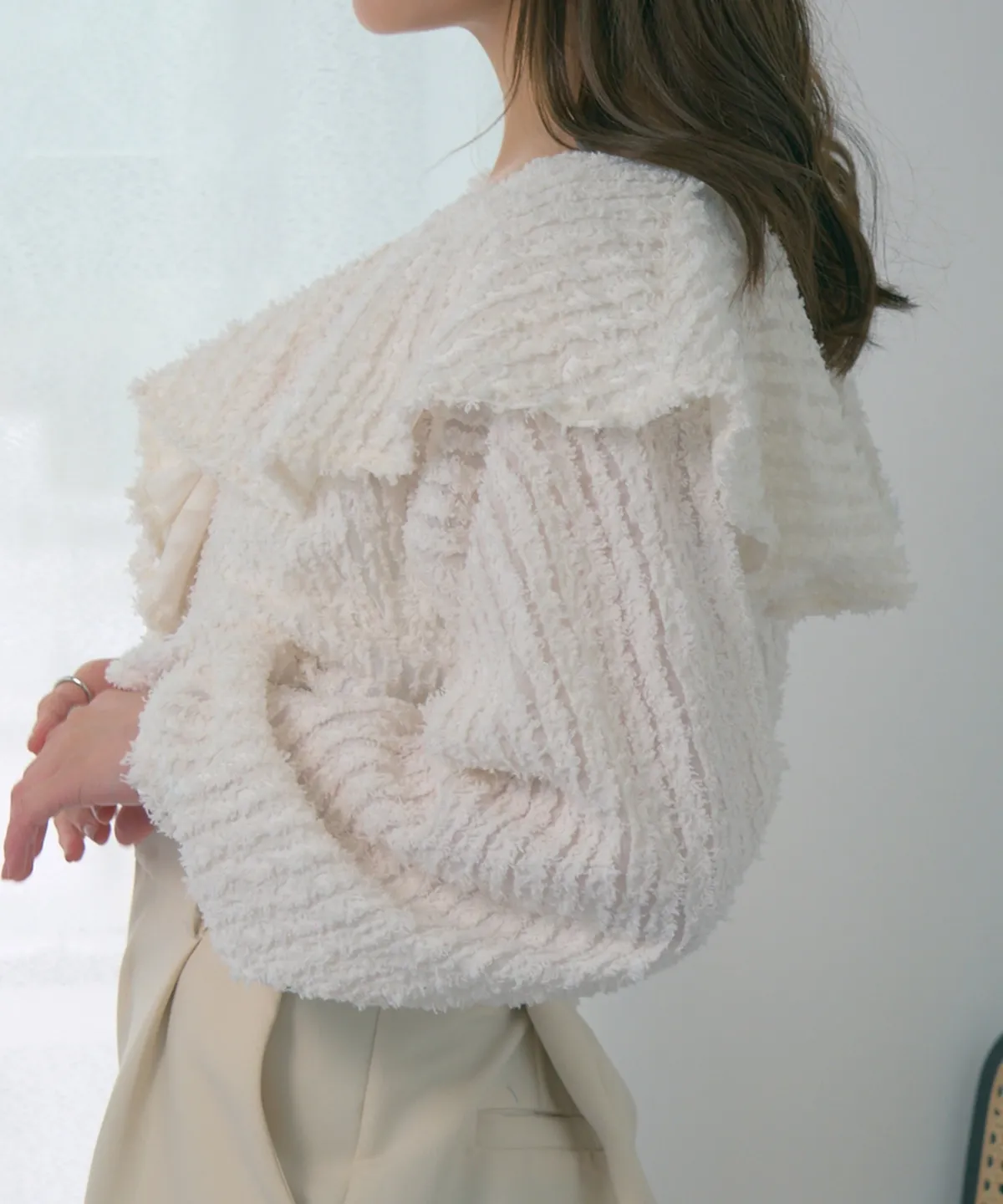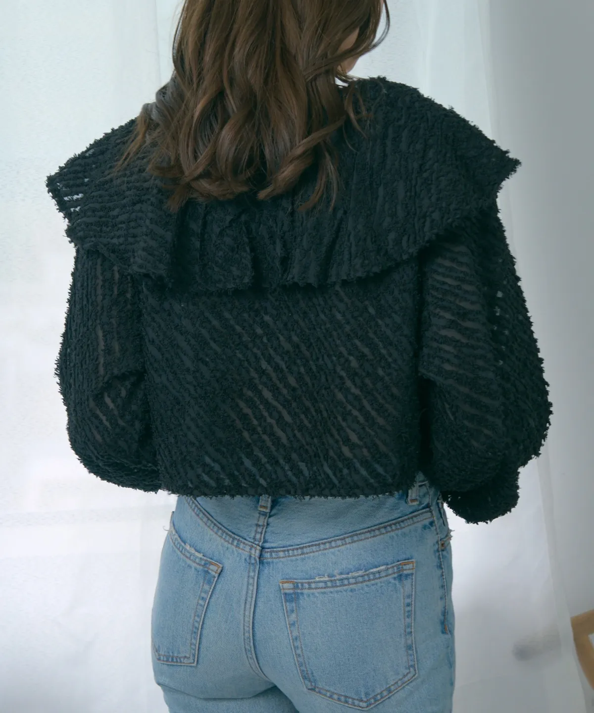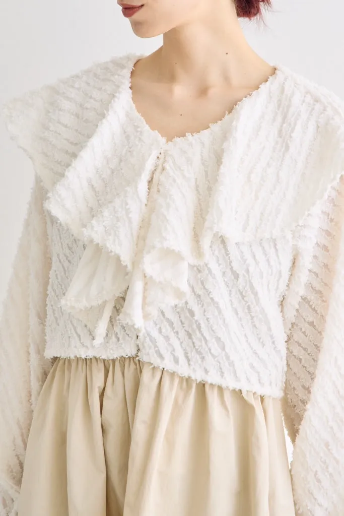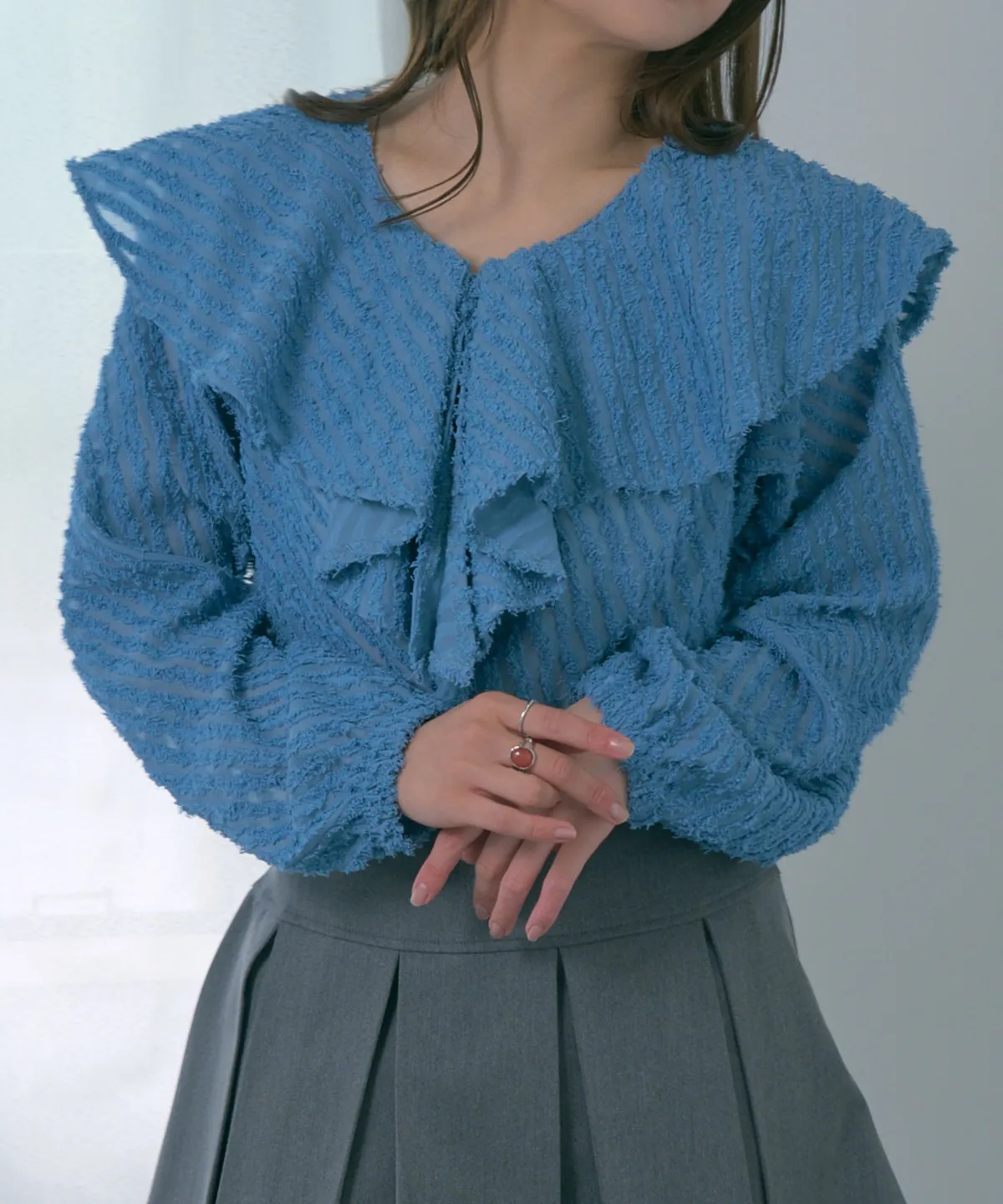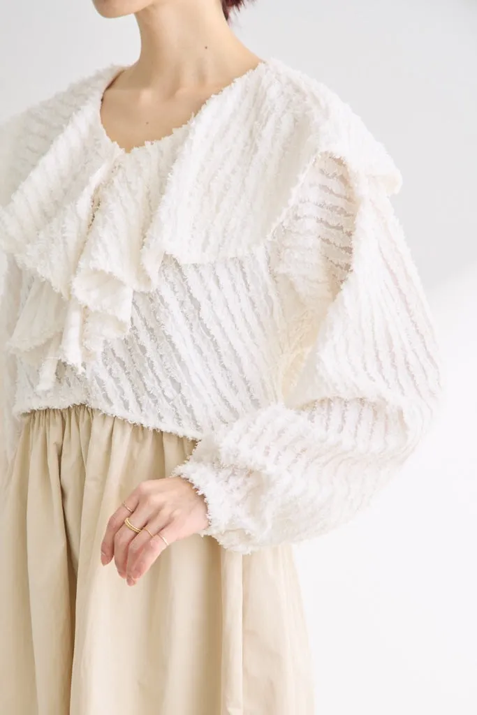 HAPPY PRICE細緻立體感的雪紡材質這款上衣最大亮點就是前胸與肩膀的大面積荷葉領設計,營造出柔和浪漫氣息、富有層次的輪廓線條。袖口做了微澎收束設計,讓整體更加可愛。 短版剪裁設計搭配高腰長裙或是牛仔褲結合整體成完美必例同款材質也有長裙可以成套搭配 3色