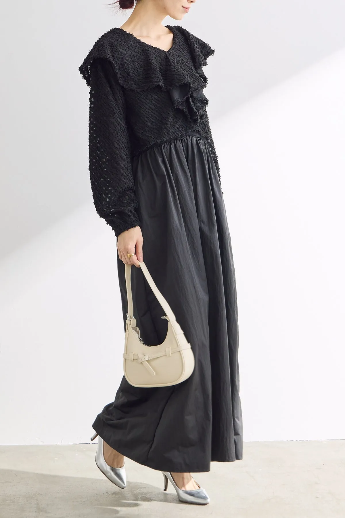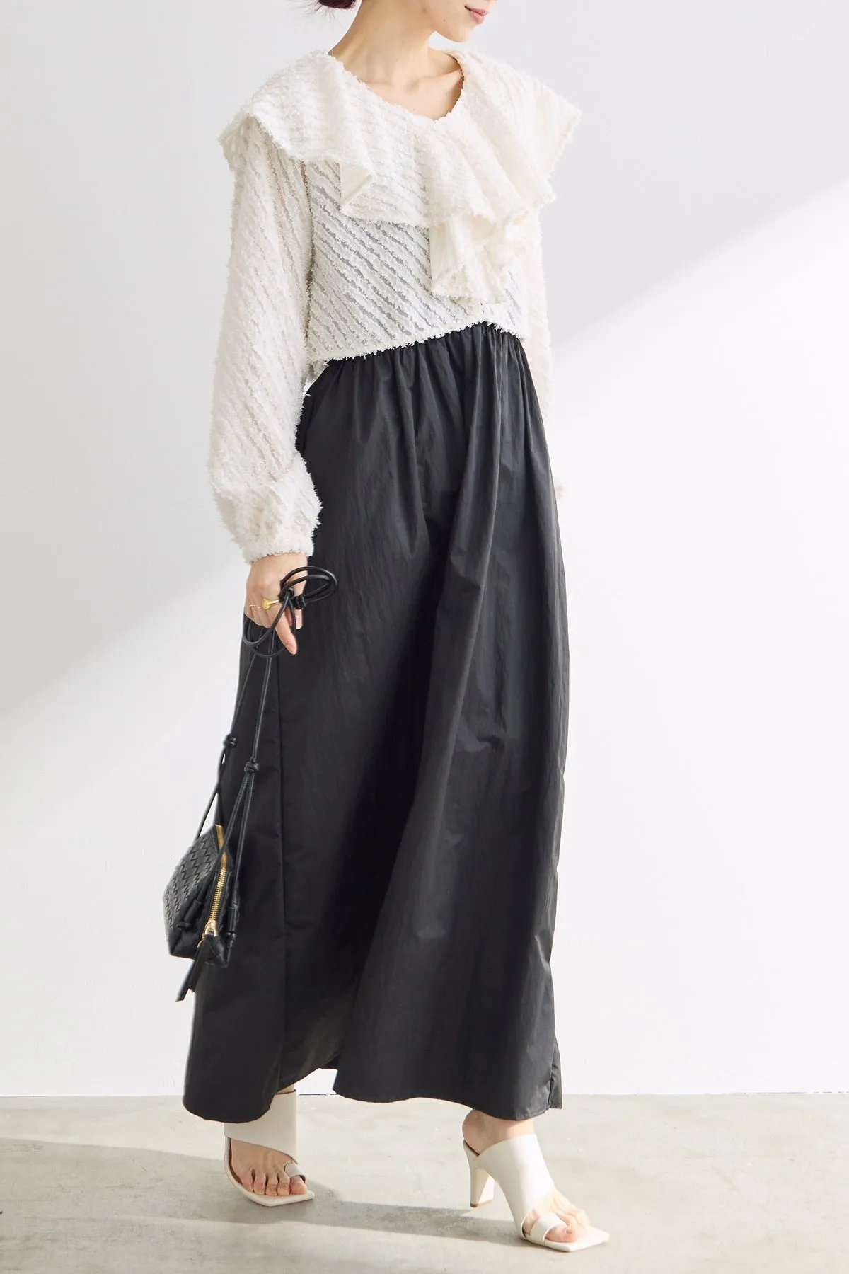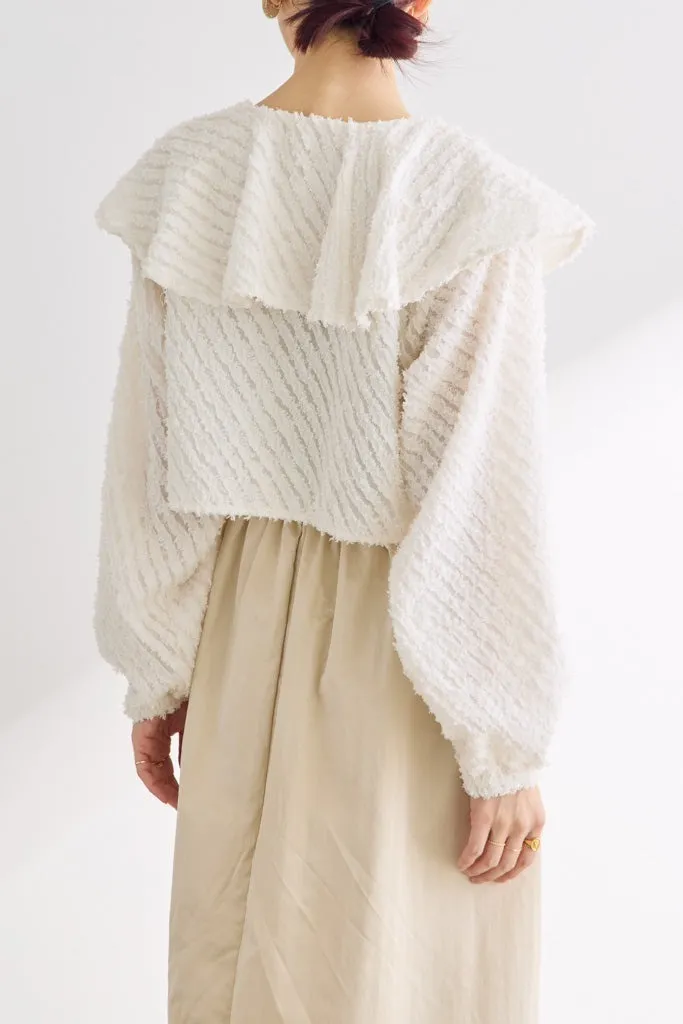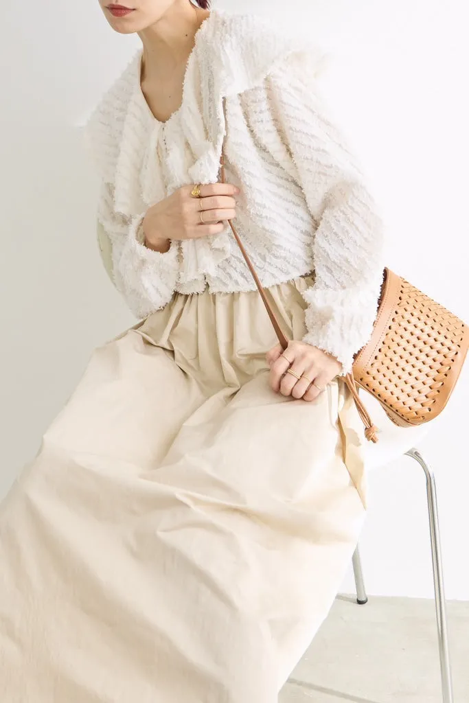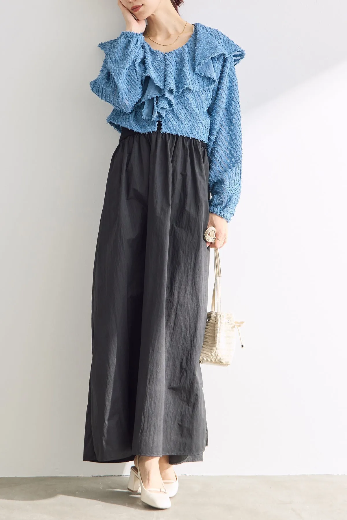 HAPPY PRICE細緻立體感的雪紡材質這款上衣最大亮點就是前胸與肩膀的大面積荷葉領設計,營造出柔和浪漫氣息、富有層次的輪廓線條。袖口做了微澎收束設計,讓整體更加可愛。 短版剪裁設計搭配高腰長裙或是牛仔褲結合整體成完美必例同款材質也有長裙可以成套搭配 3色