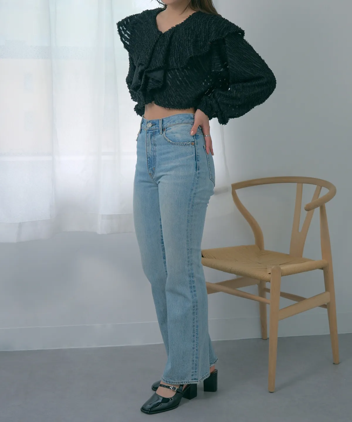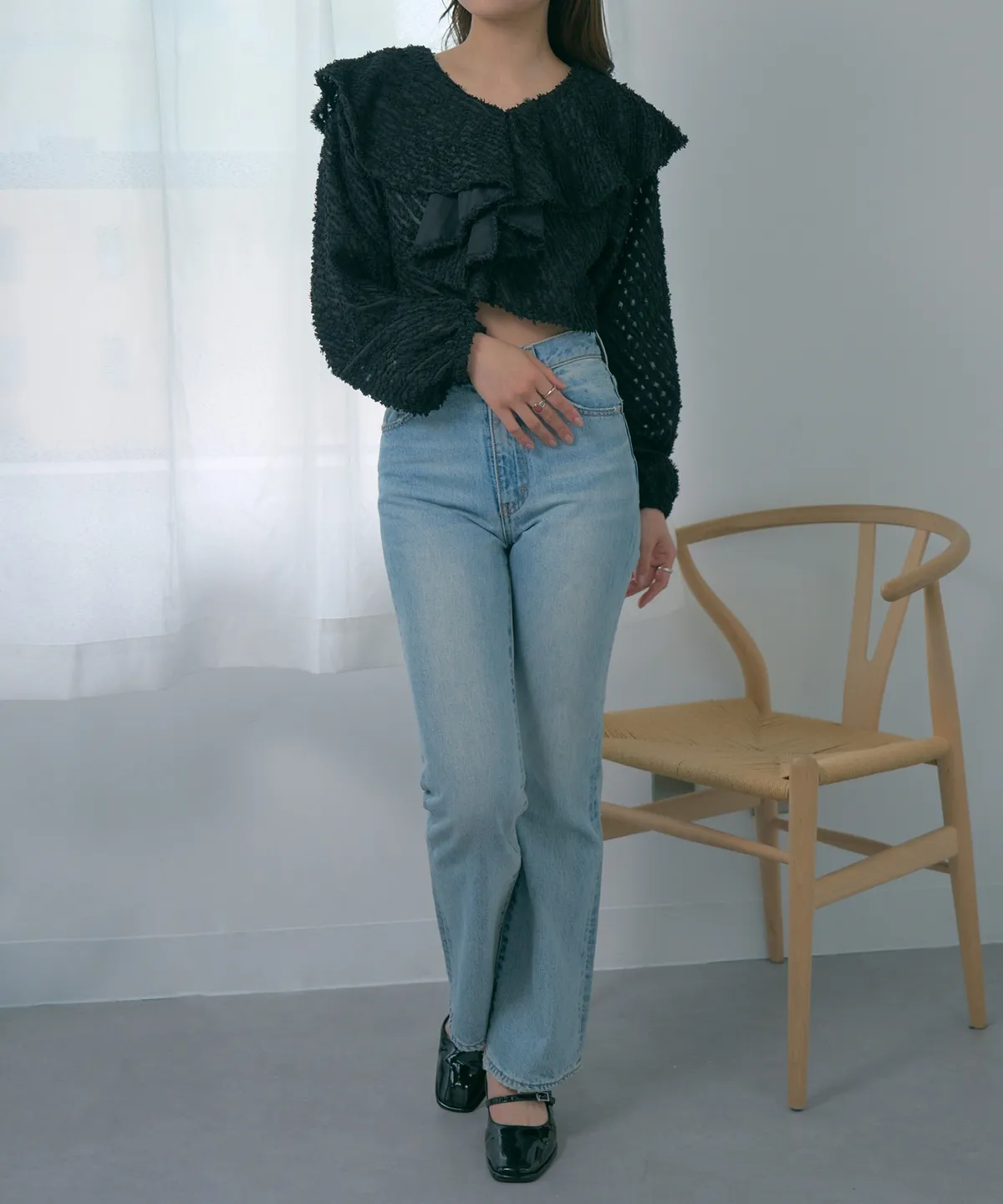 HAPPY PRICE細緻立體感的雪紡材質這款上衣最大亮點就是前胸與肩膀的大面積荷葉領設計,營造出柔和浪漫氣息、富有層次的輪廓線條。袖口做了微澎收束設計,讓整體更加可愛。 短版剪裁設計搭配高腰長裙或是牛仔褲結合整體成完美必例同款材質也有長裙可以成套搭配
