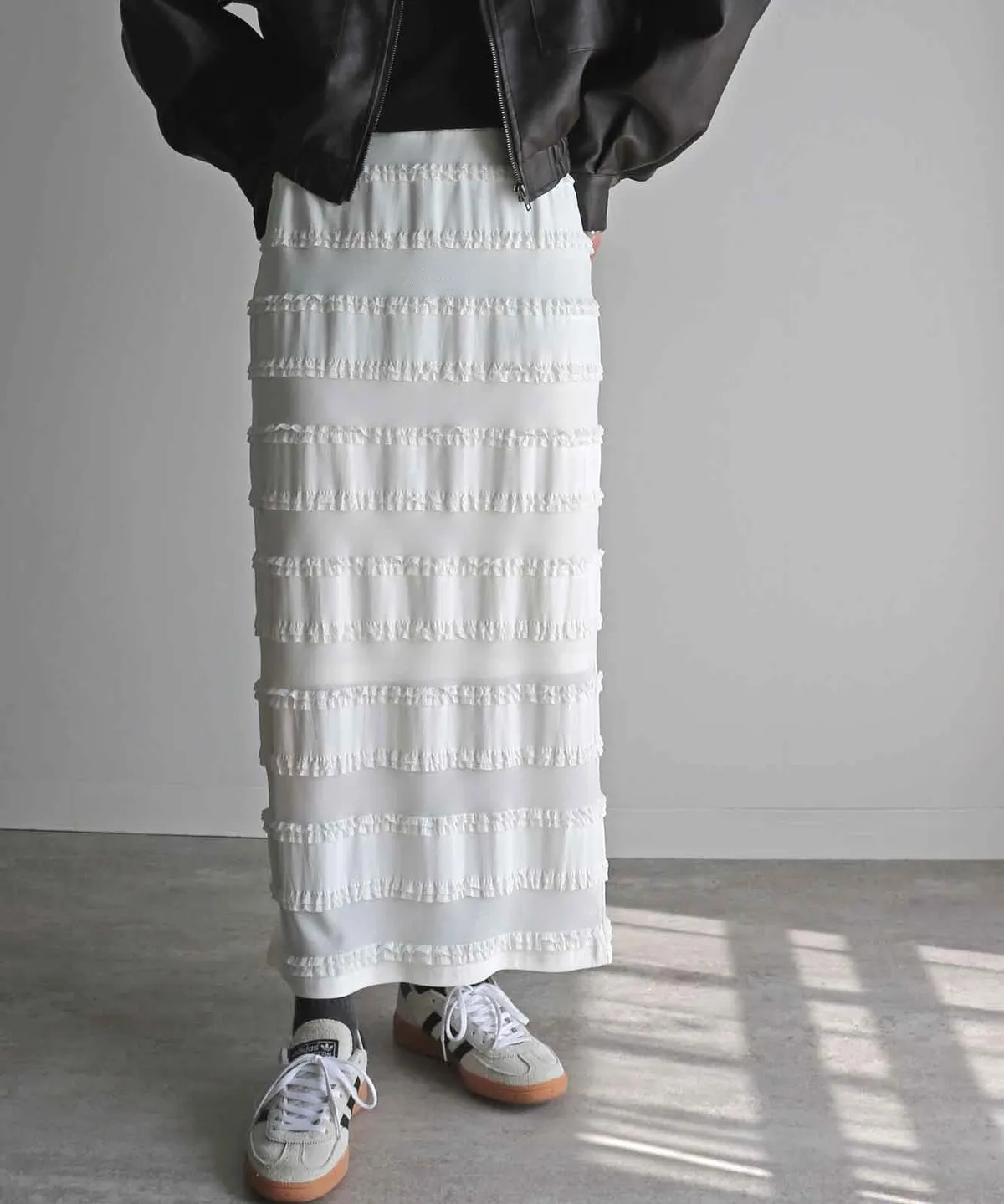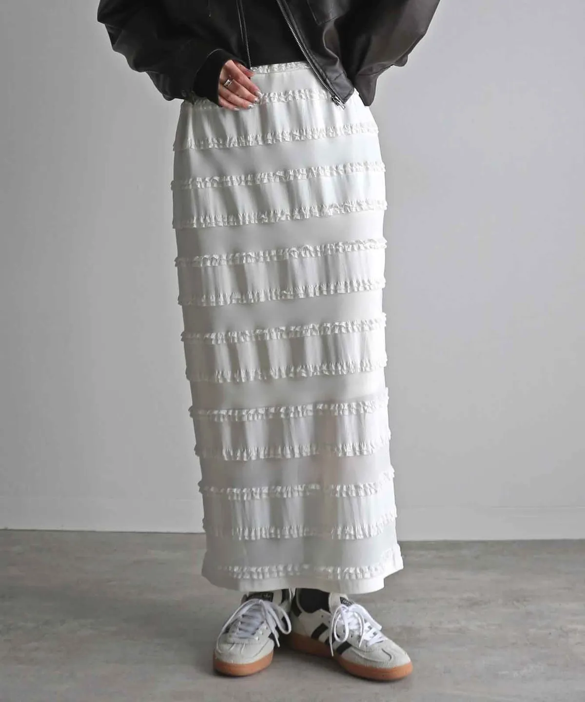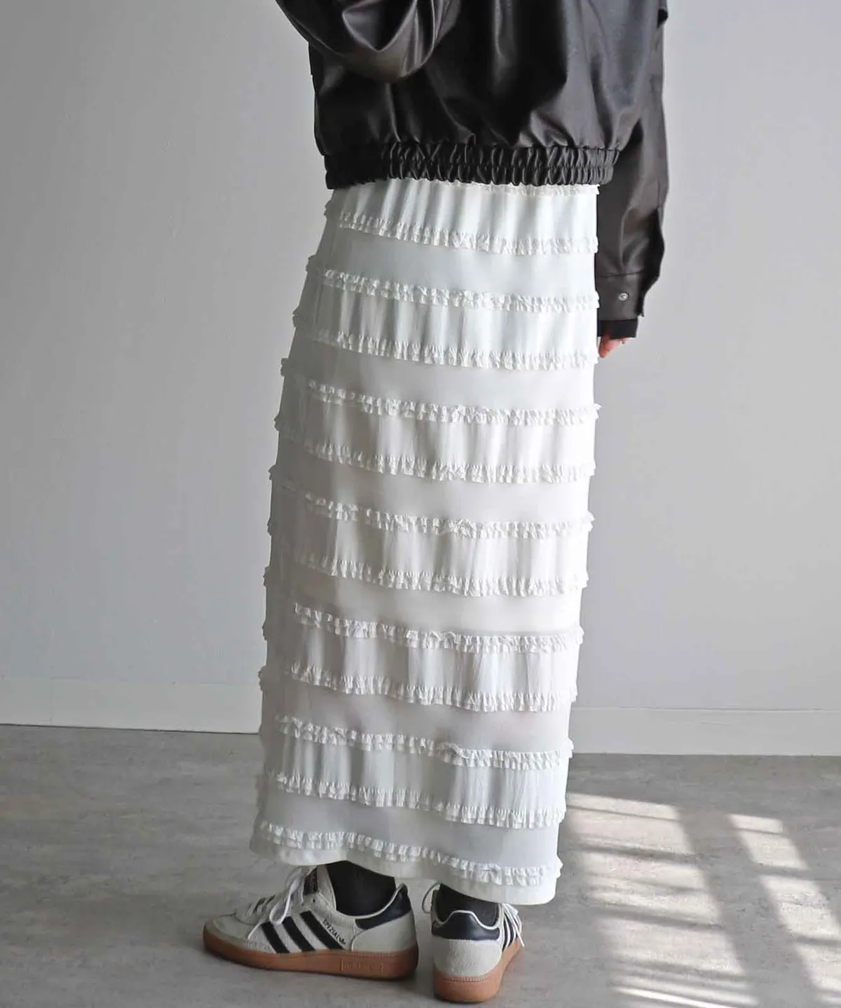 <再販!>條紋立體荷葉滾邊細身感長裙