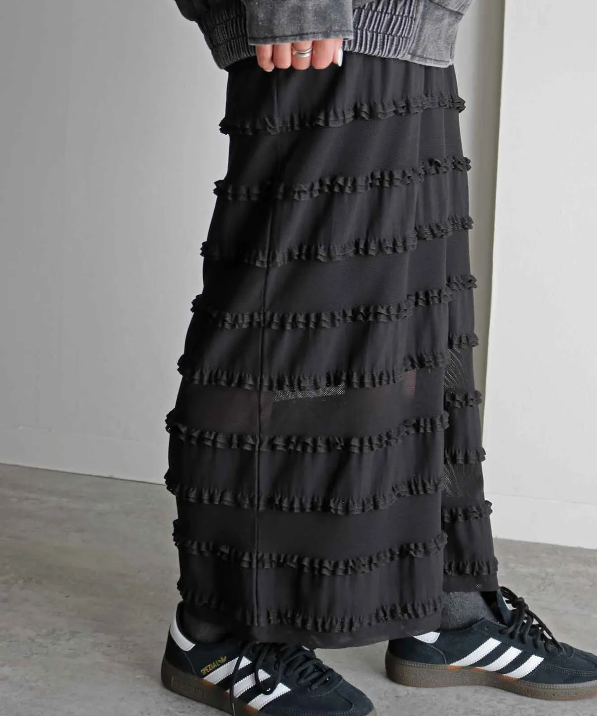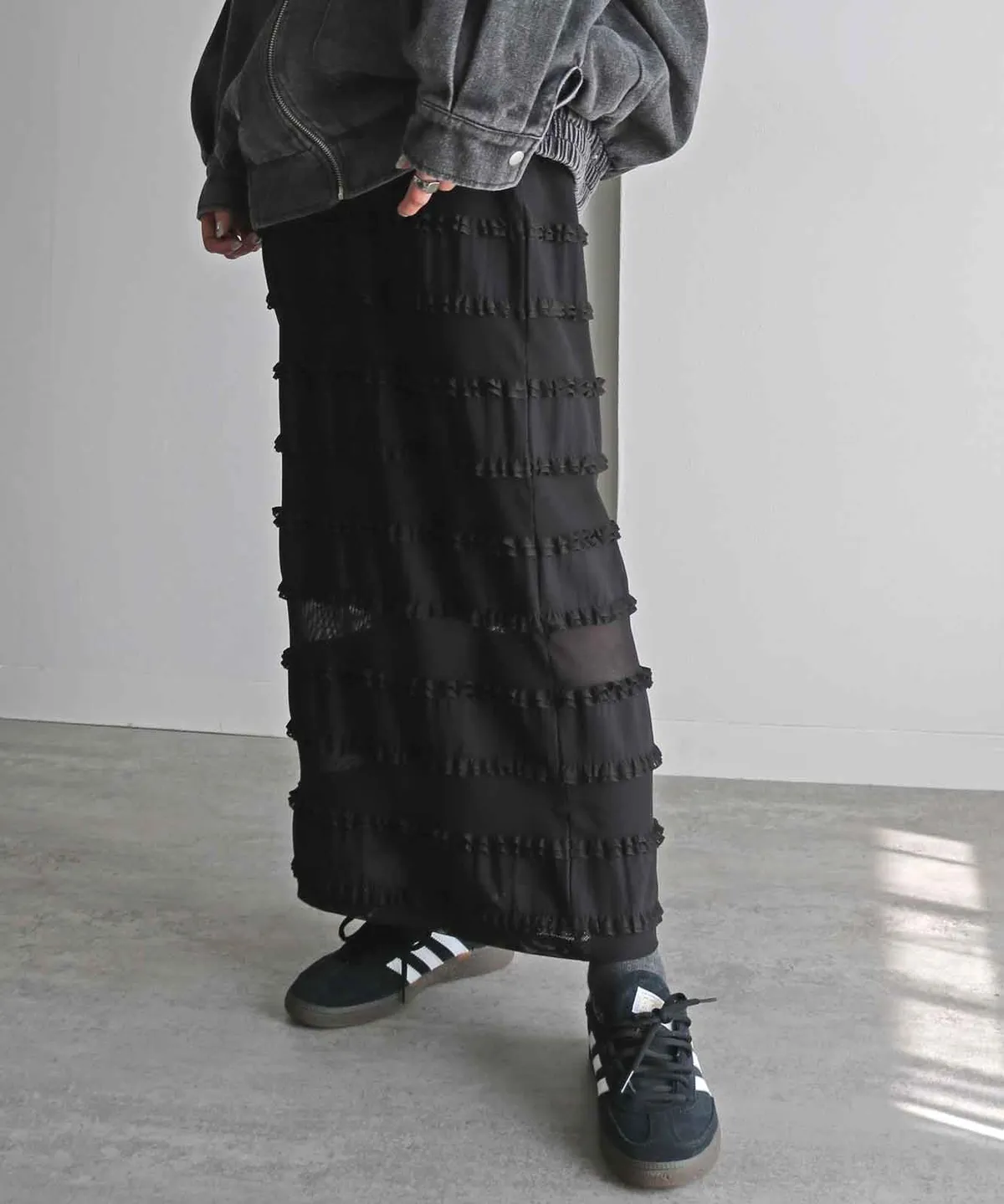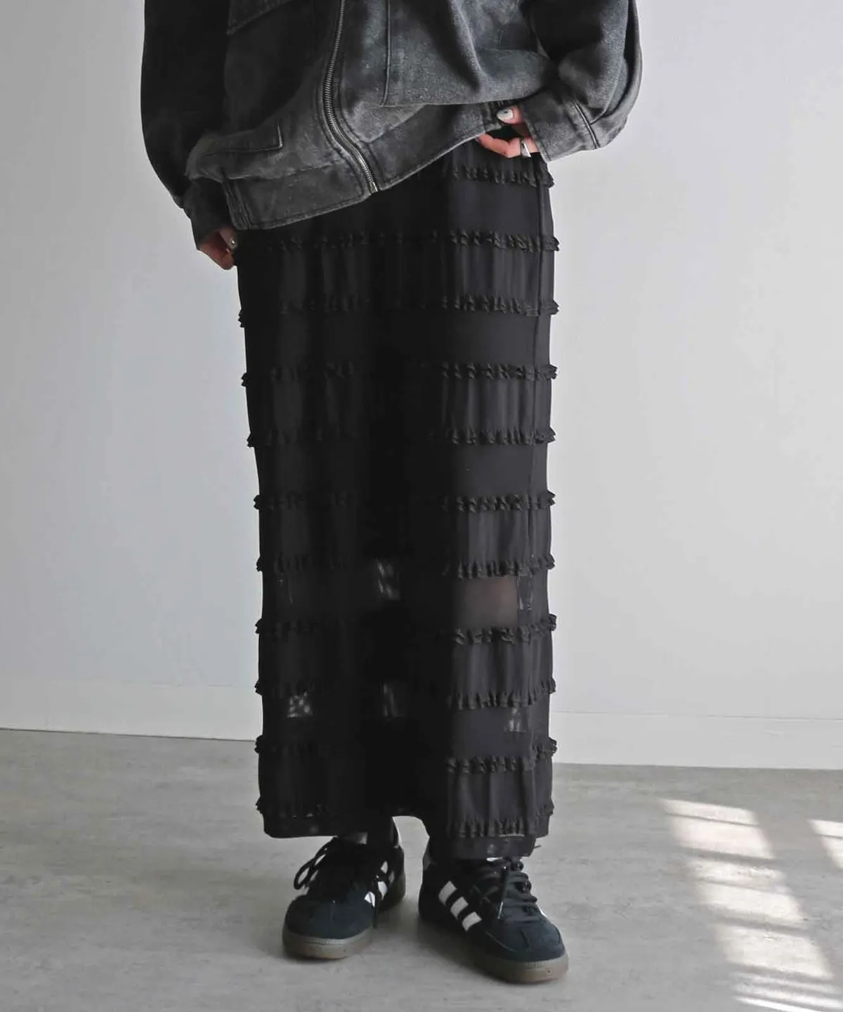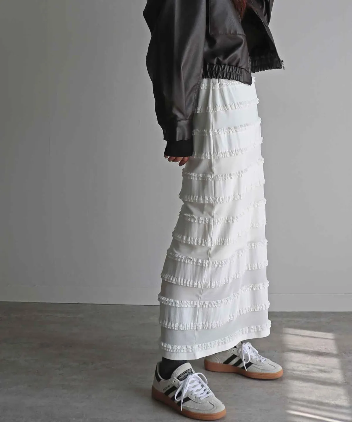 <再販!>條紋立體荷葉滾邊細身感長裙