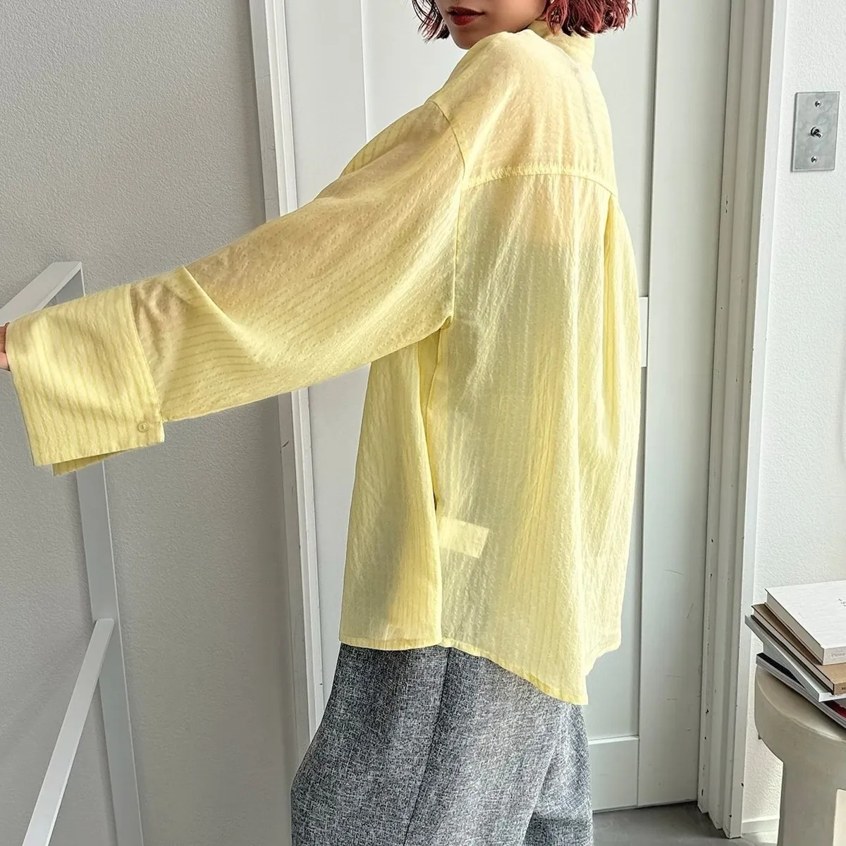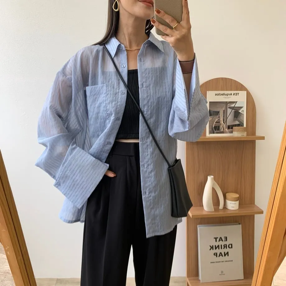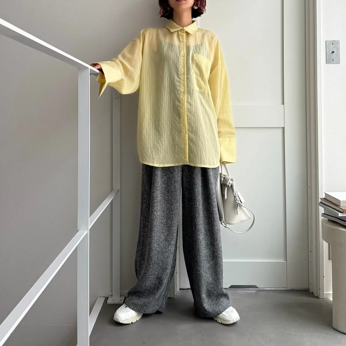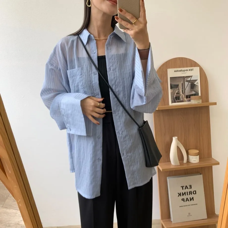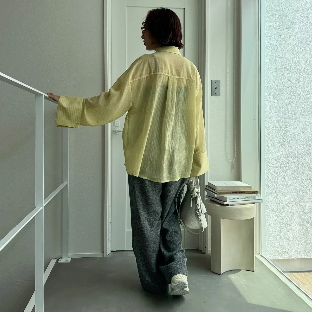 時尚的寬鬆襯衫,採用經典的翻領與長袖設計,整體呈現休閒慵懶風格。