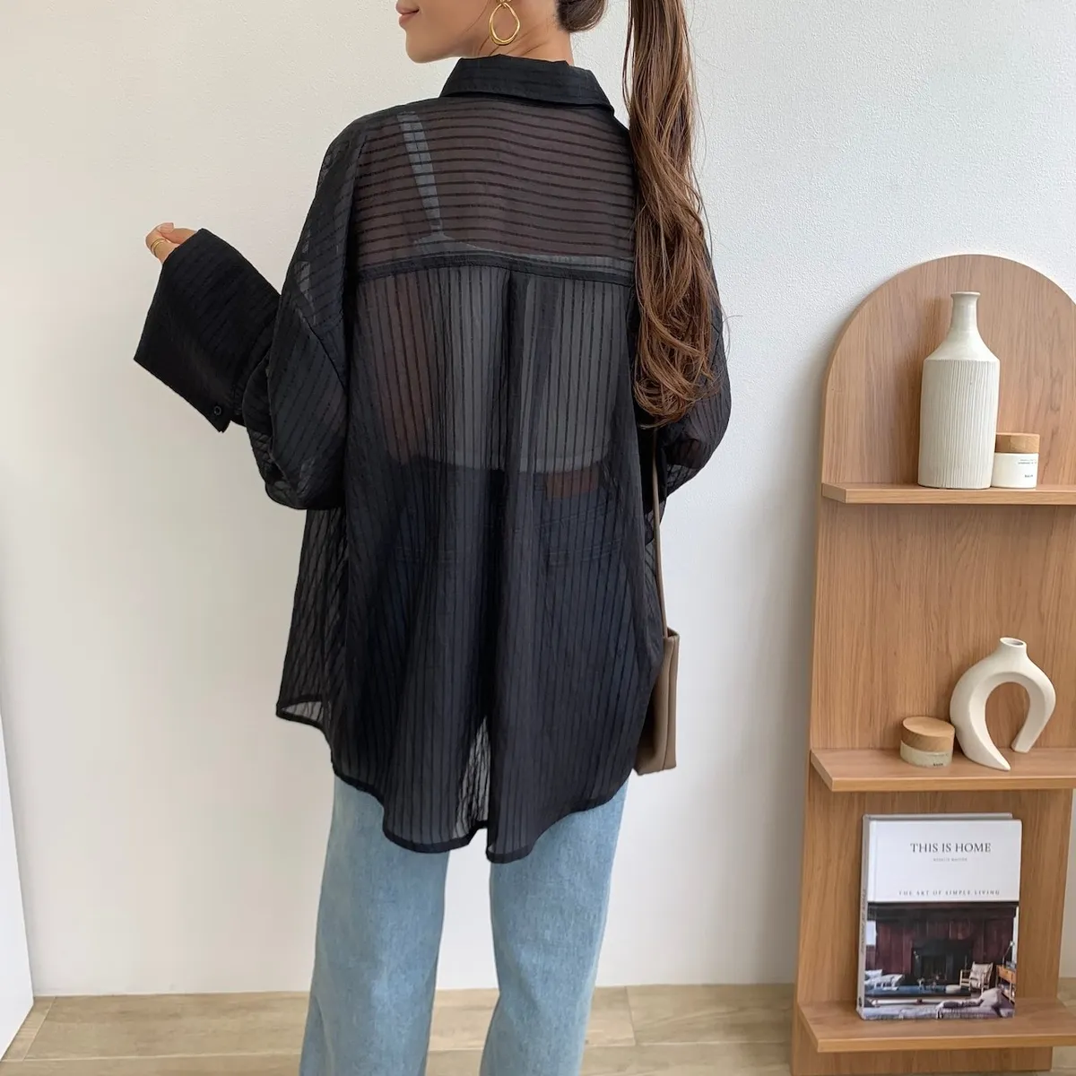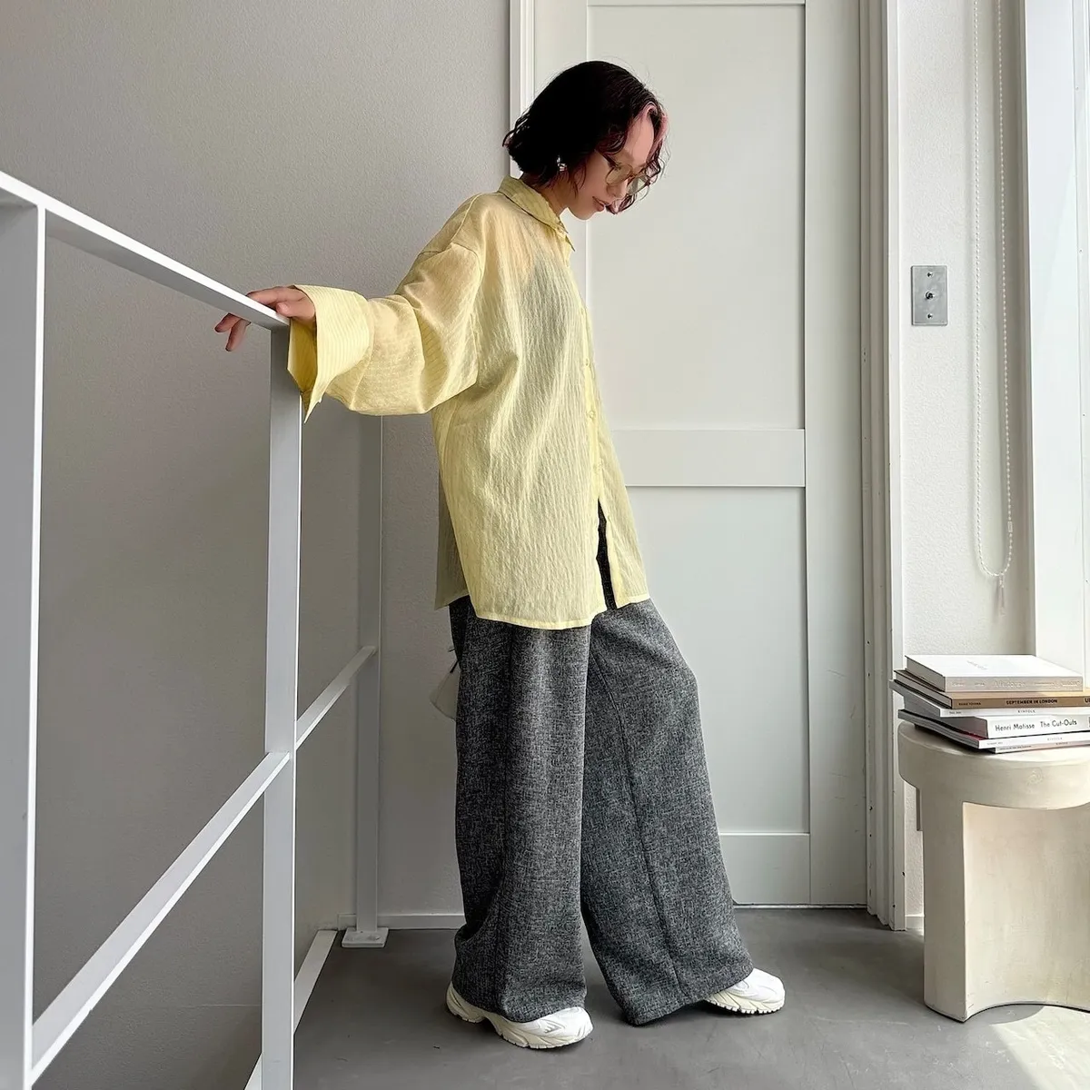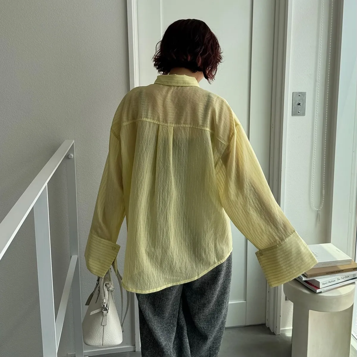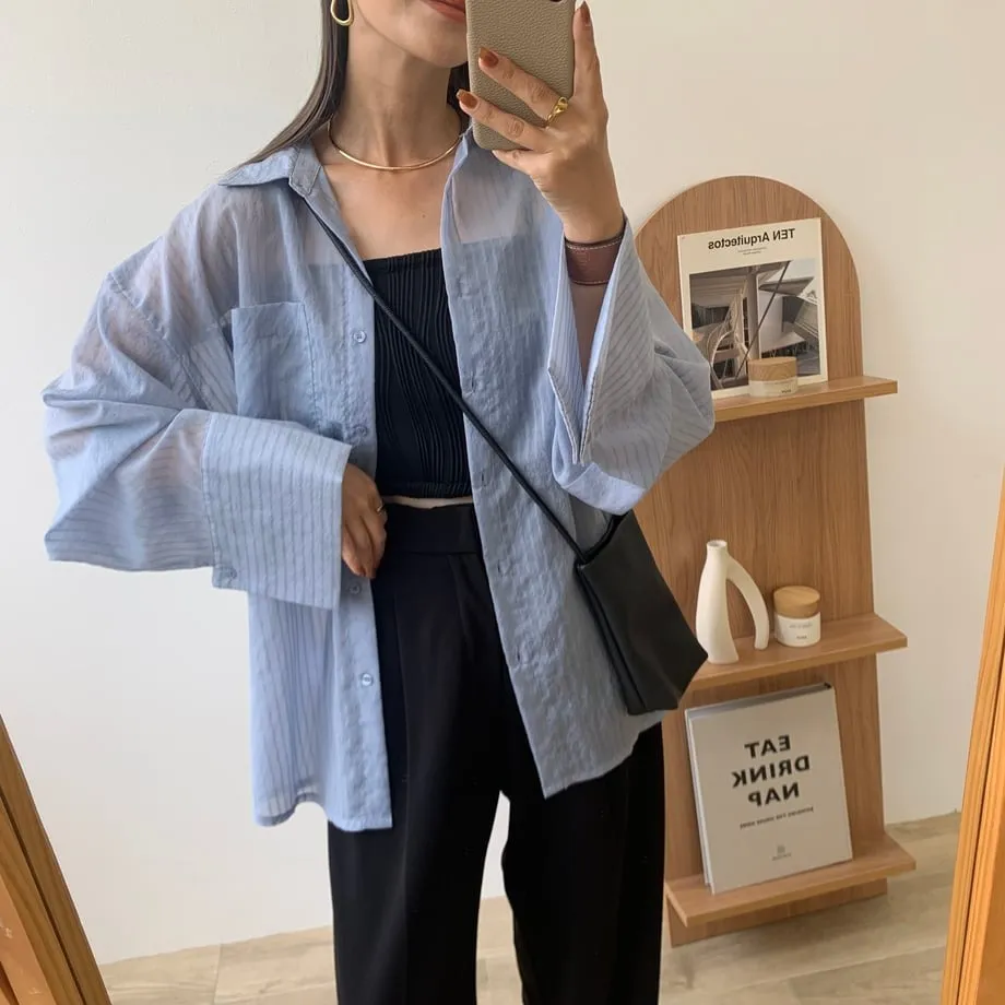 時尚的寬鬆襯衫,採用經典的翻領與長袖設計,整體呈現休閒慵懶風格。