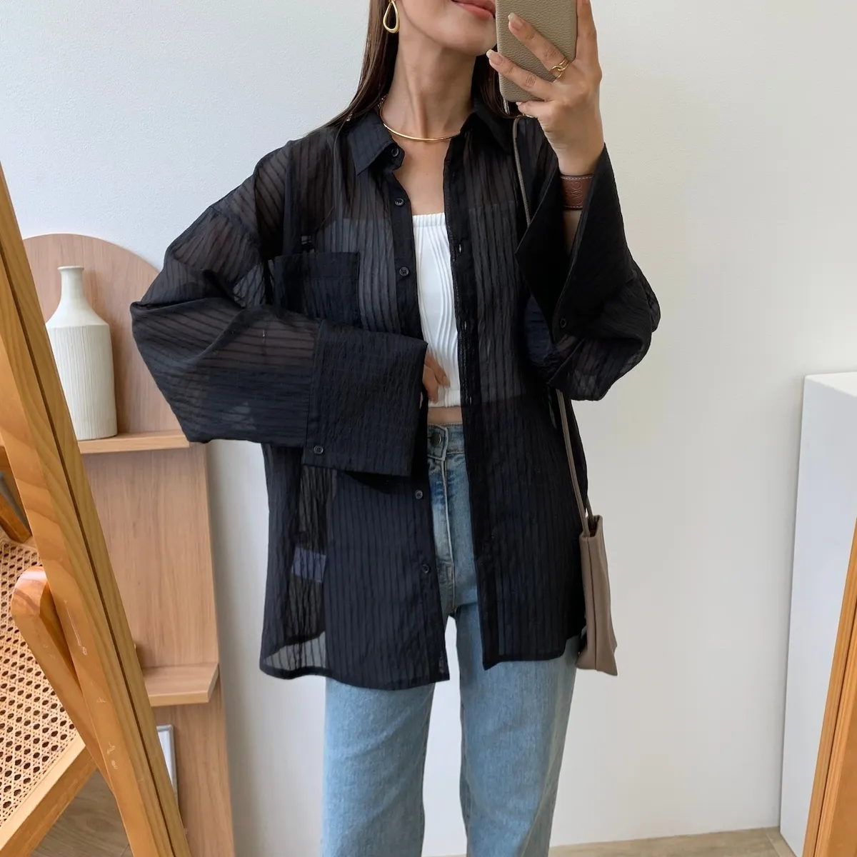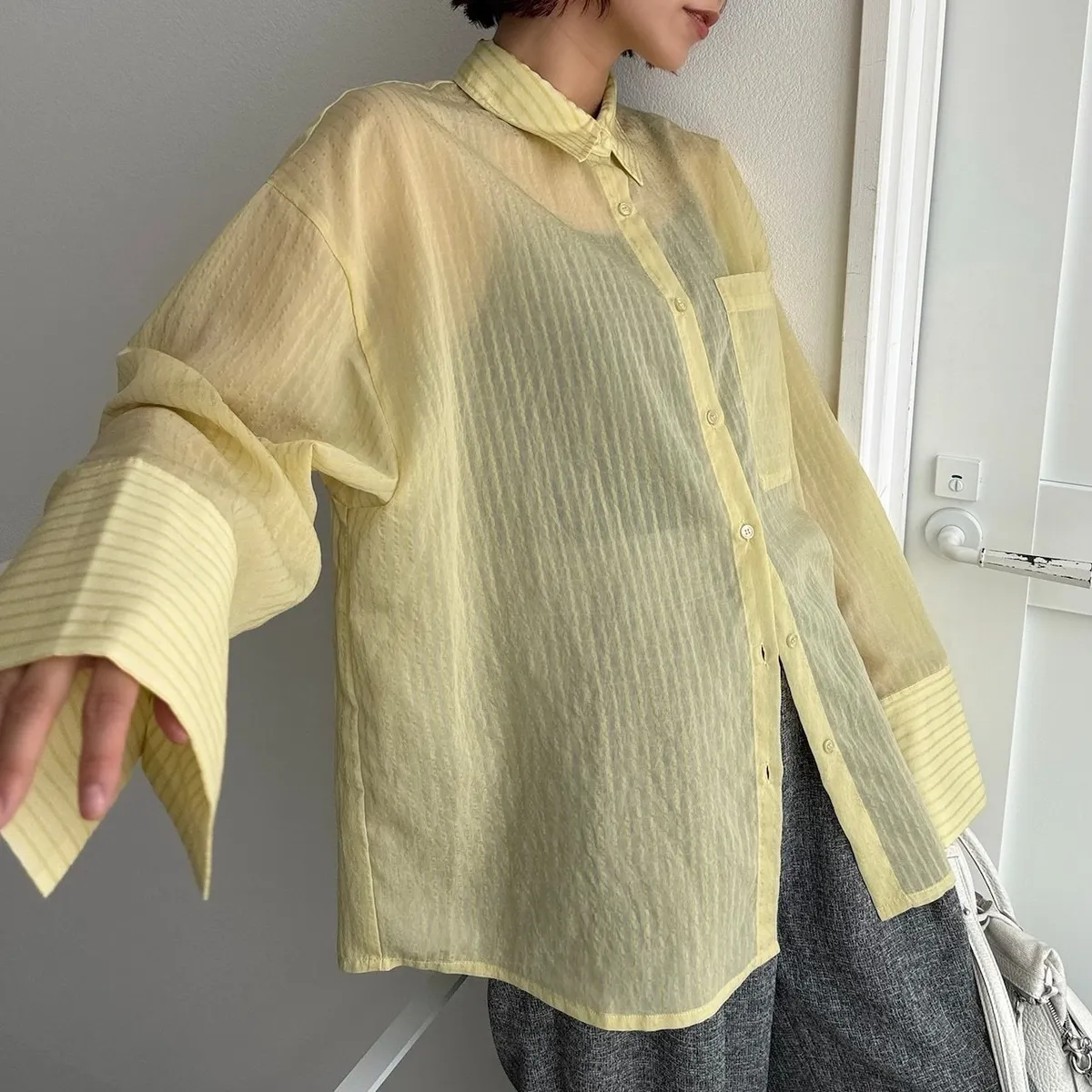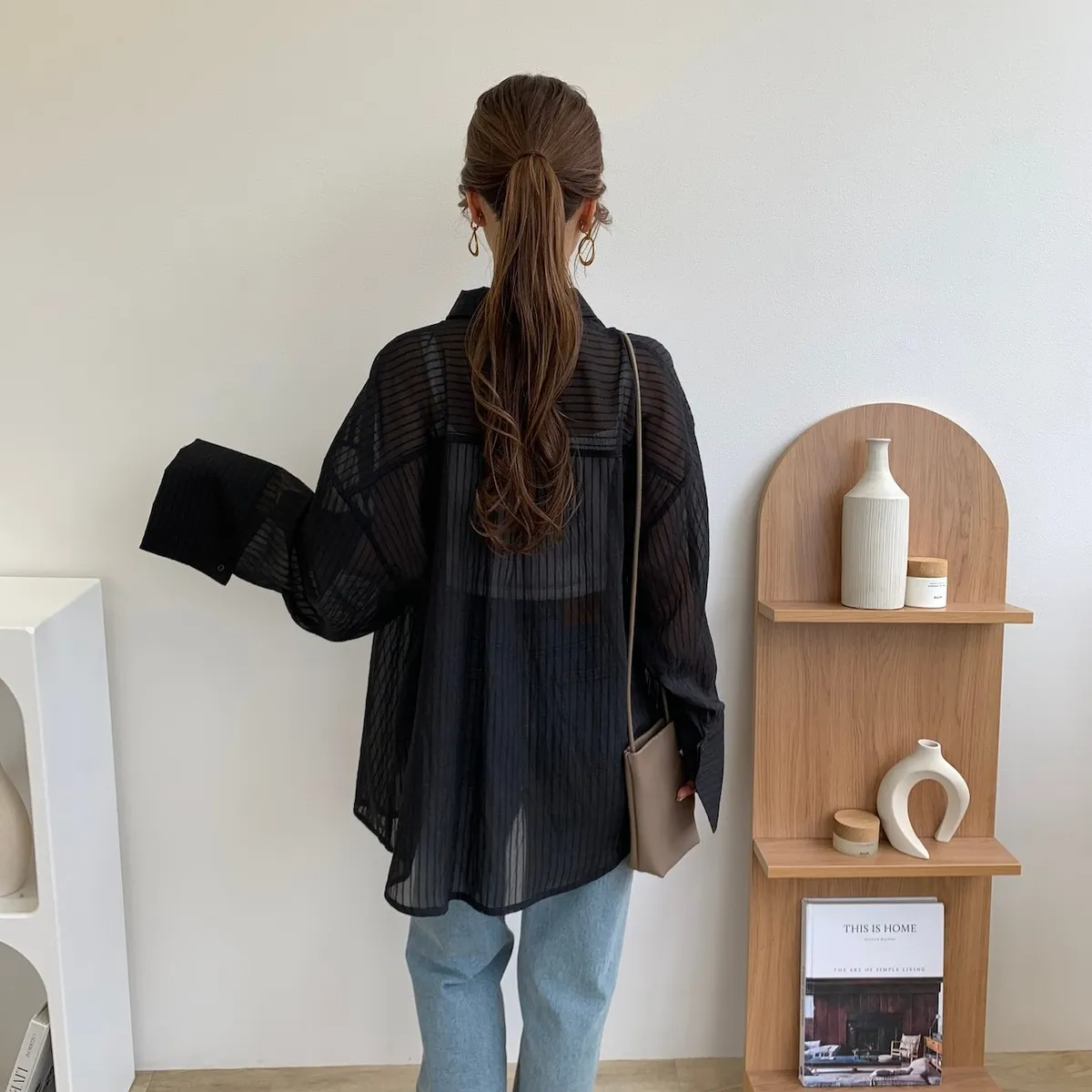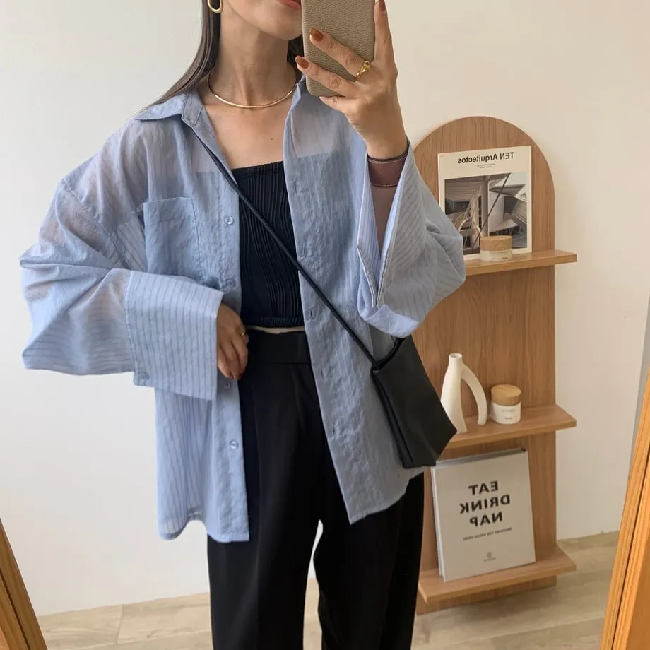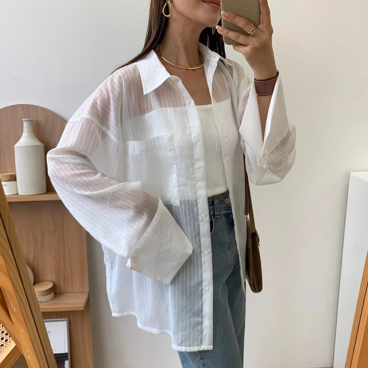 時尚的寬鬆襯衫,採用經典的翻領與長袖設計,整體呈現休閒慵懶風格。