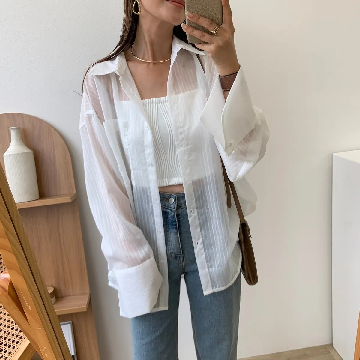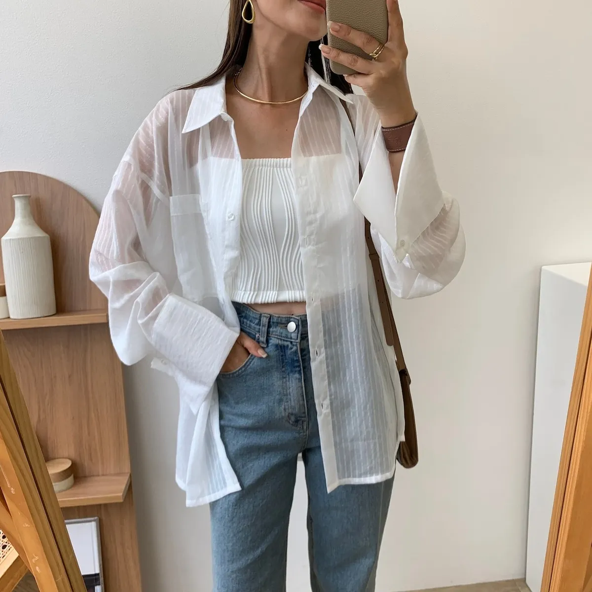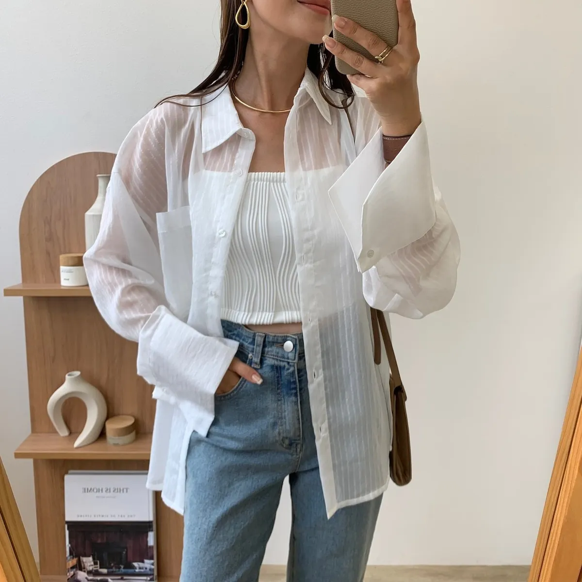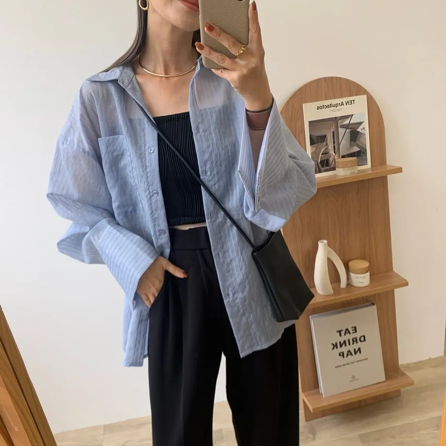 時尚的寬鬆襯衫,採用經典的翻領與長袖設計,整體呈現休閒慵懶風格。