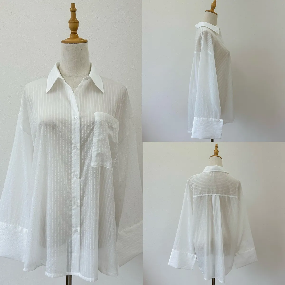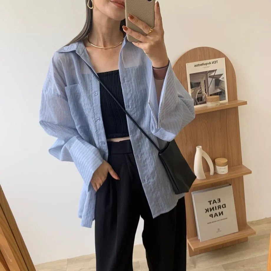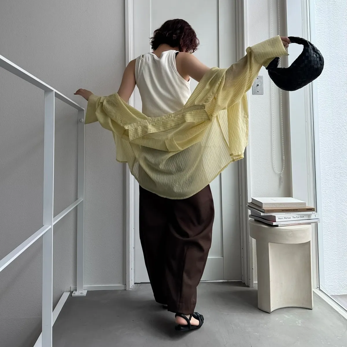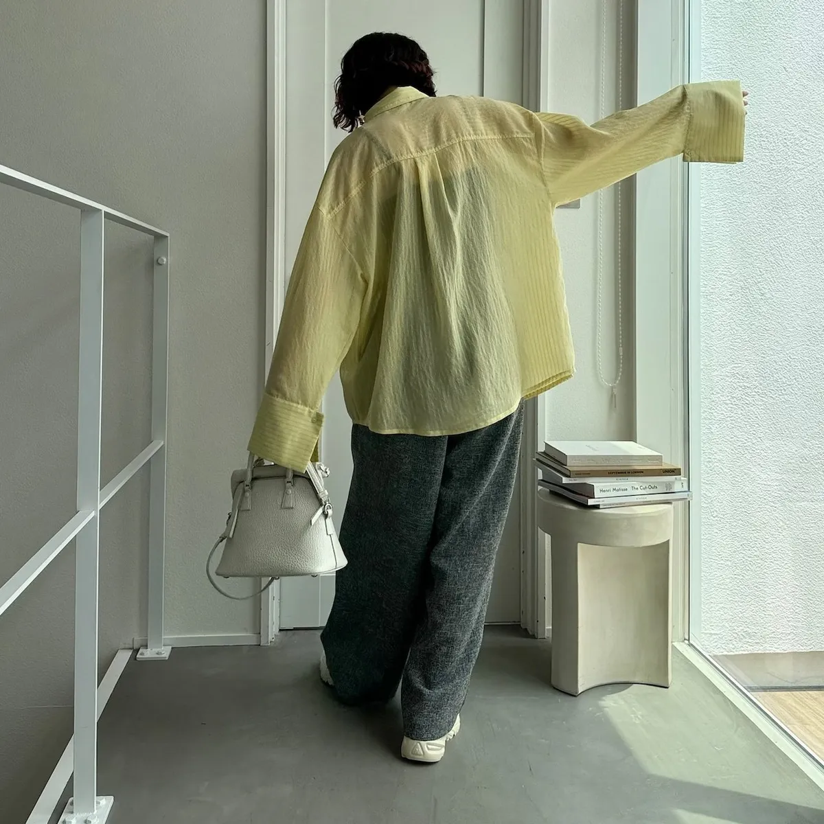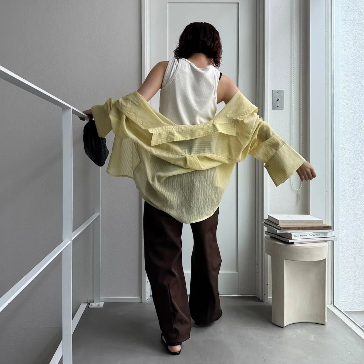 面料後度剛剛好~沒有那種硬挺感~有挺度但舒適休閒+透感~更柔美一點點