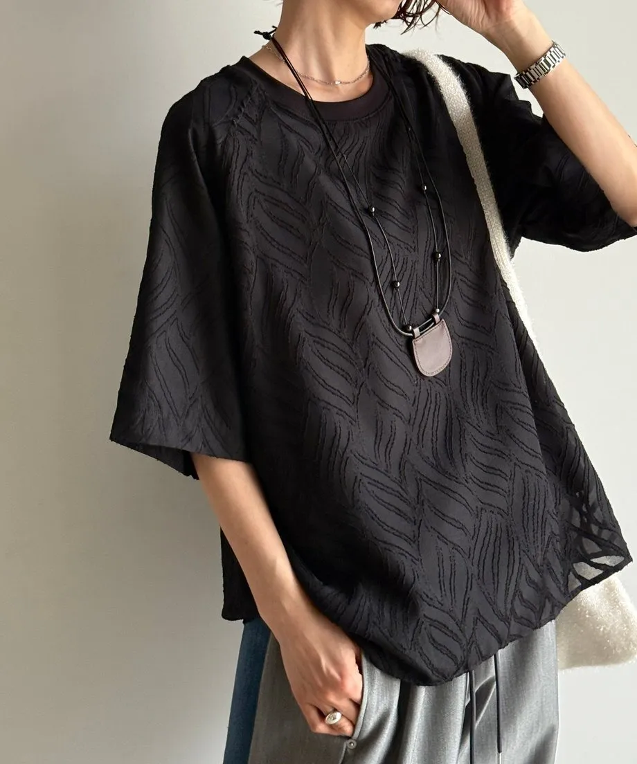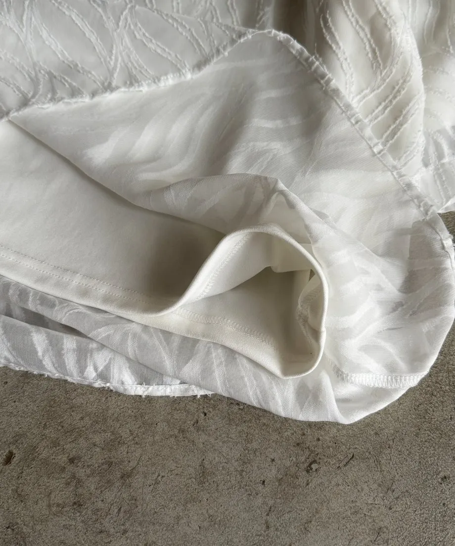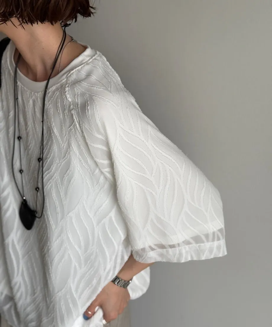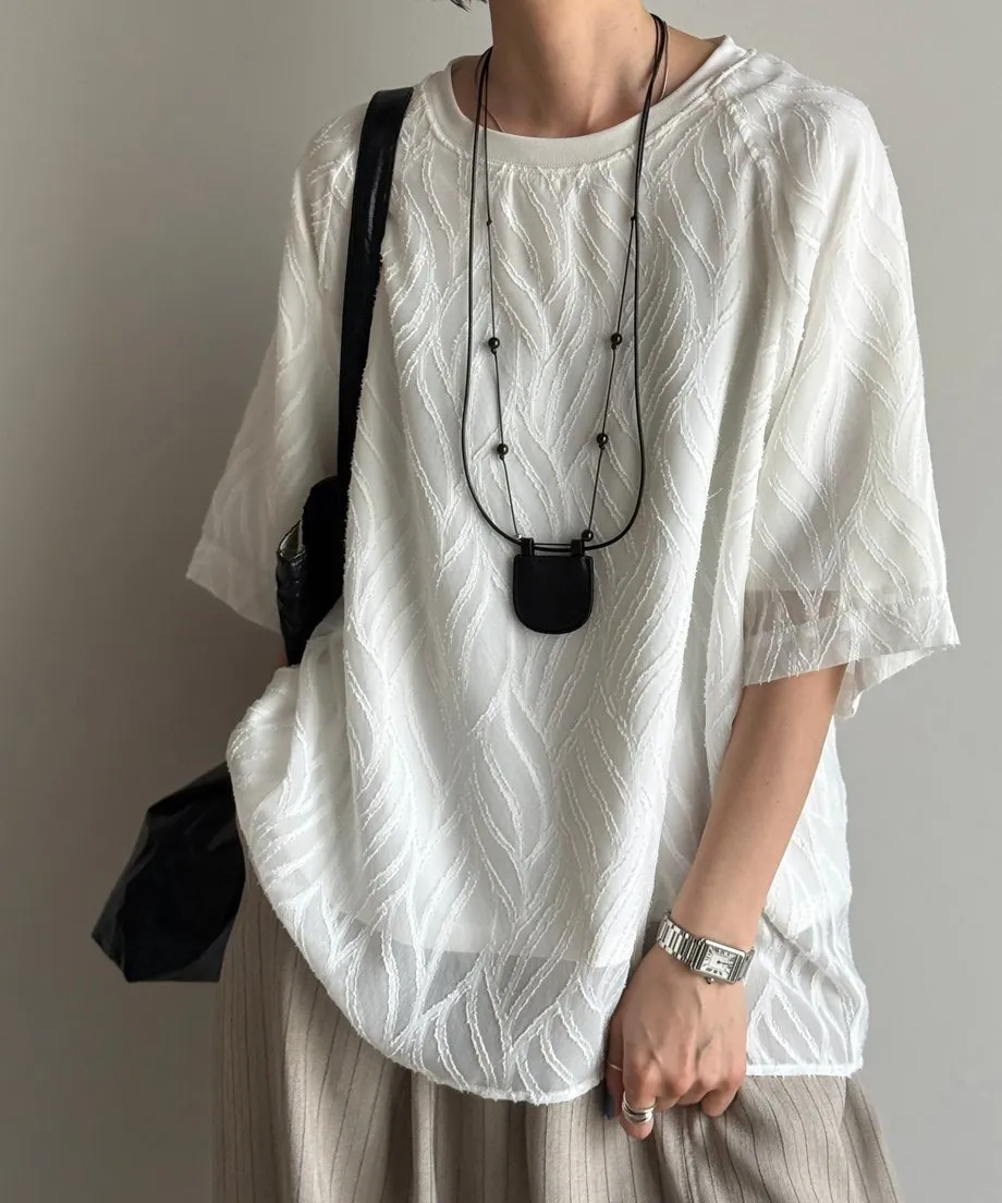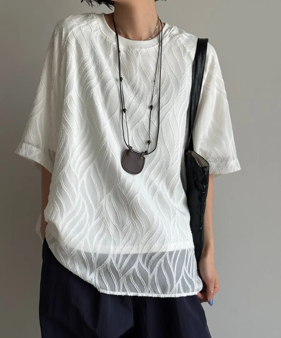 今日追加通知白色補貨囉!^^重點價格還有小折扣有詢問的不要錯過囉透明提花波浪刺繡圖騰造型上衣寬鬆輪廓垂墜五分袖 透明面料與帶有波浪紋樣的提花面料巧妙融合同色調的內裡一件呈現透明感&立體感優雅又兼具個性氣質 數量限定