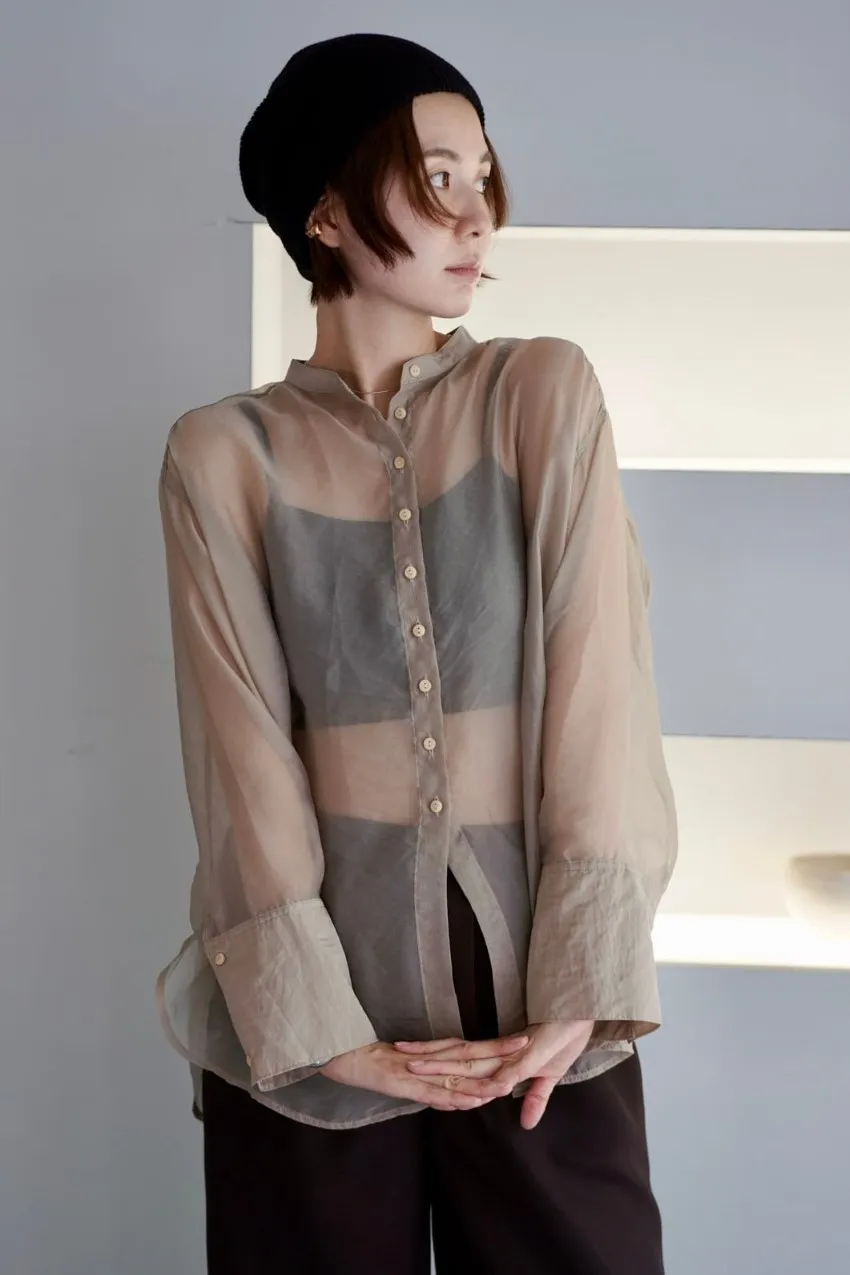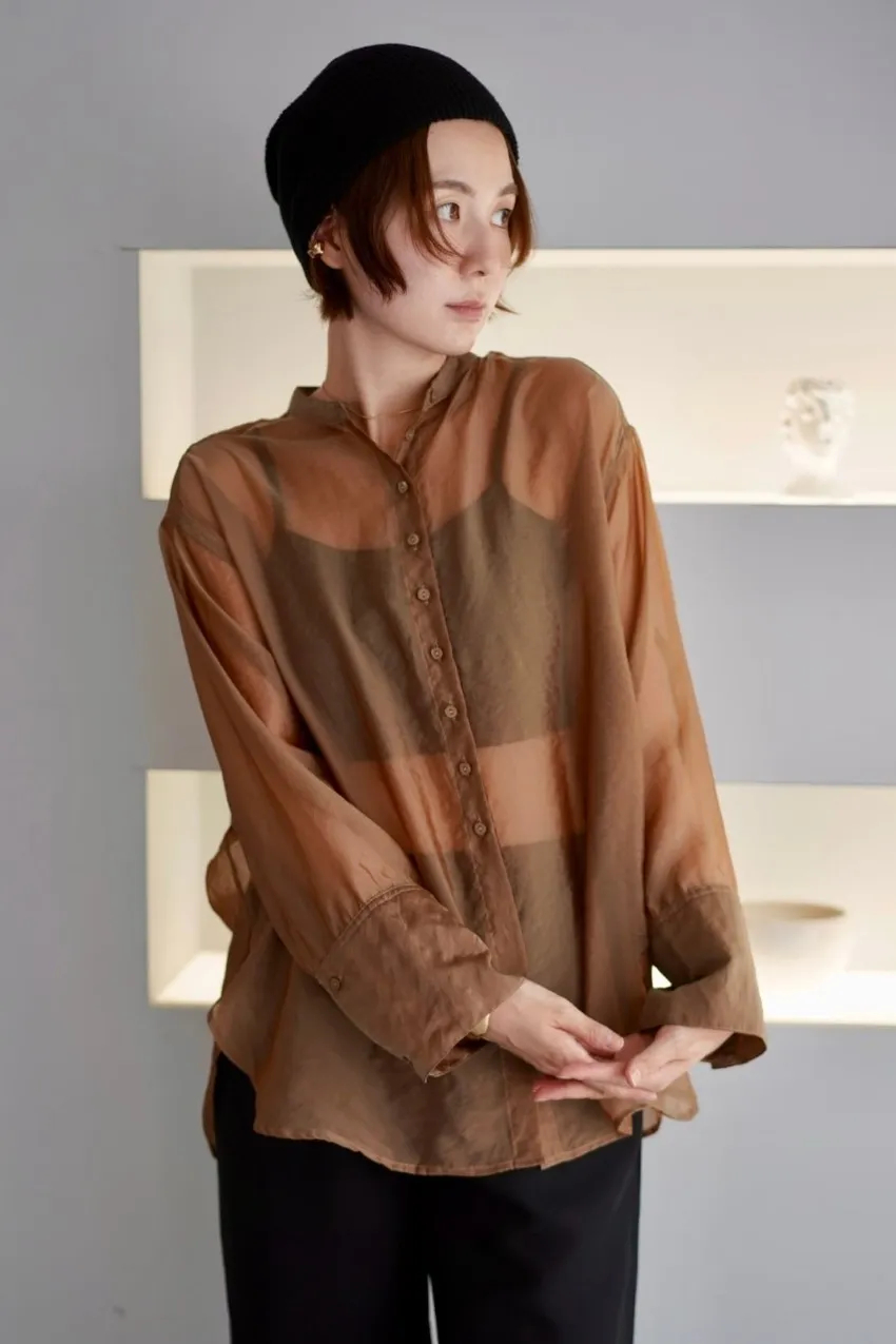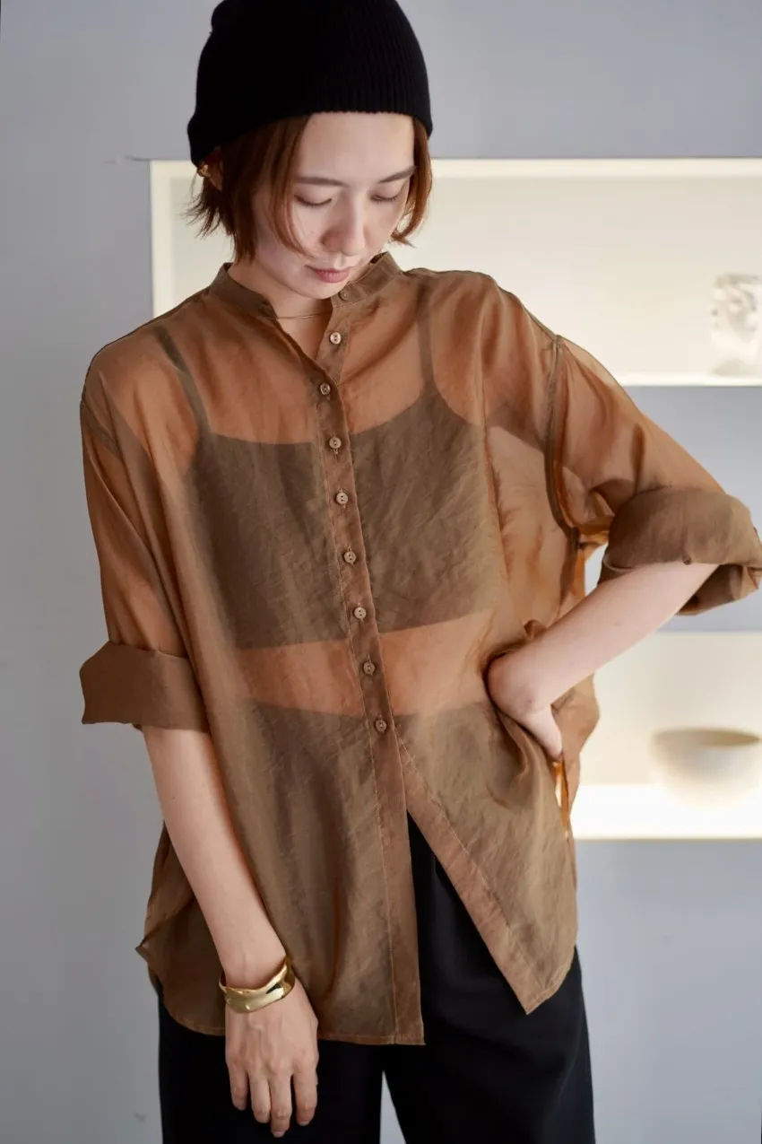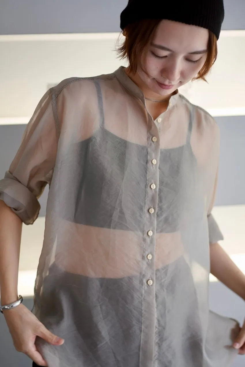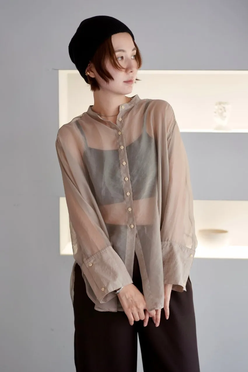 <8月特惠>品牌質感華麗光澤透視立領寬版襯衫