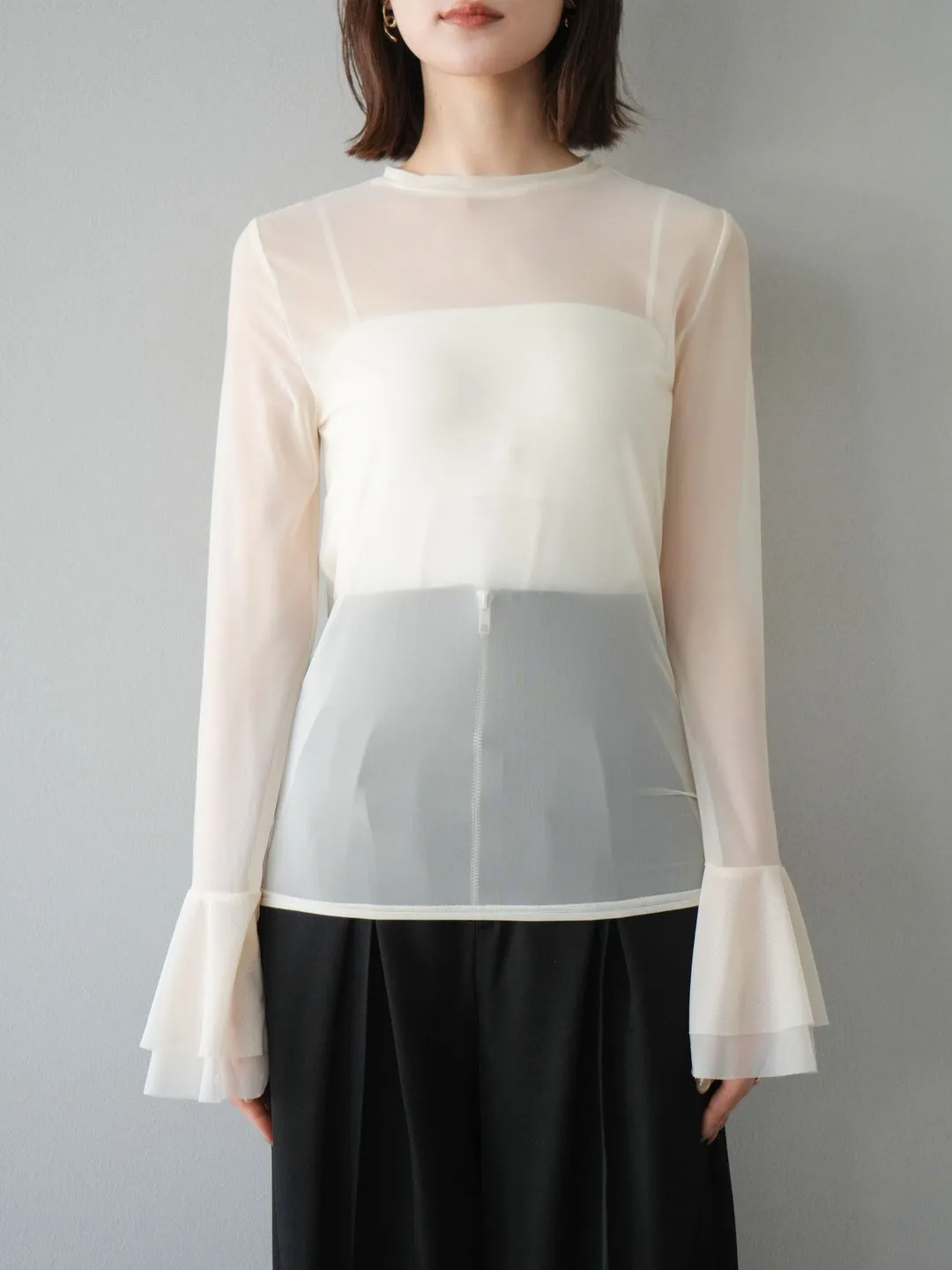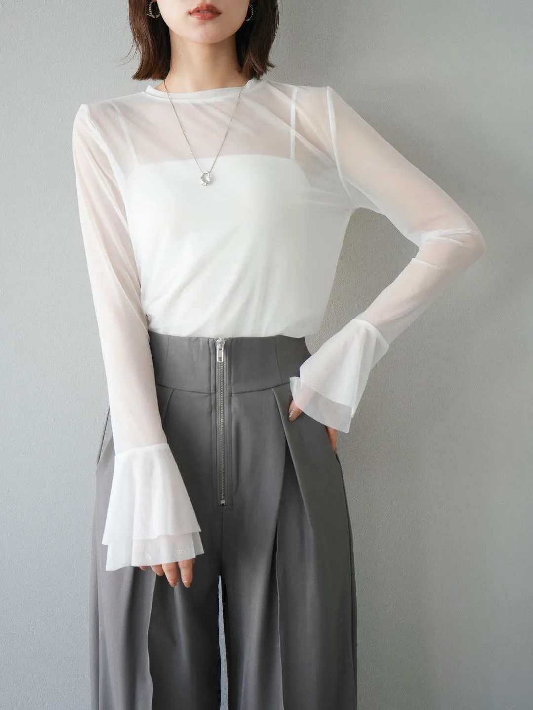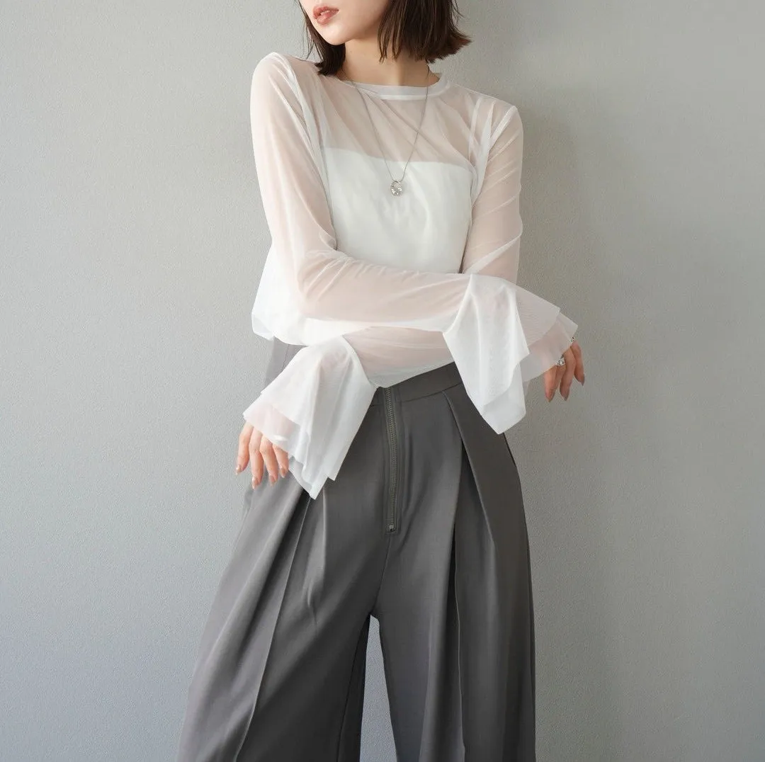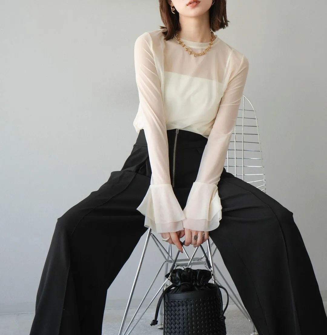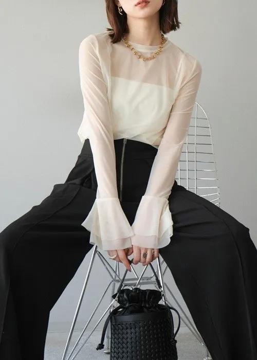 造型特色雙層荷葉寬袖透膚彈性打底衣