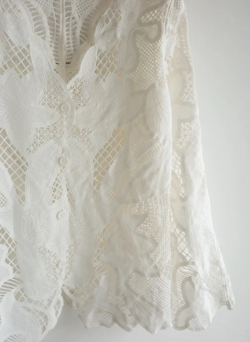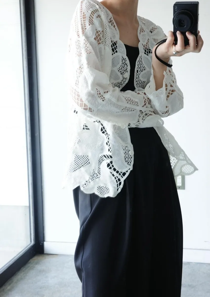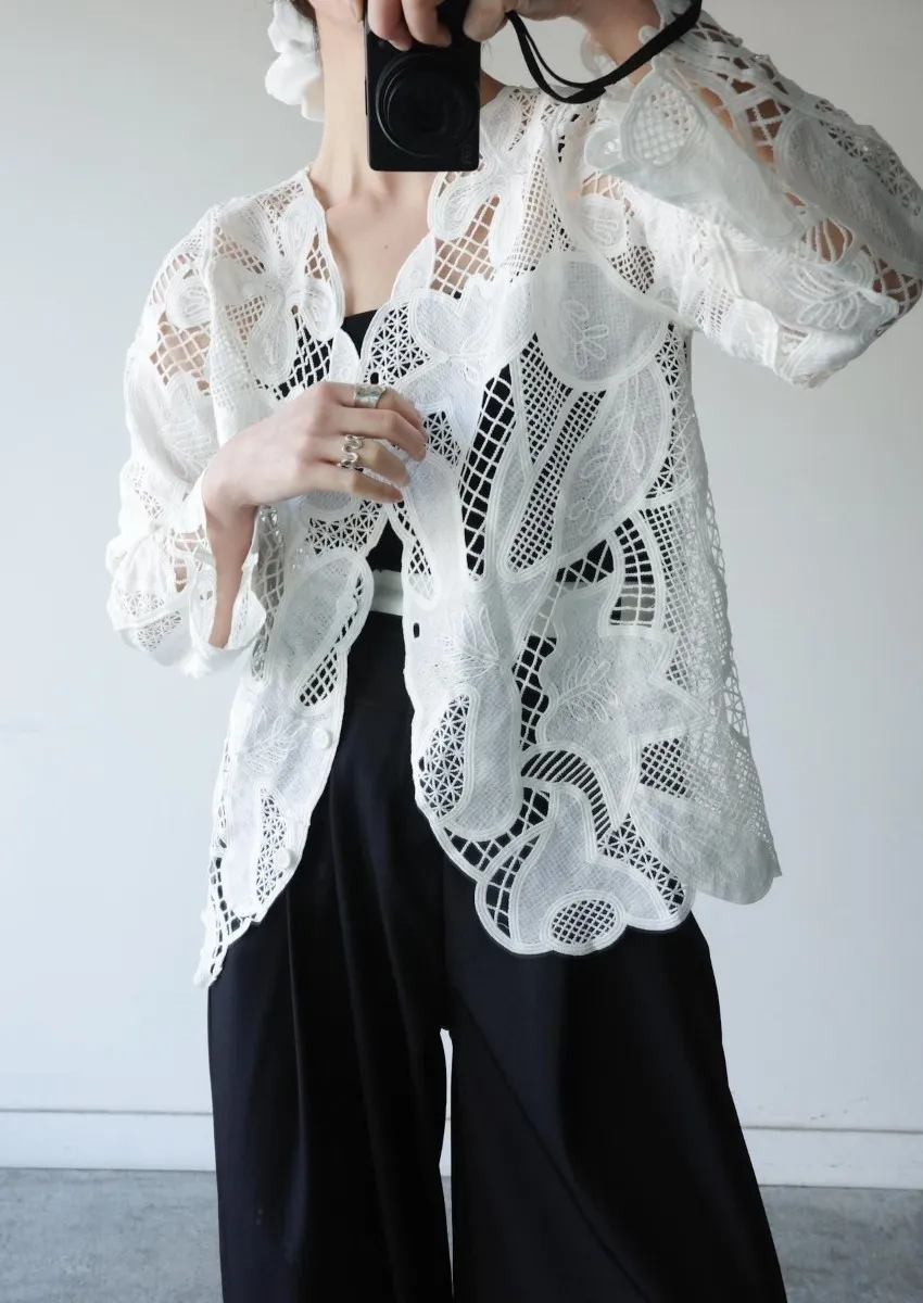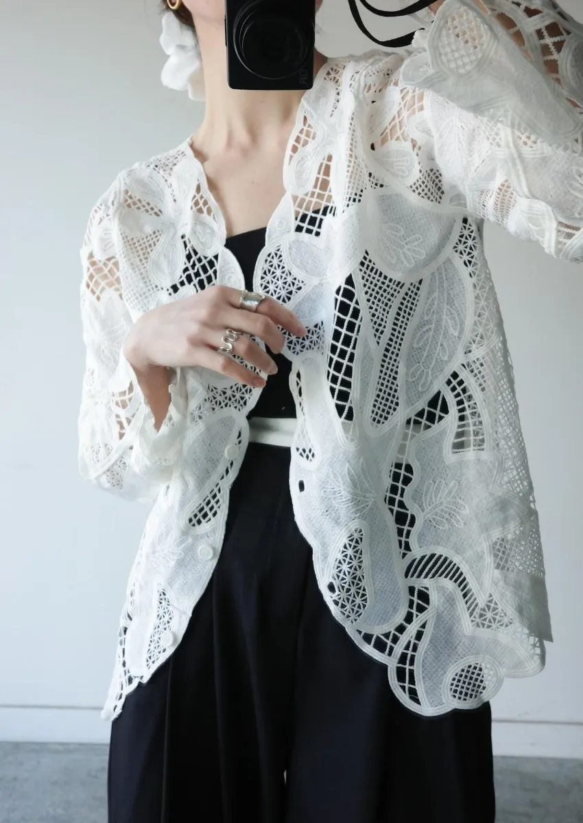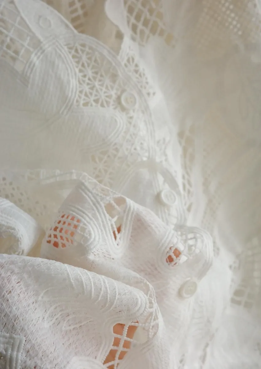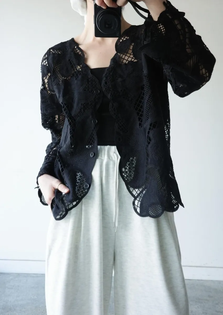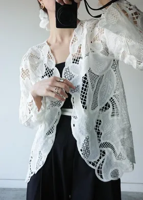 人氣商品~春季再入荷注目棉布蕾絲拼接刺繡搭配局部透視洞洞整體層次立體感 帶一點華麗感的氛圍輕盈涼爽薄款材質特色強烈的罩衫外套但是搭配起來一點也不困難喜歡日系森林感層次造型女孩或是想要簡單穿搭增加小亮點這款推推~~~特別喜歡一致性同色調的鈕扣設計邊緣弧形花朵般的滾邊精緻度100分3色