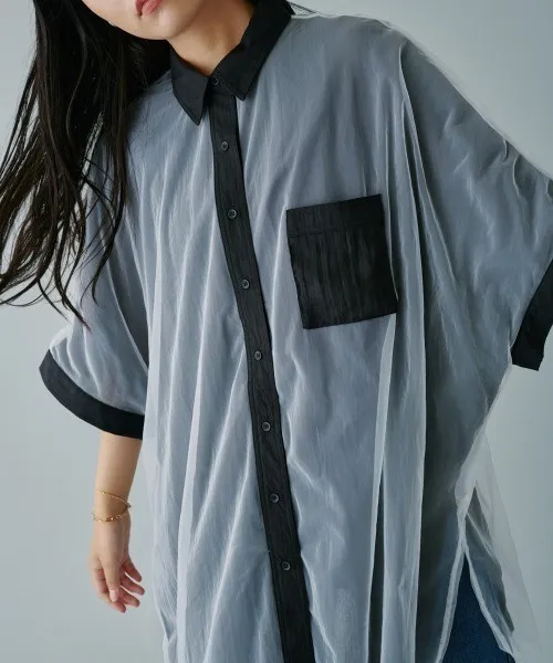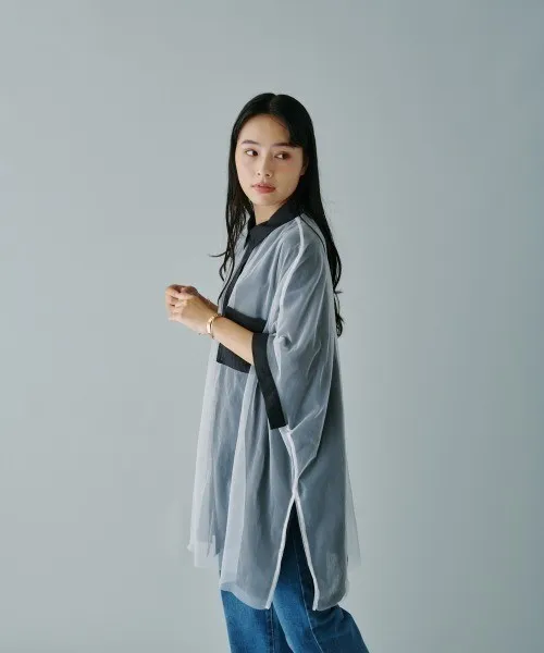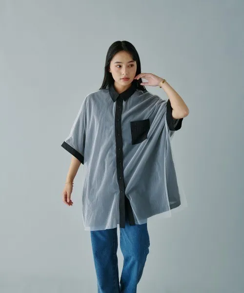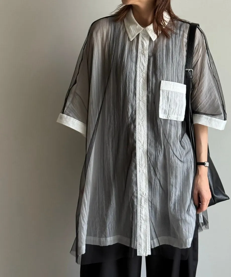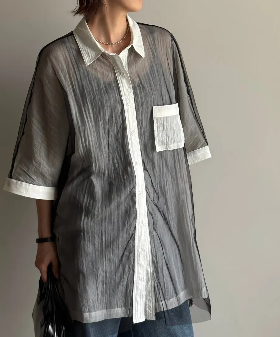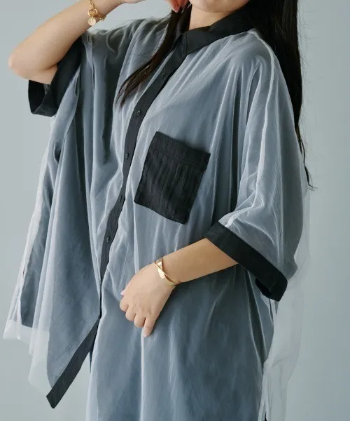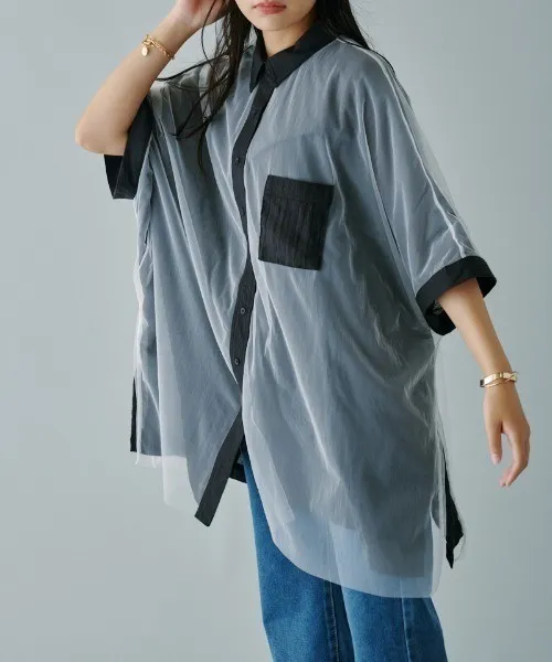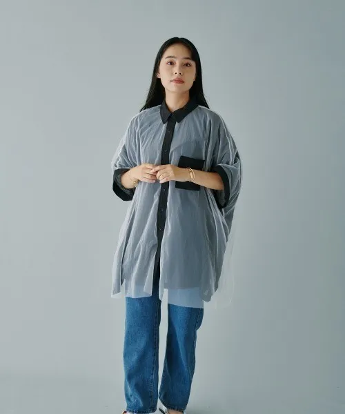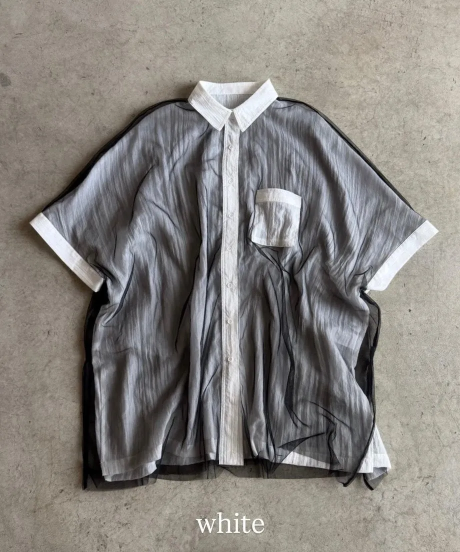 日幣高單價~數量限定2個顏色~配色上都好好看這品牌很喜歡在襯衫上面做變化這件的配色搭配上很美面料質感很好~內襯衫棉布+外成網紗超級可愛小幫自己是買白色的<白口袋>中長板搭款度也穿褲或長度都很好看推薦入手精品等級襯衫真的很棒