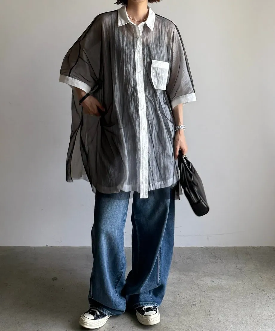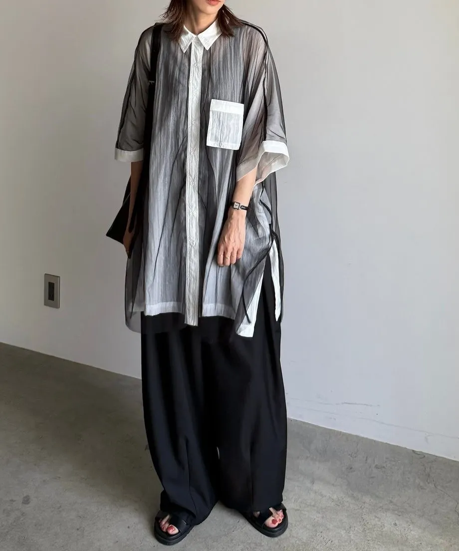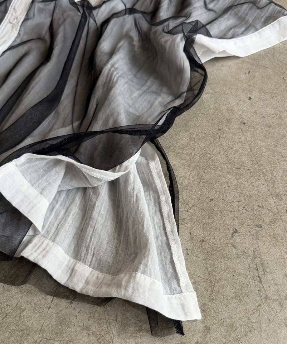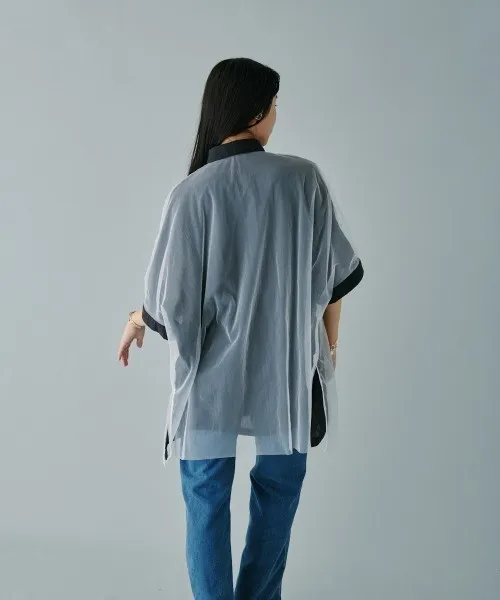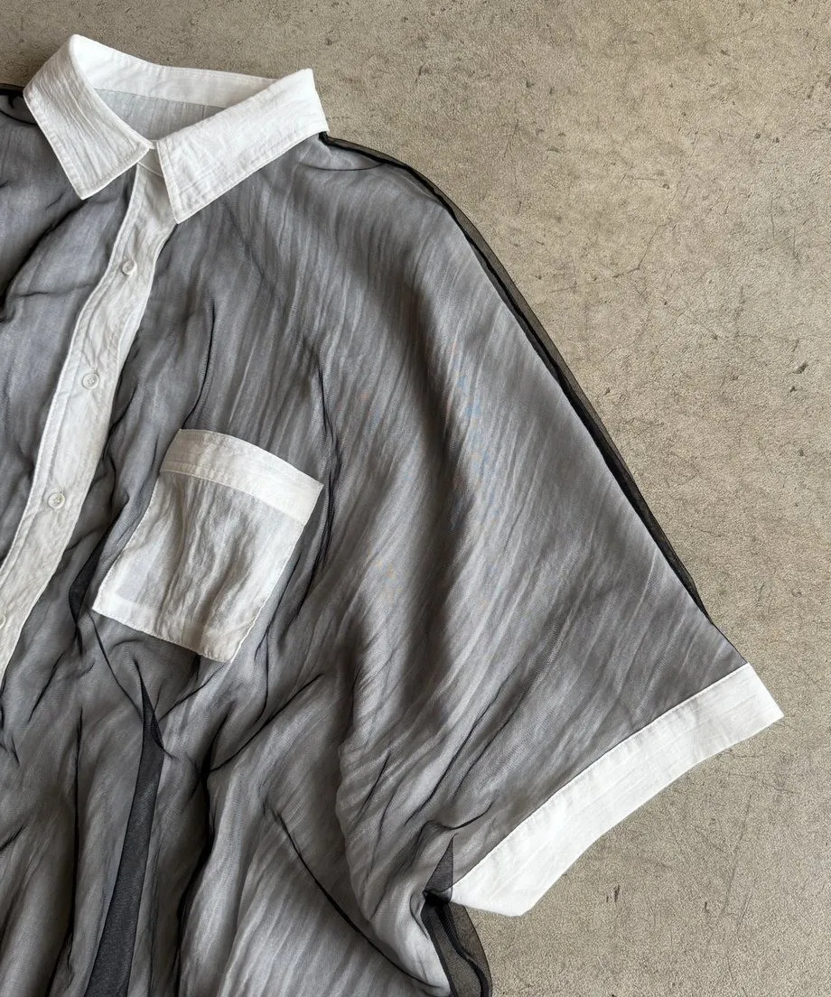 日幣高單價~數量限定2個顏色~配色上都好好看這品牌很喜歡在襯衫上面做變化這件的配色搭配上很美面料質感很好~內襯衫棉布+外成網紗超級可愛小幫自己是買白色的<白口袋>中長板搭款度也穿褲或長度都很好看推薦入手精品等級襯衫真的很棒