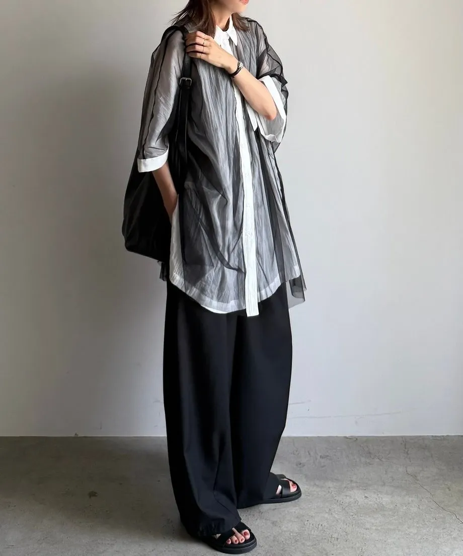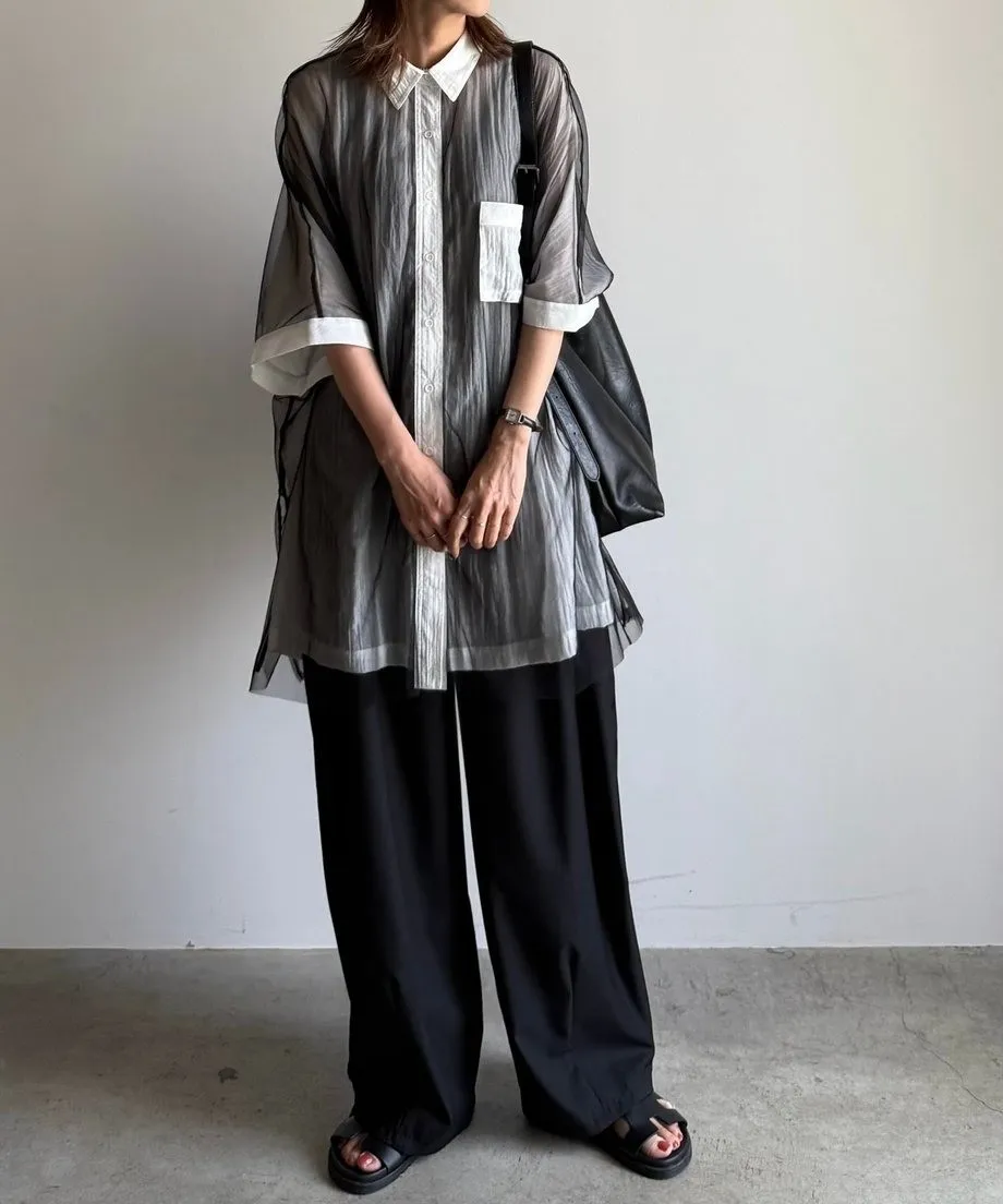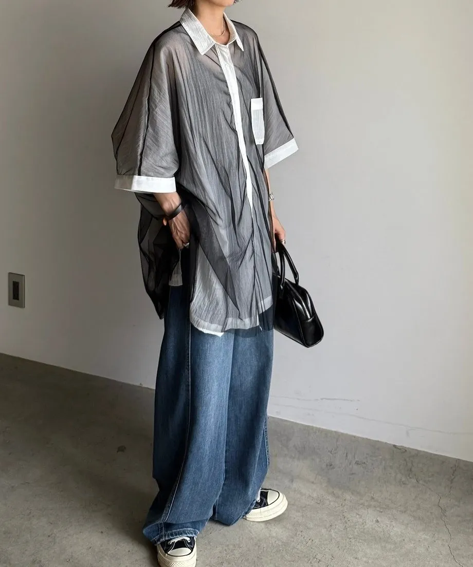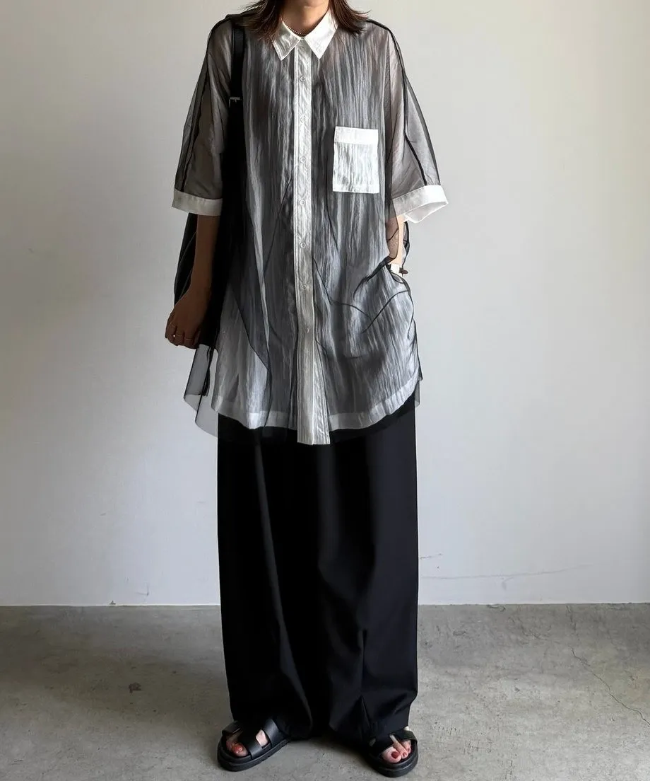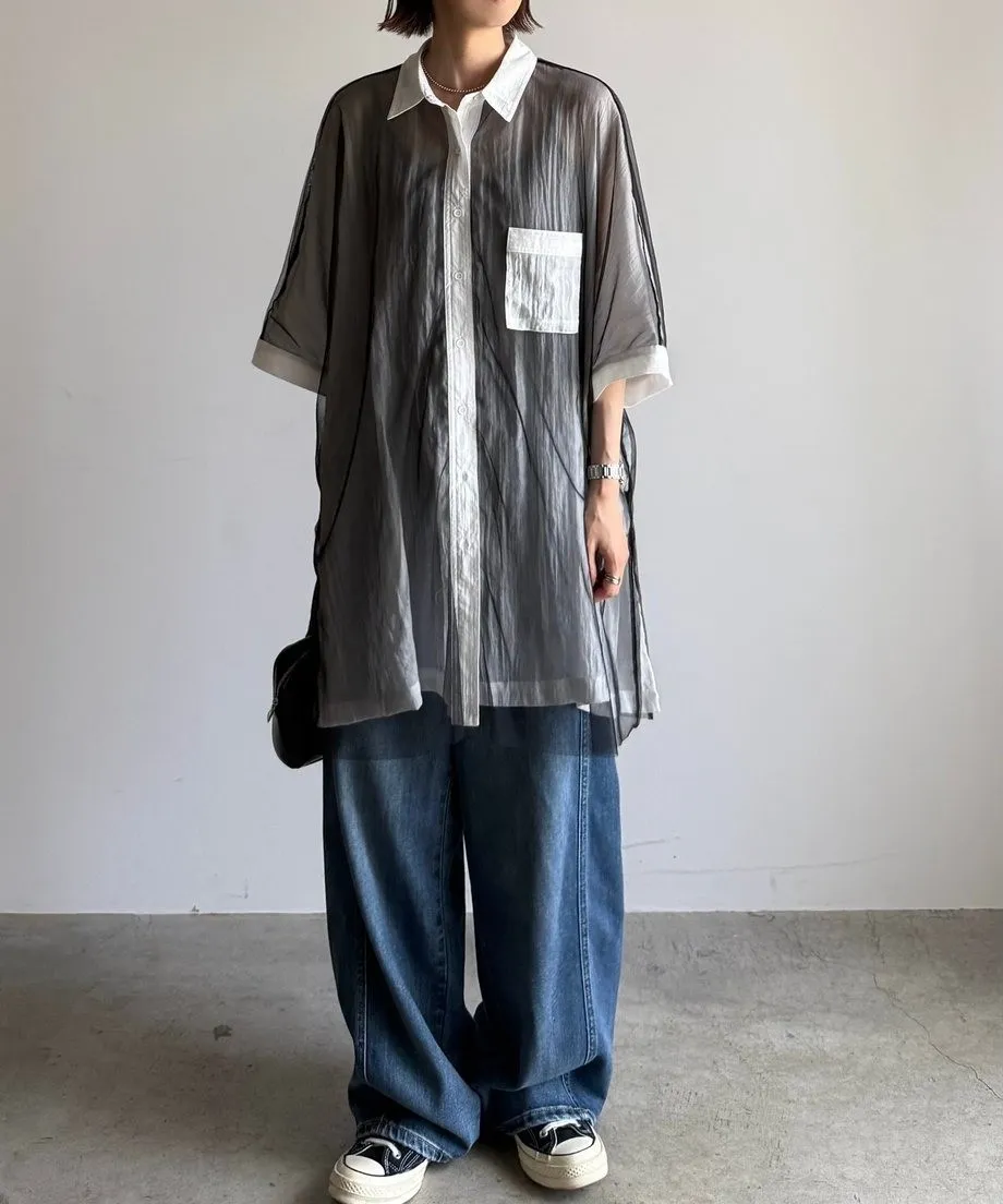日幣高單價~數量限定2個顏色~配色上都好好看這品牌很喜歡在襯衫上面做變化這件的配色搭配上很美面料質感很好~內襯衫棉布+外成網紗超級可愛小幫自己是買白色的<白口袋>中長板搭款度也穿褲或長度都很好看推薦入手精品等級襯衫真的很棒