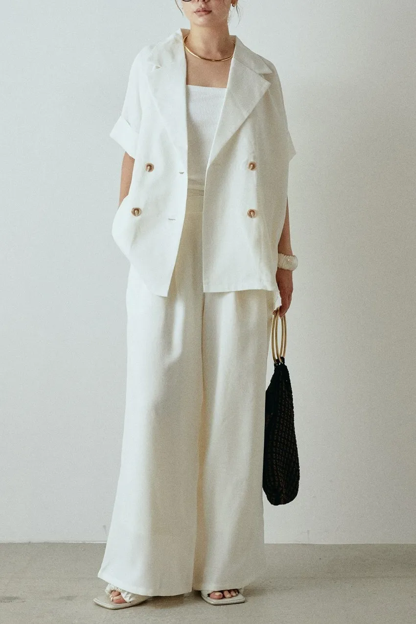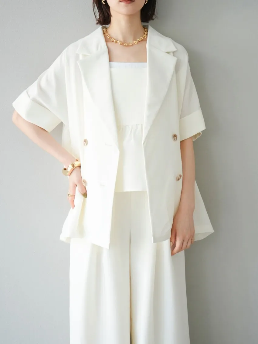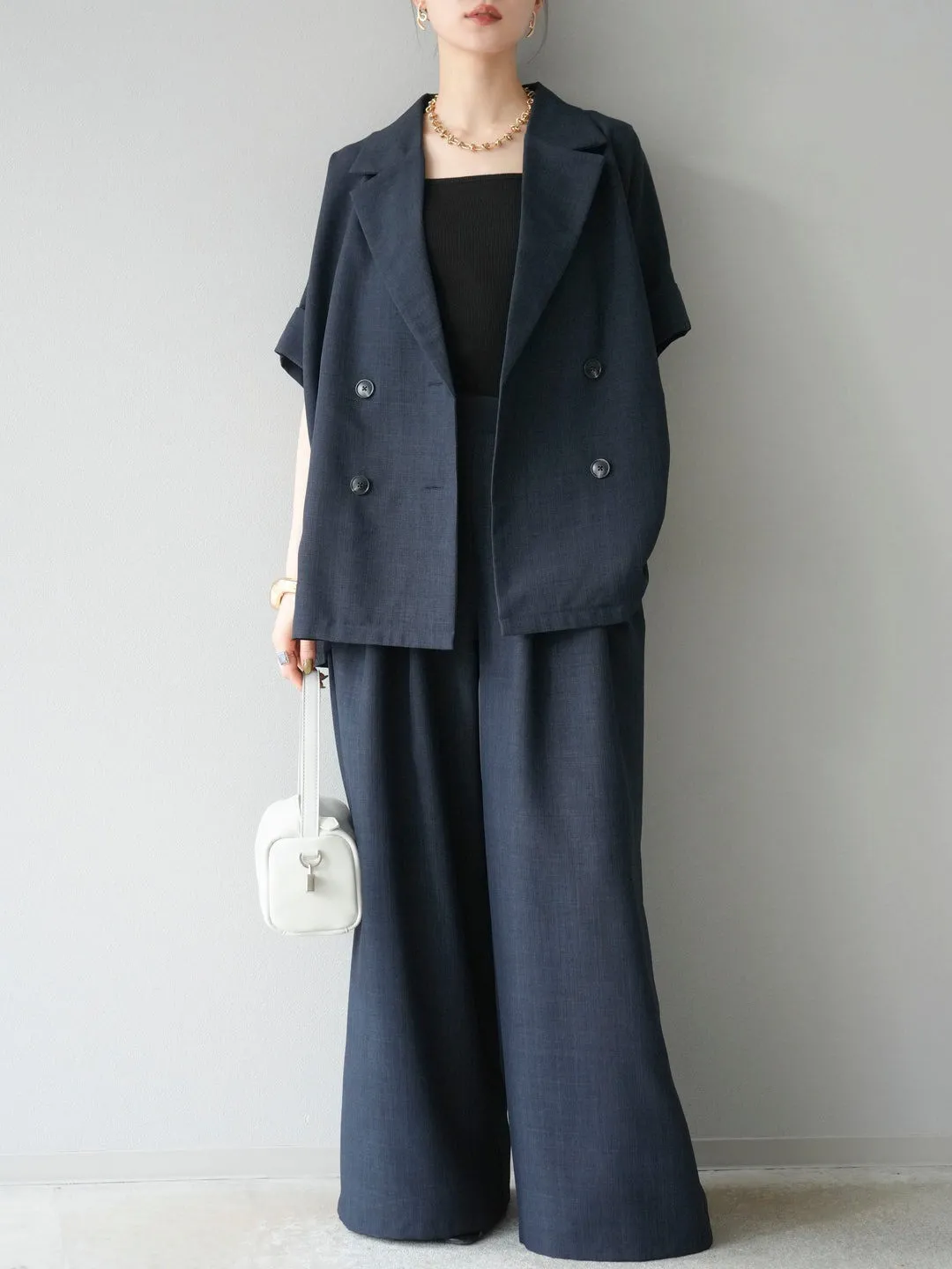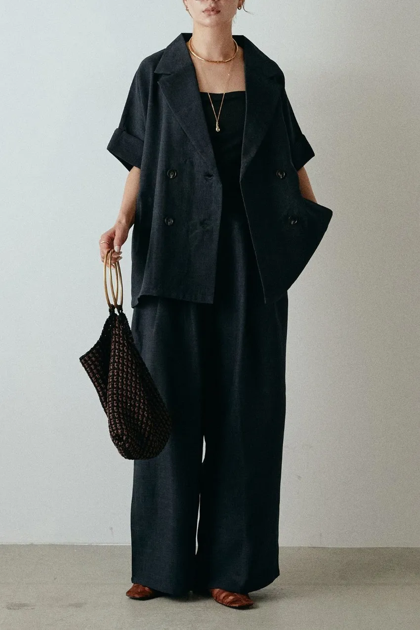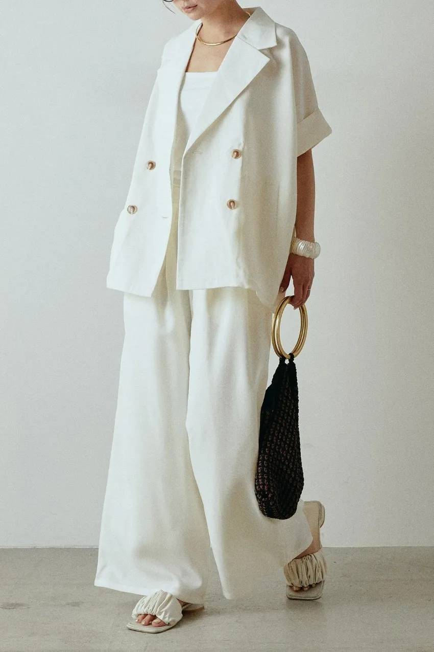 數量限定夏日大人氣的半袖西裝外套x西裝寬褲 這一款的表面有仿麻料自然線條紋路感設計順肩線短袖設計袖口反褶造型雙排釦寬鬆舒適感質感又帶有休閒感的西裝外套可以搭配正式風格穿搭或是日常休閒風格混搭這一款都很適合腰際打摺剪裁垂墜寬褲可以搭成套2色