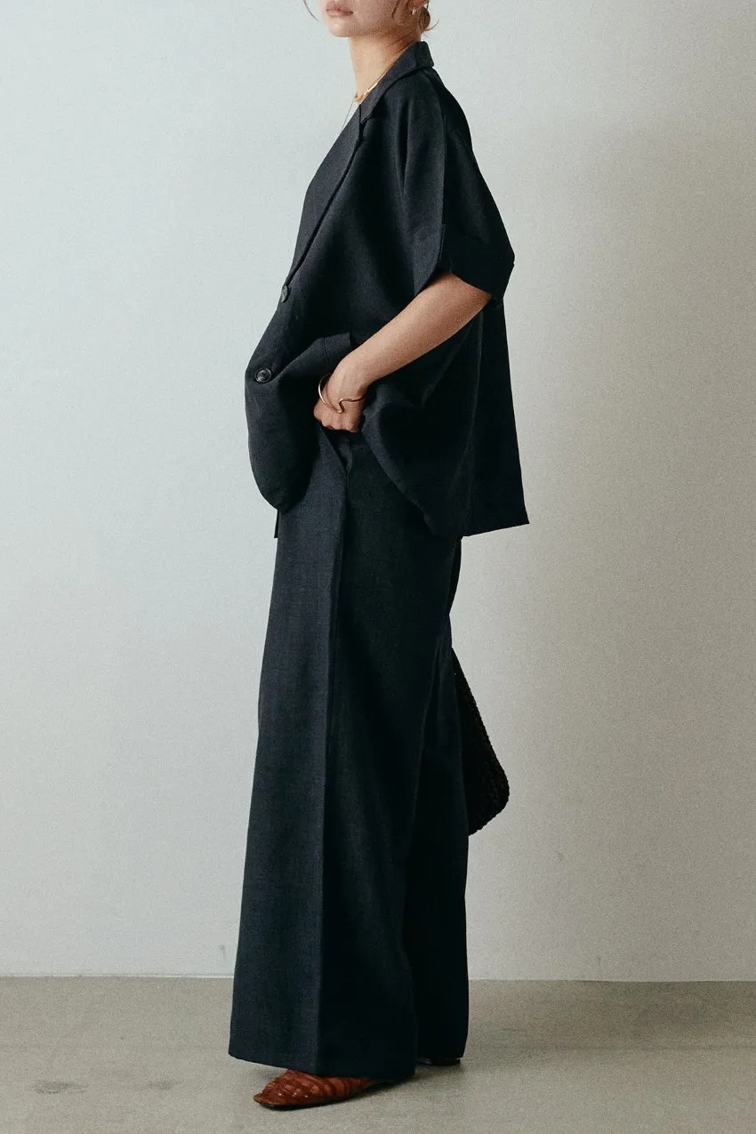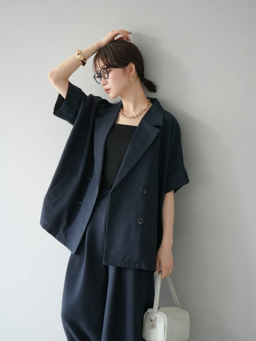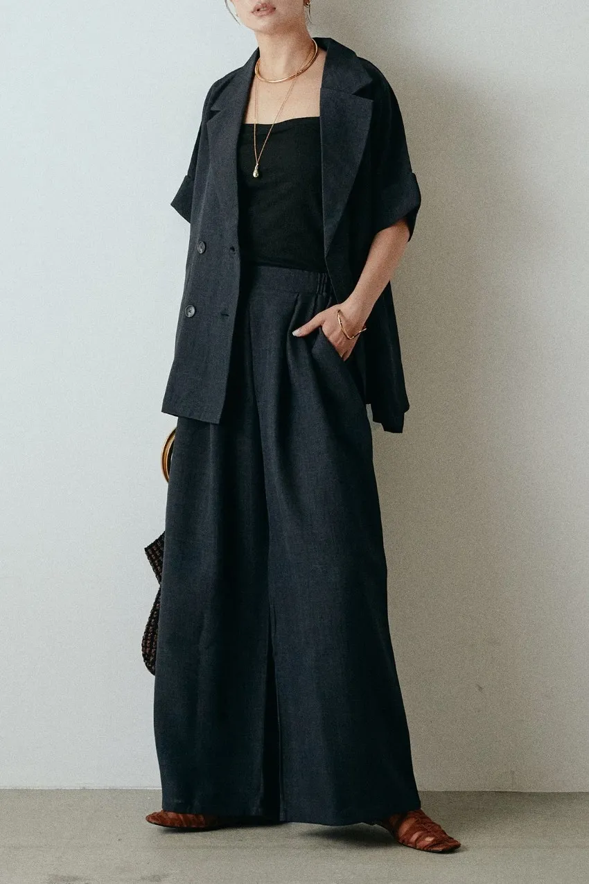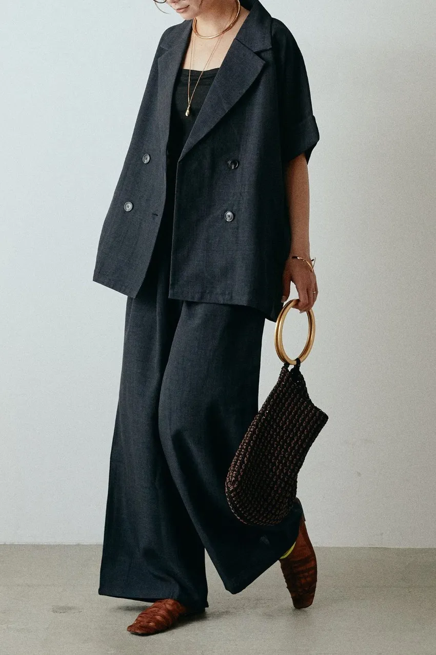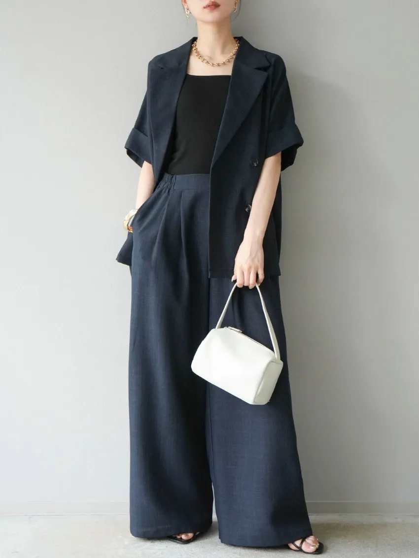 數量限定夏日大人氣的半袖西裝外套x西裝寬褲 這一款的表面有仿麻料自然線條紋路感設計順肩線短袖設計袖口反褶造型雙排釦寬鬆舒適感質感又帶有休閒感的西裝外套可以搭配正式風格穿搭或是日常休閒風格混搭這一款都很適合腰際打摺剪裁垂墜寬褲可以搭成套2色