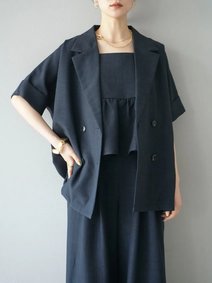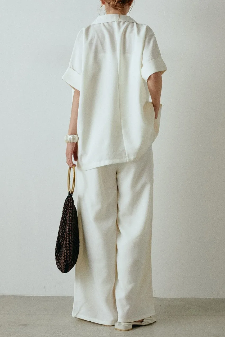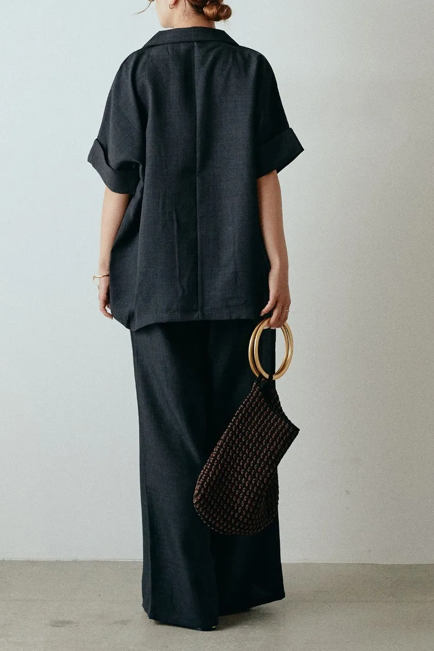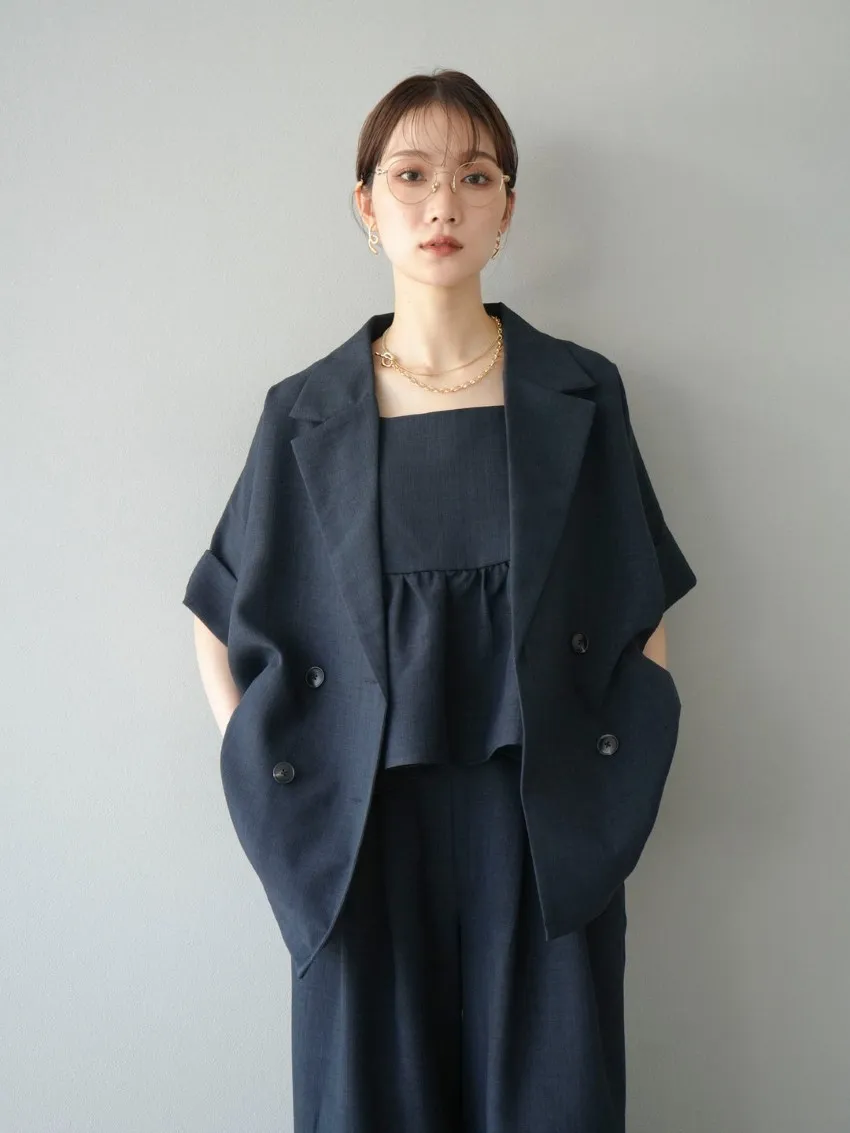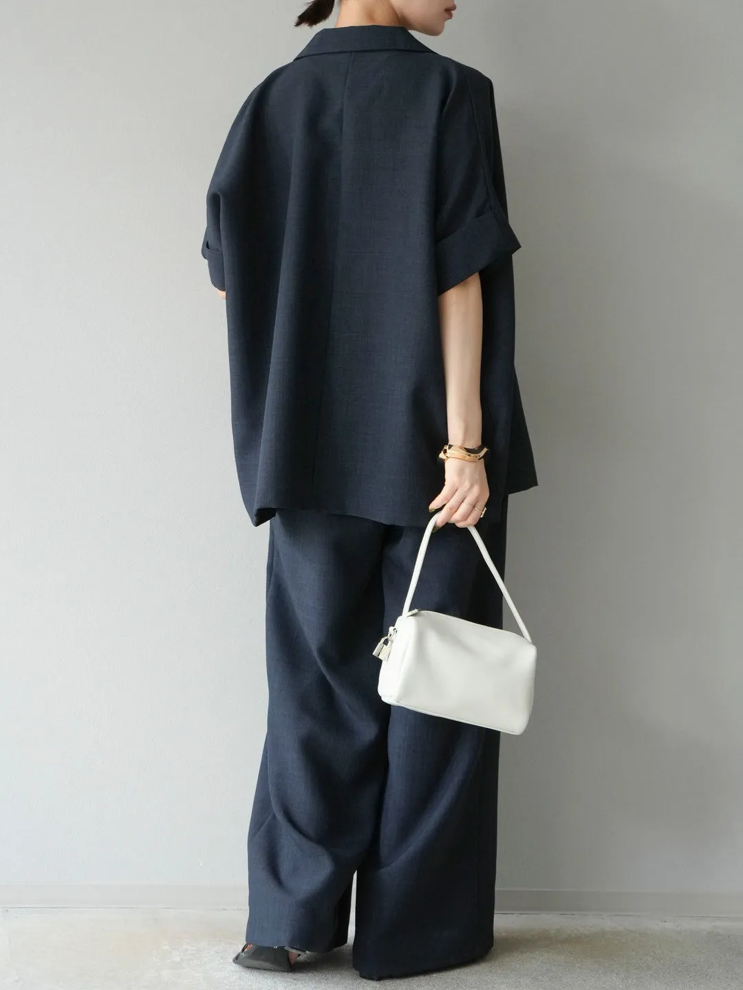 數量限定夏日大人氣的半袖西裝外套x西裝寬褲 這一款的表面有仿麻料自然線條紋路感設計順肩線短袖設計袖口反褶造型雙排釦寬鬆舒適感質感又帶有休閒感的西裝外套可以搭配正式風格穿搭或是日常休閒風格混搭這一款都很適合腰際打摺剪裁垂墜寬褲可以搭成套2色
