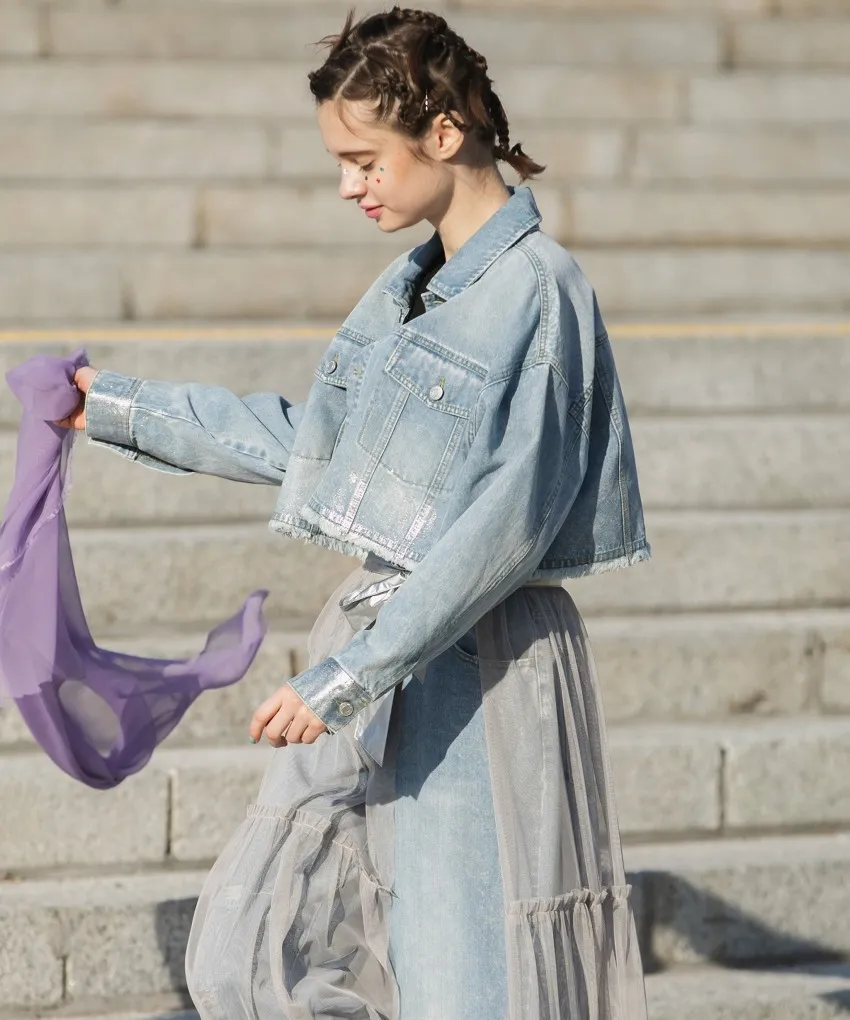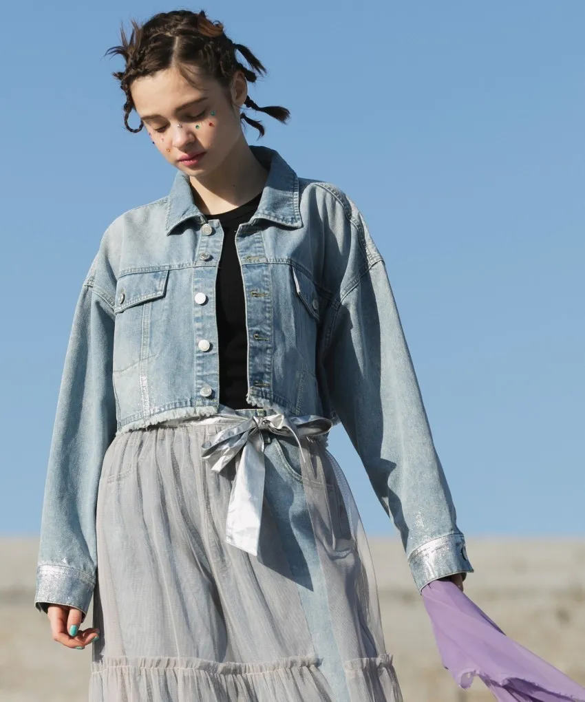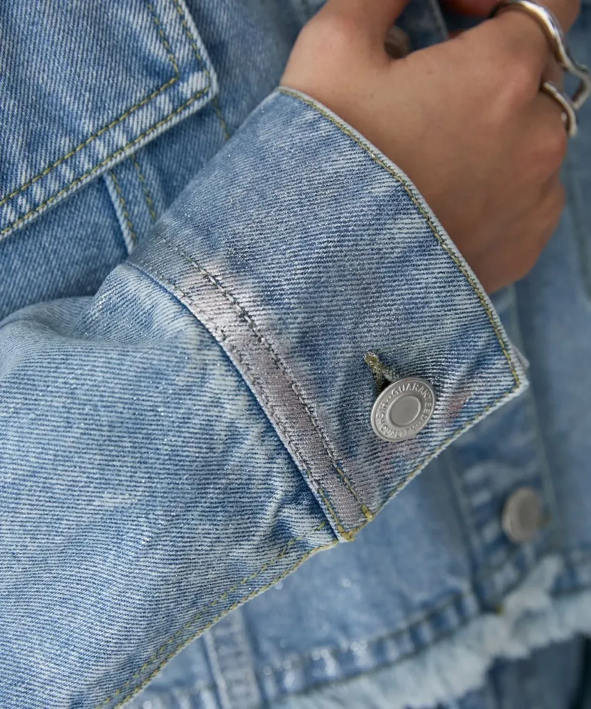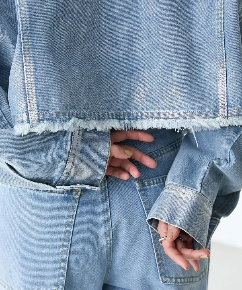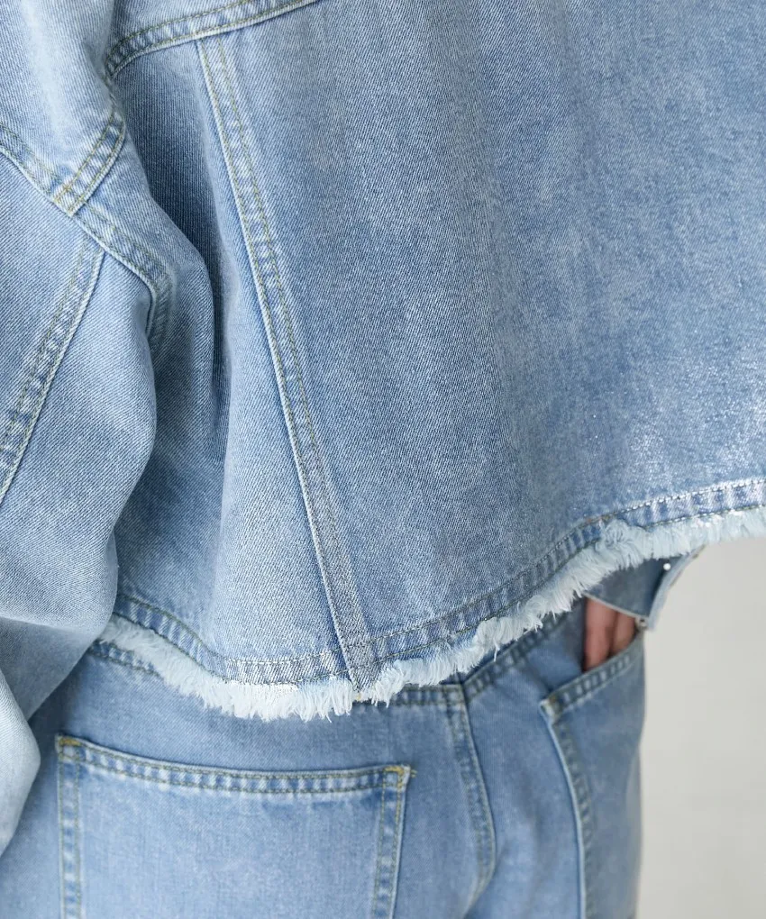 淺藍色有下擺跟袖口搭配銀箔斑駁加工設計