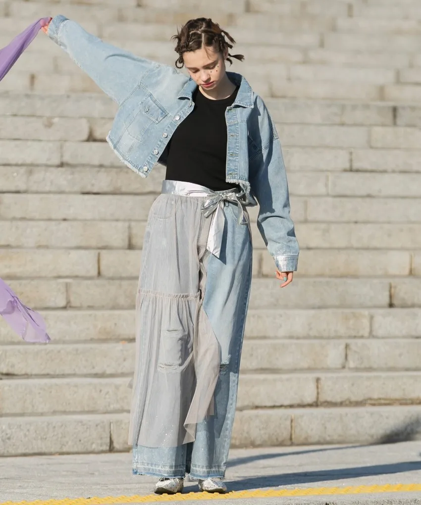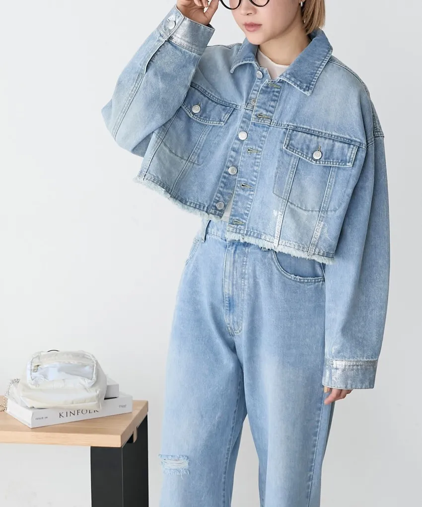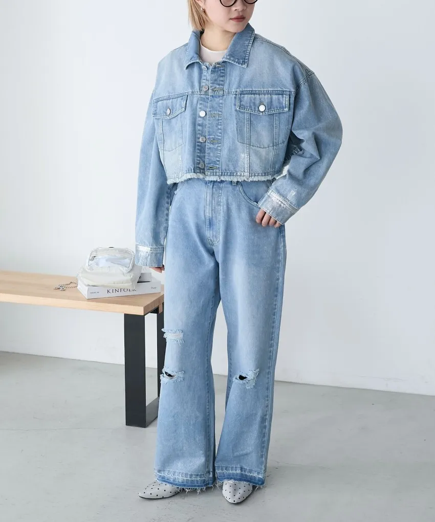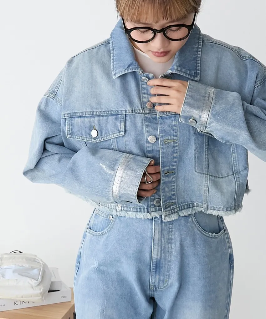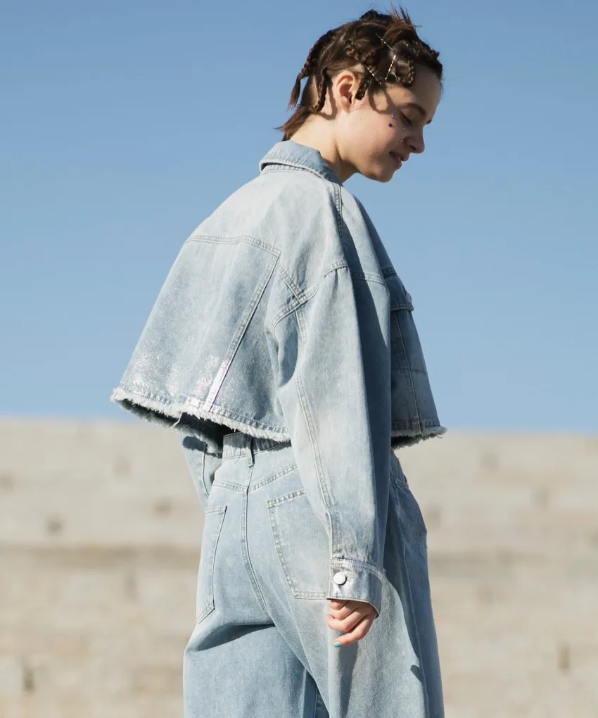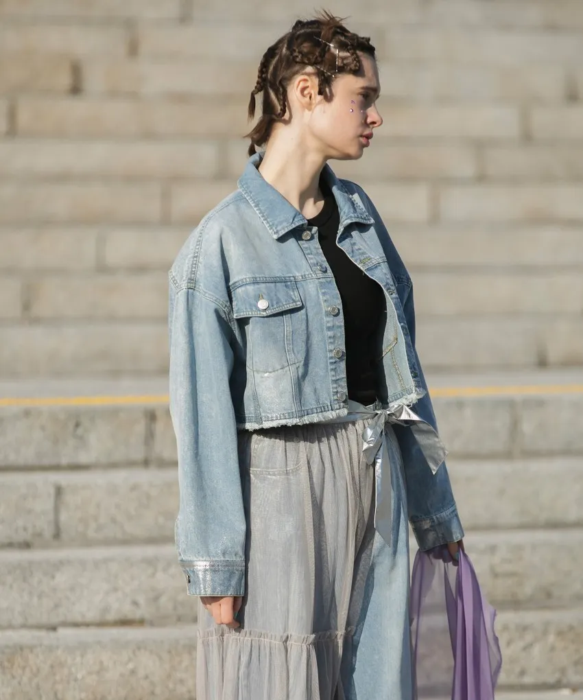 淺藍色有下擺跟袖口搭配銀箔斑駁加工設計