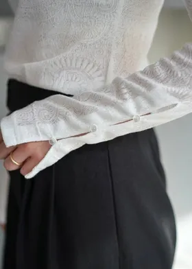 品牌高單價~精緻圖騰合身蕾絲開岔袖口造型上衣