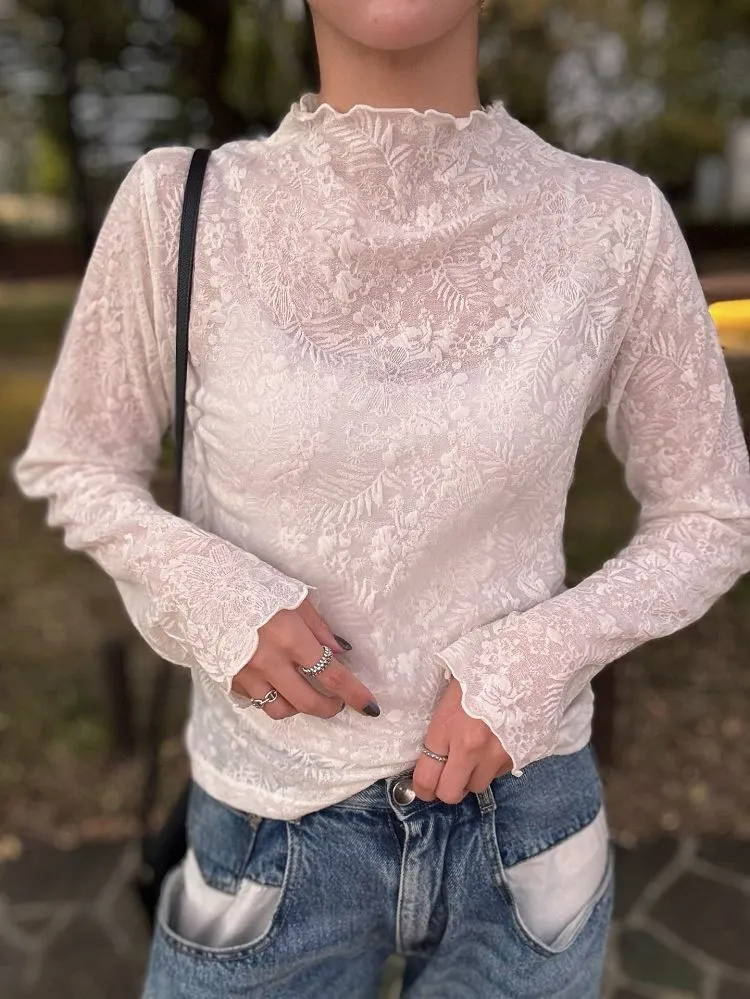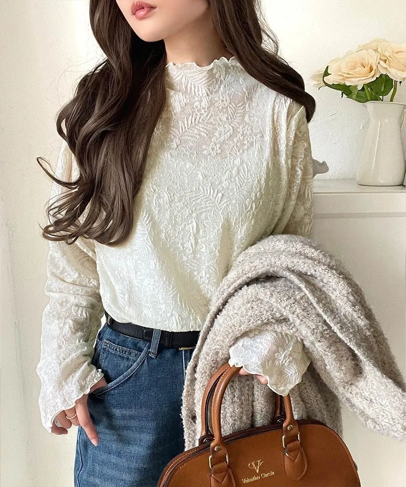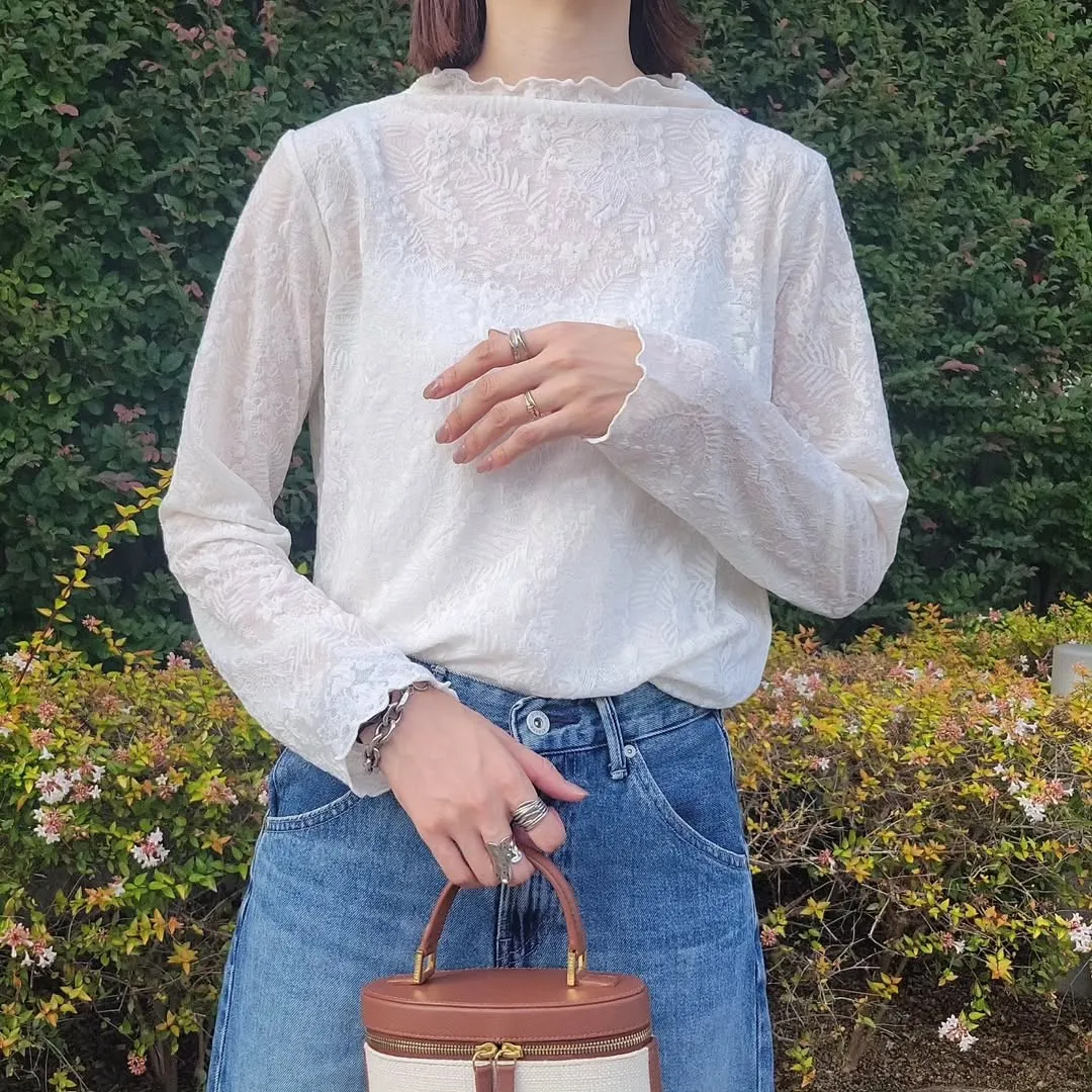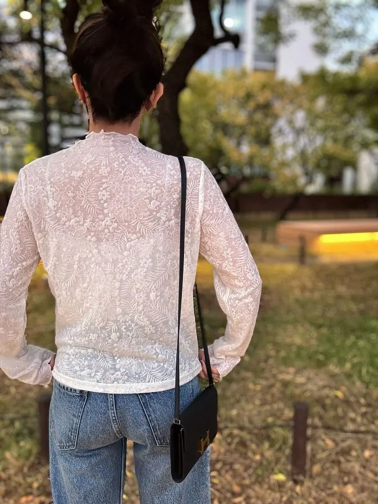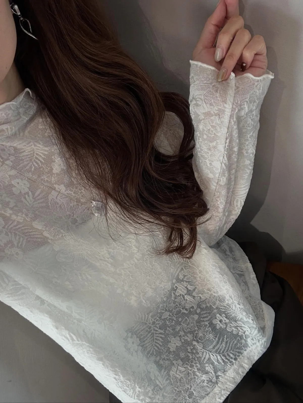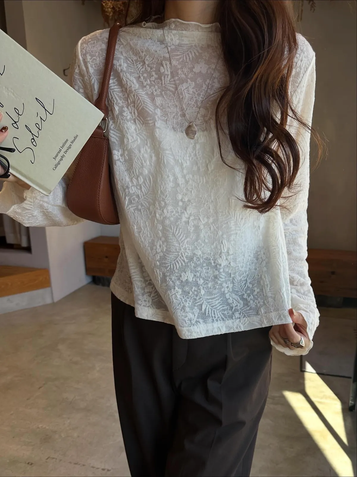 精緻感透膚蕾絲壓紋花瓣領口上衣