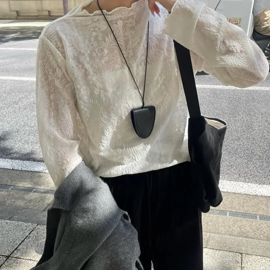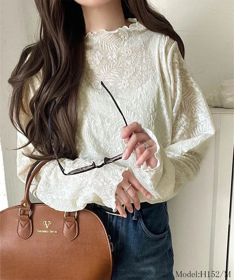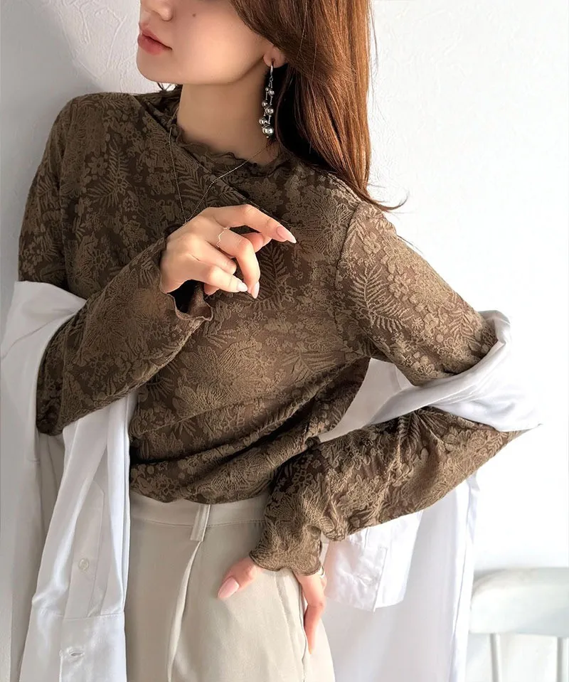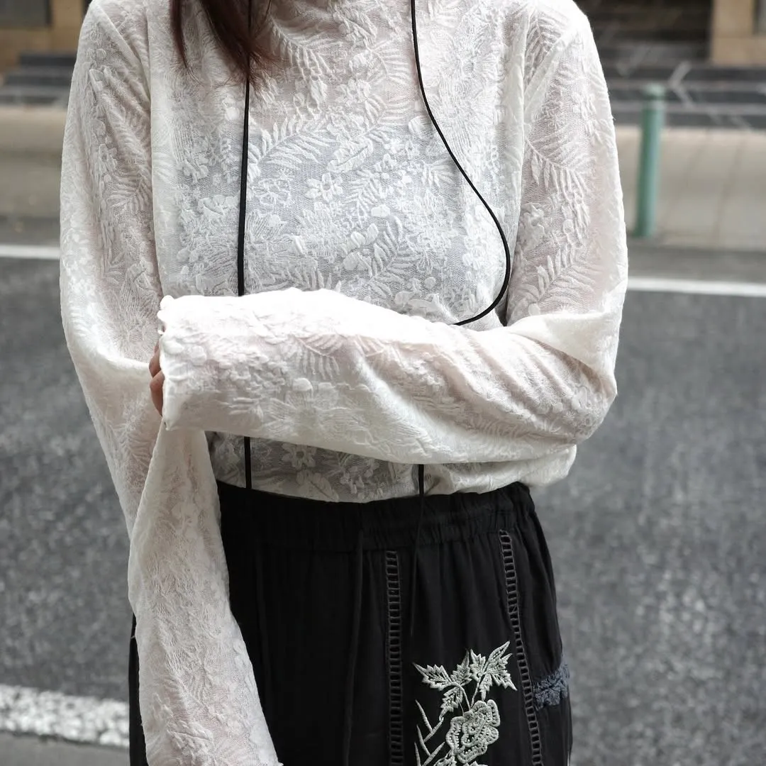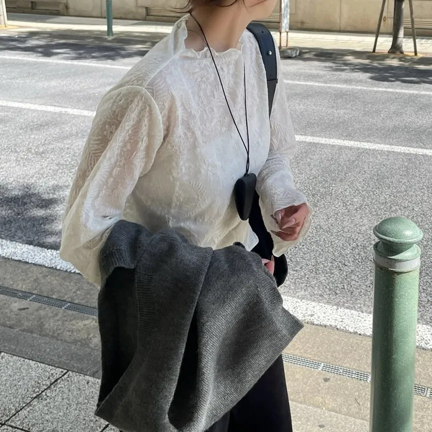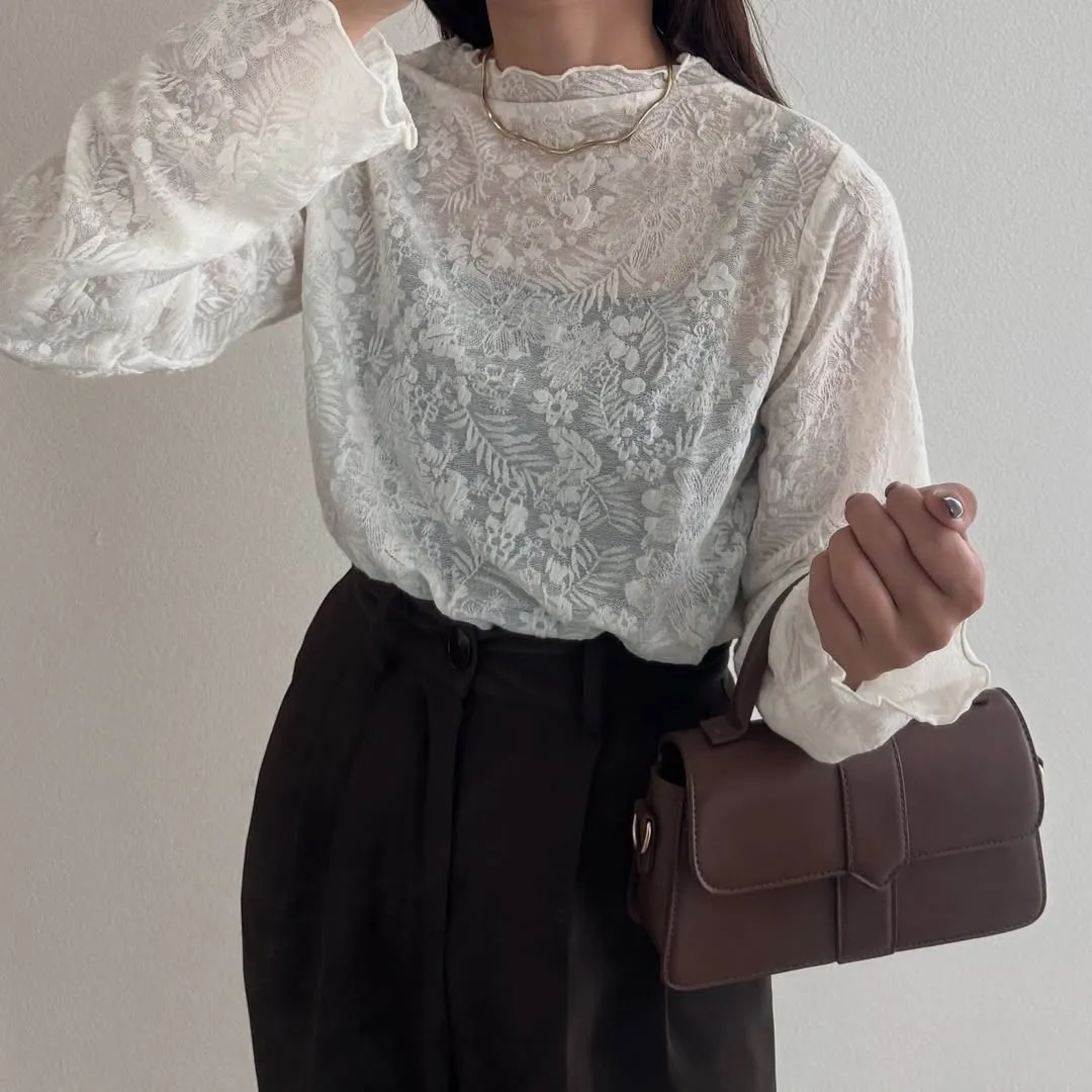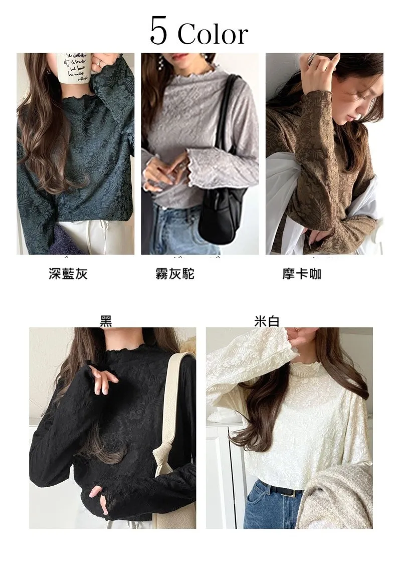 精緻感透膚蕾絲壓紋花瓣領口上衣