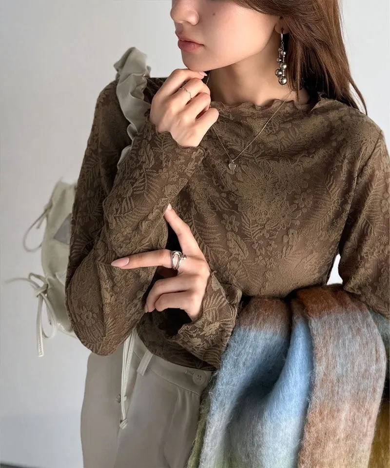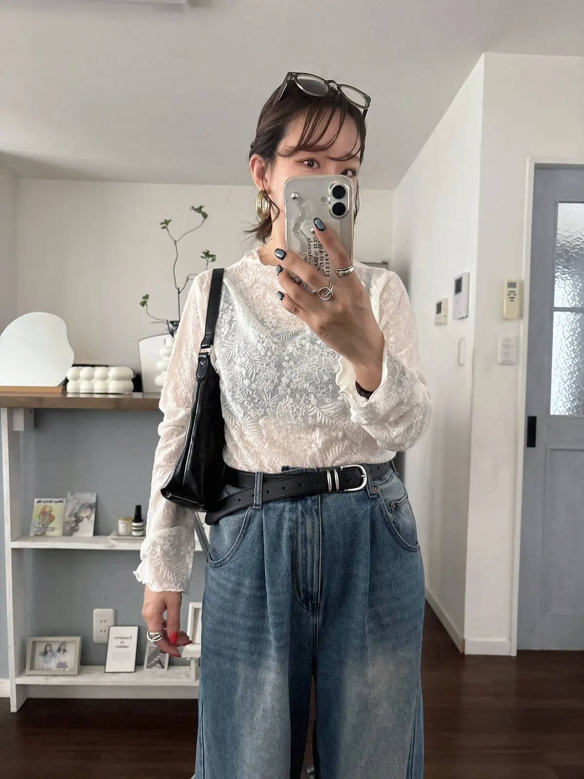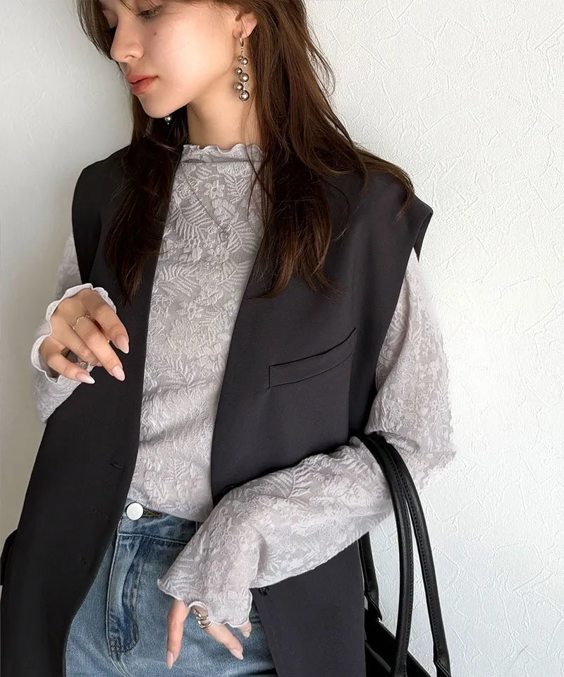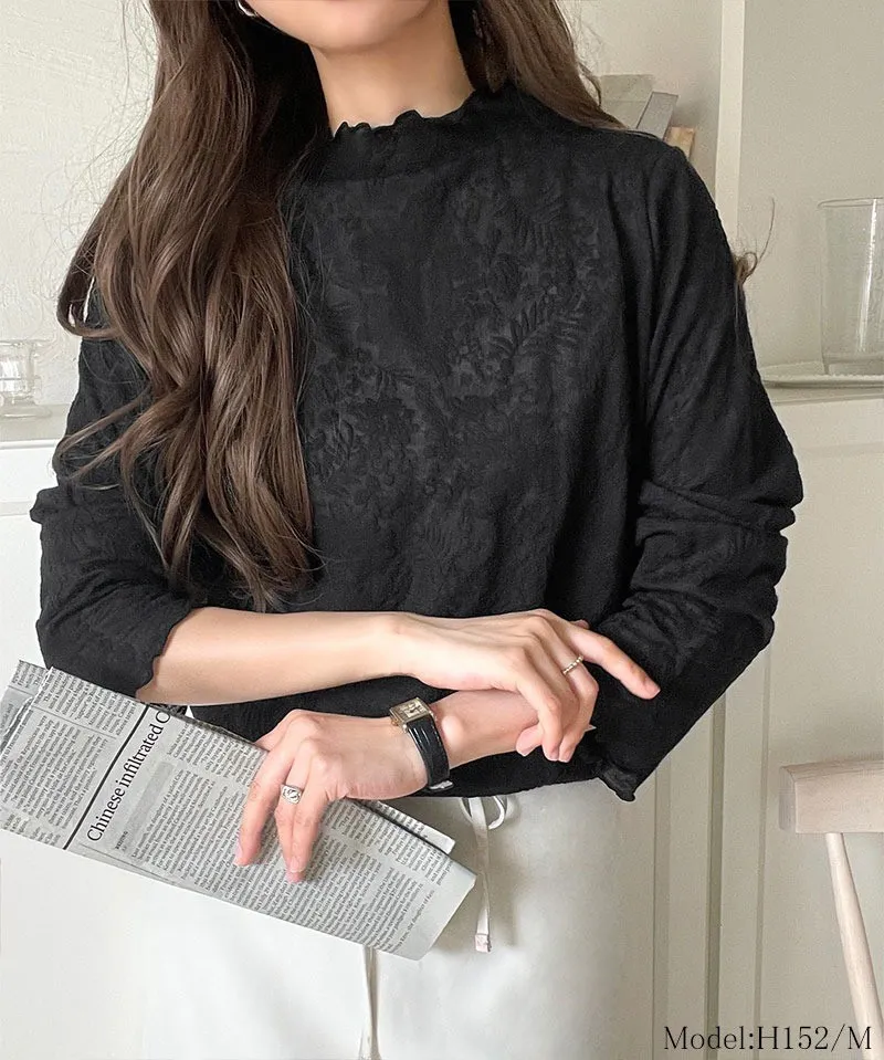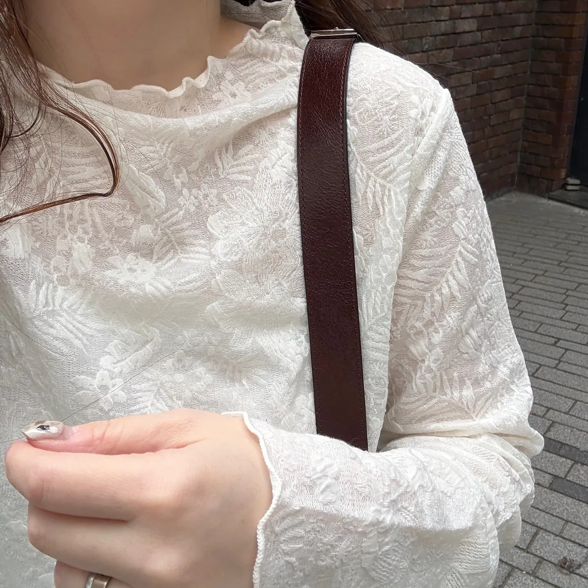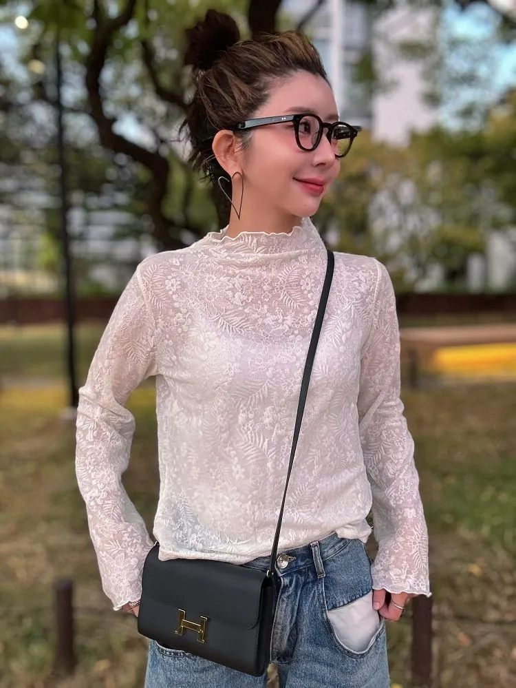 精緻感透膚蕾絲壓紋花瓣領口上衣
