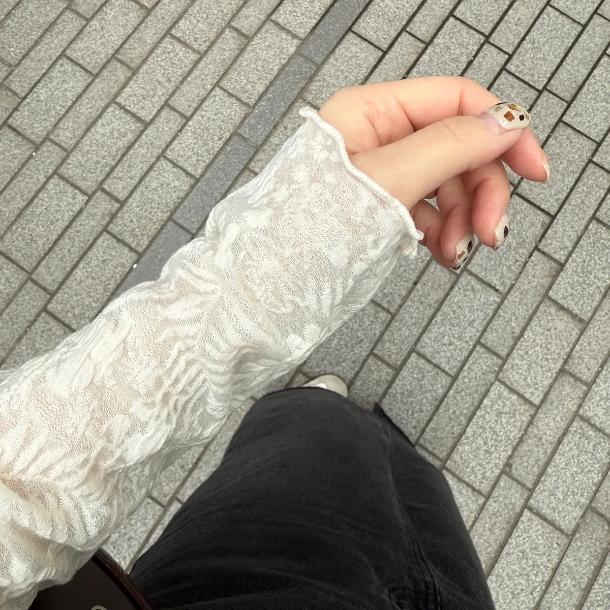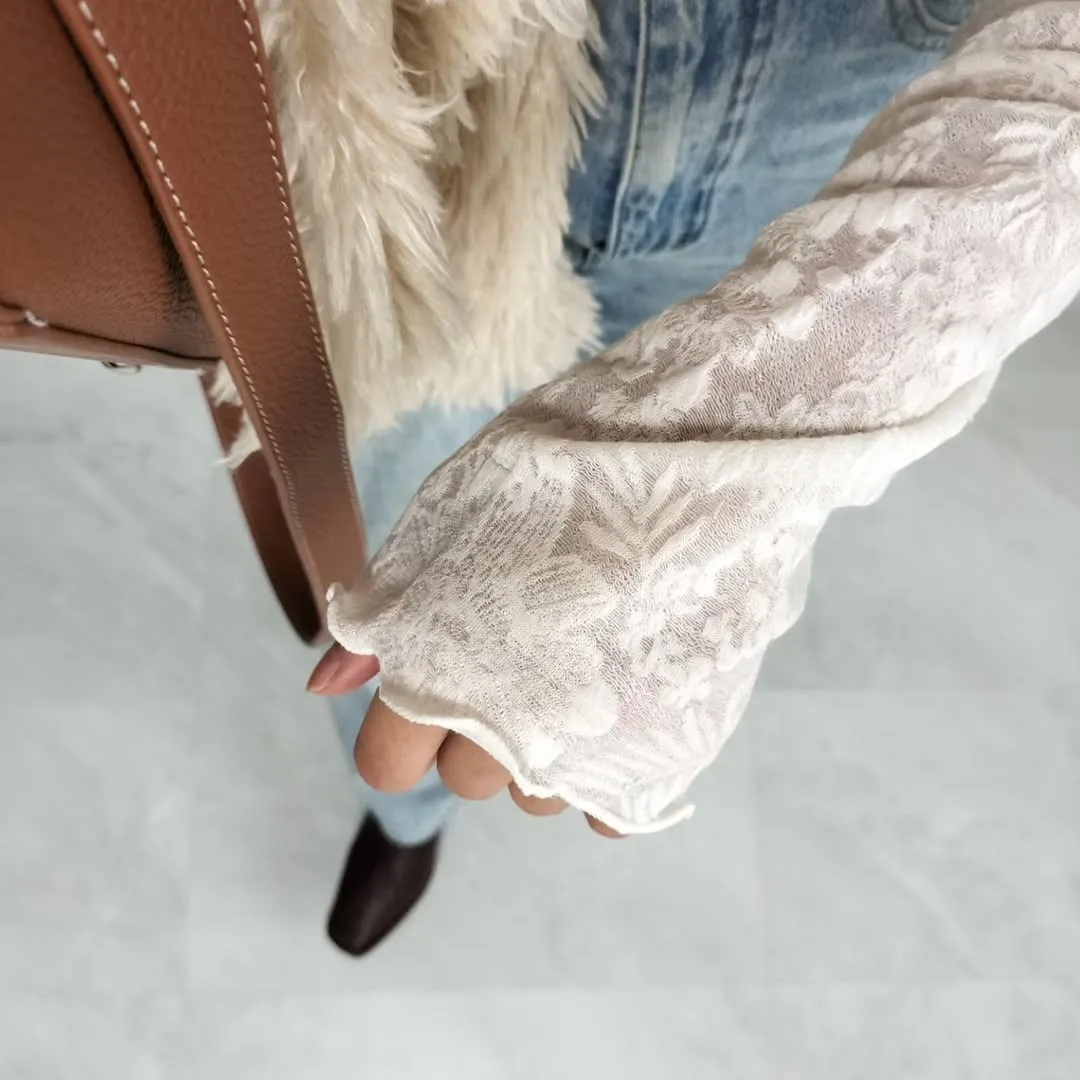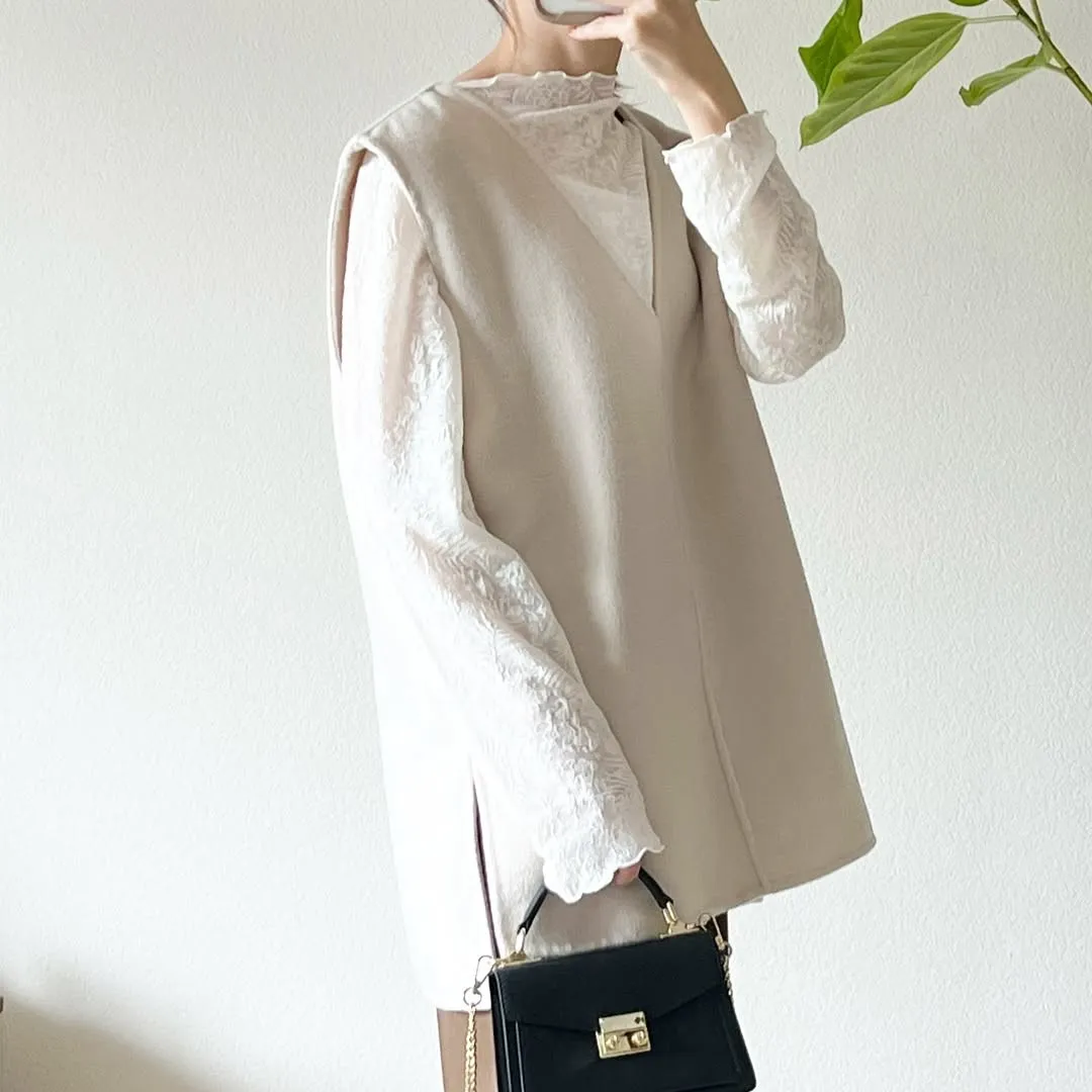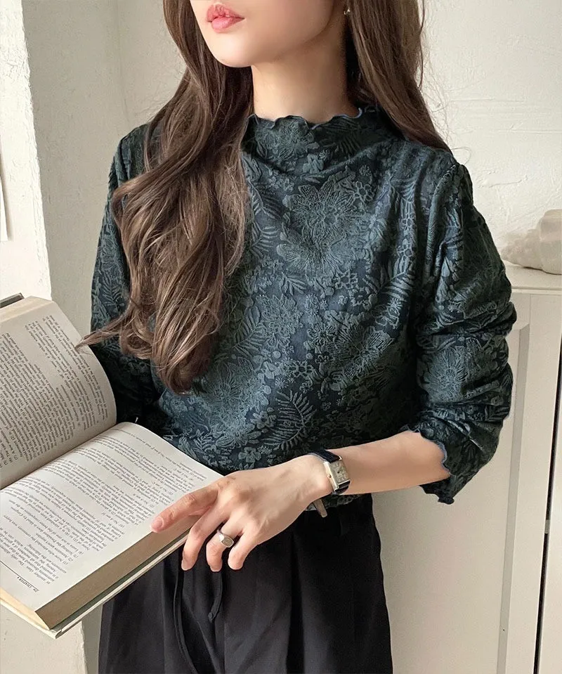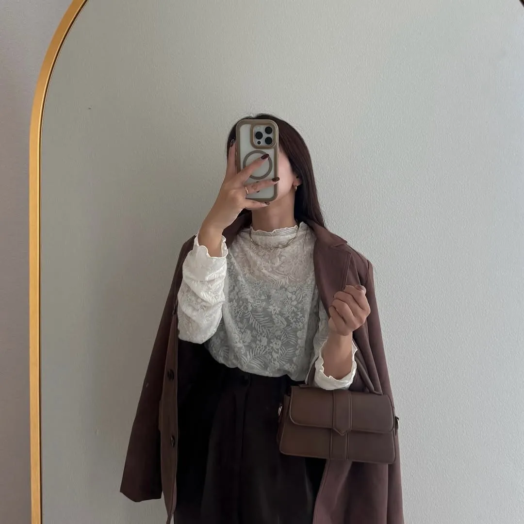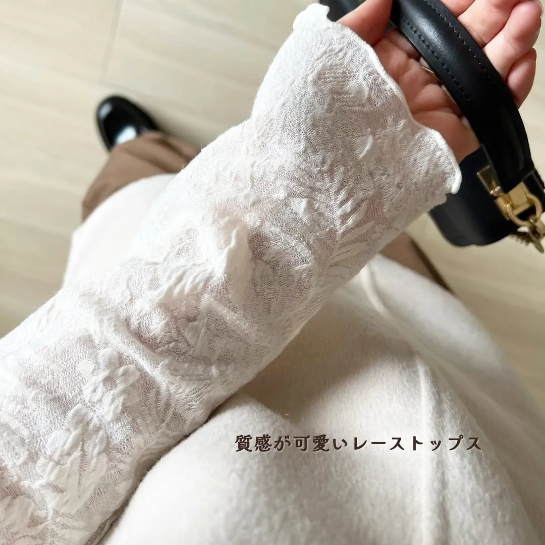 精緻感透膚蕾絲壓紋花瓣領口上衣