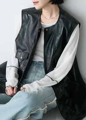 限定特價~超值!!工裝造型寬版皮革夾克背心