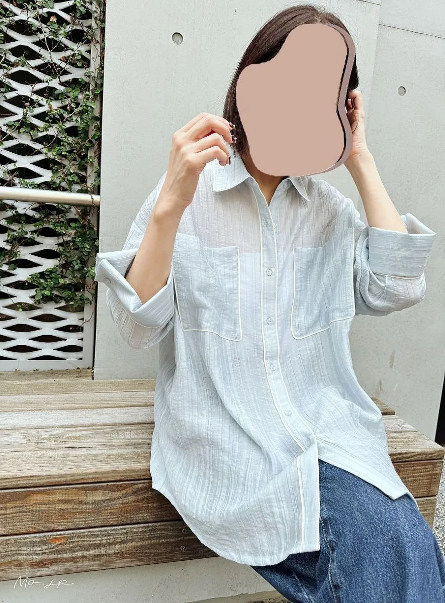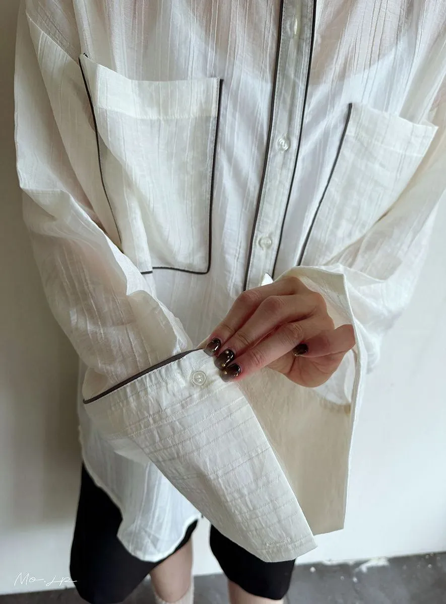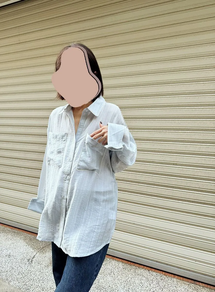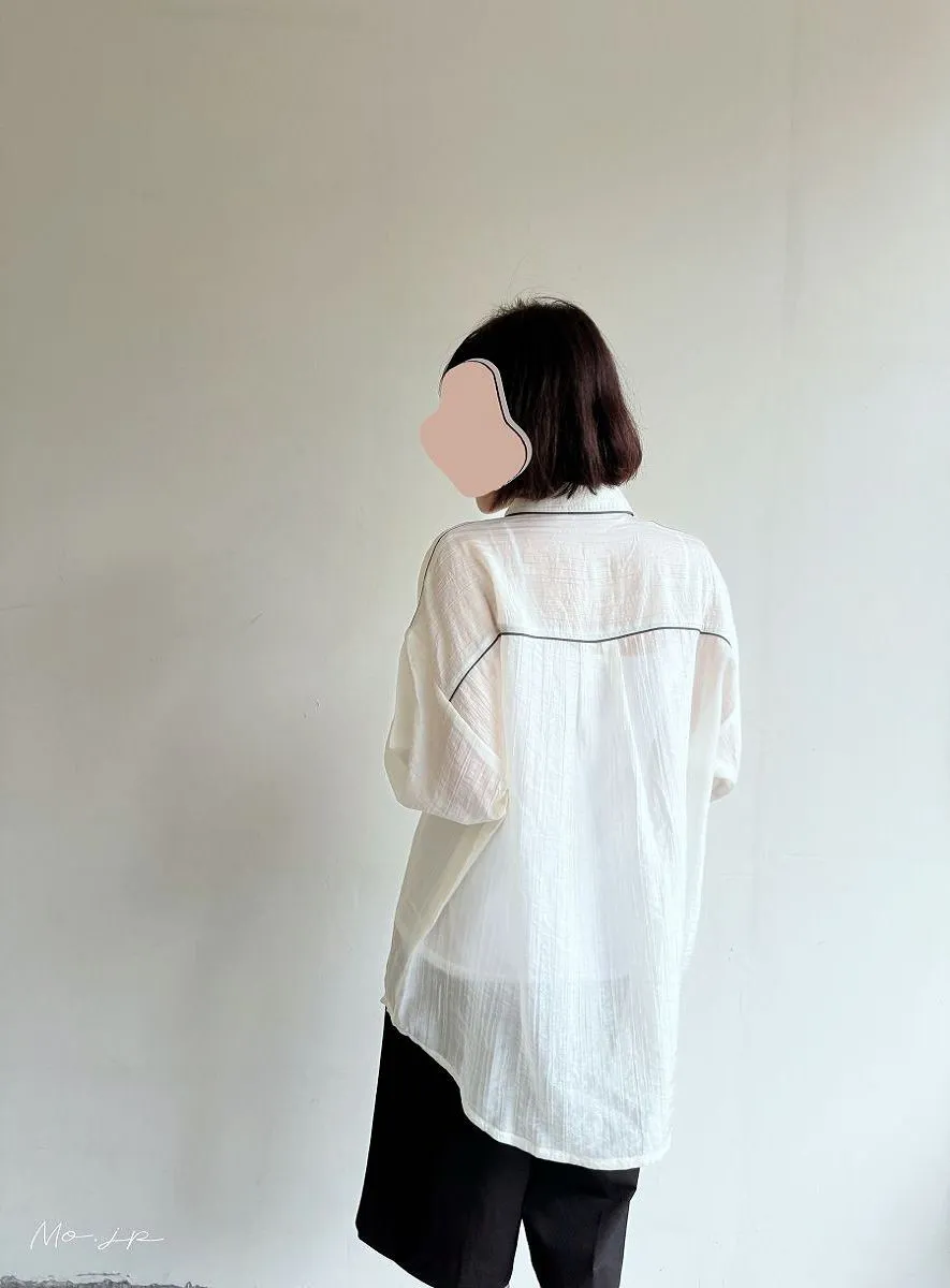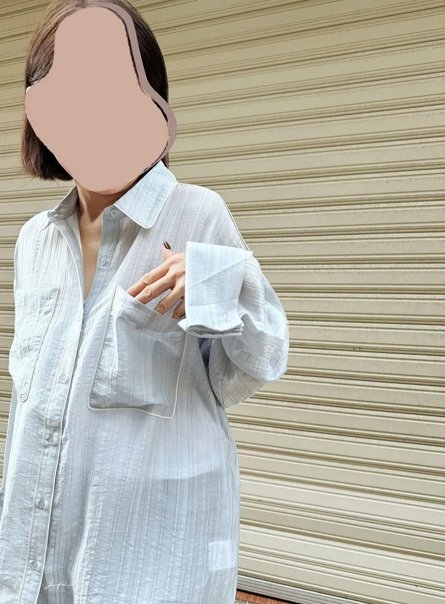 小幫自留水藍/米白光面料就非常有質感它是有立體的紋路~微微的霧面光澤立體紋路~超級美利用線條立體滾邊~好好看中長版~面料軟有墜度~非常舒服喔微透~建議內搭或搭配BRA TOP真心美的一款襯衫~專櫃折扣請入手請注意它的手部設計~超級好看喔手部設計加長~完美設計感如果反折又更美~真的超級推薦
