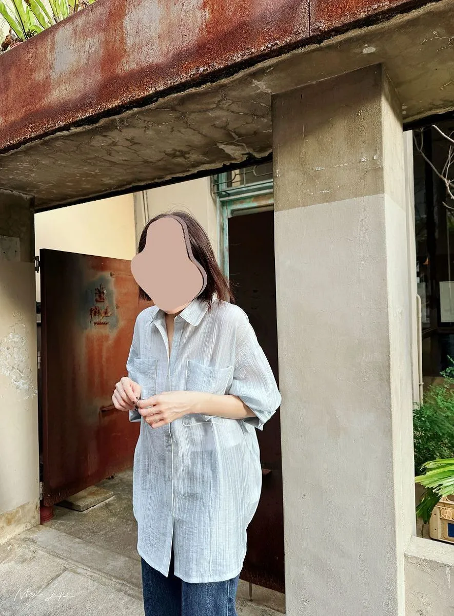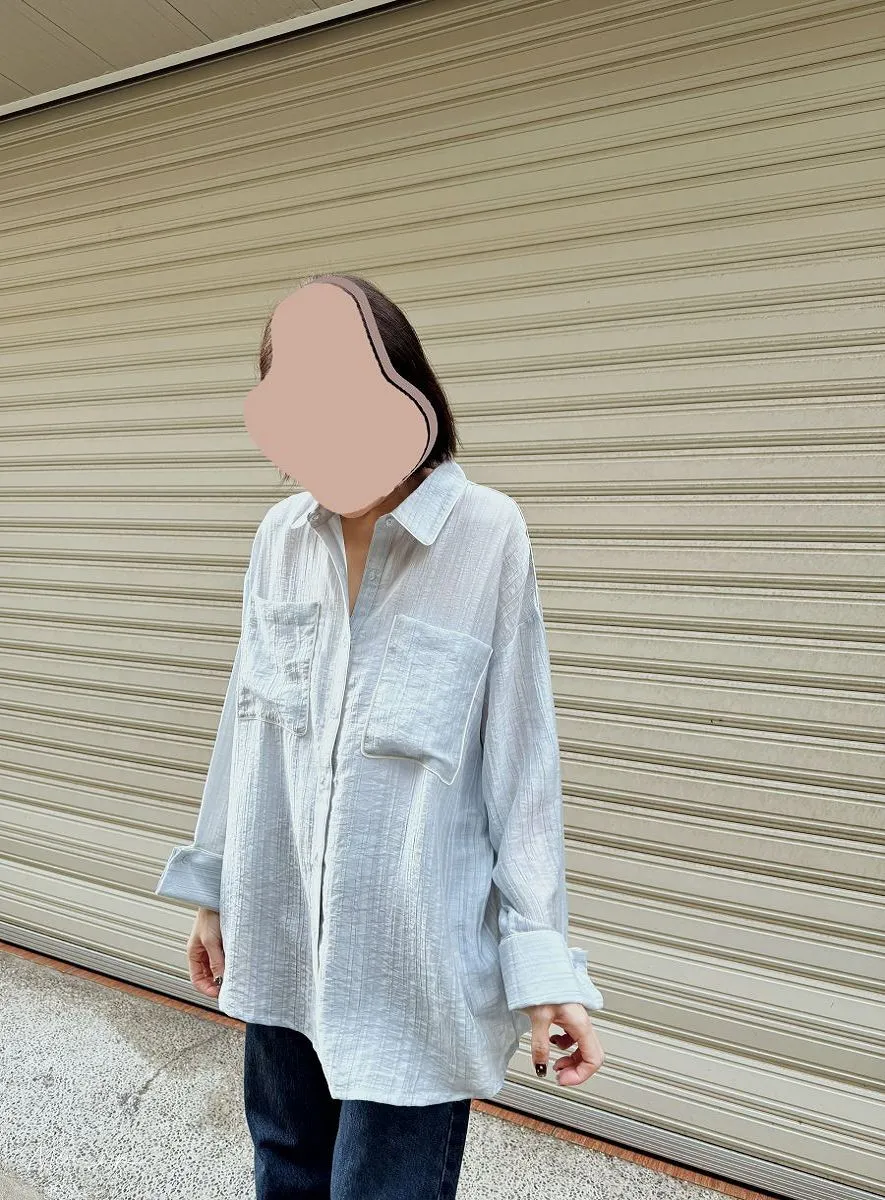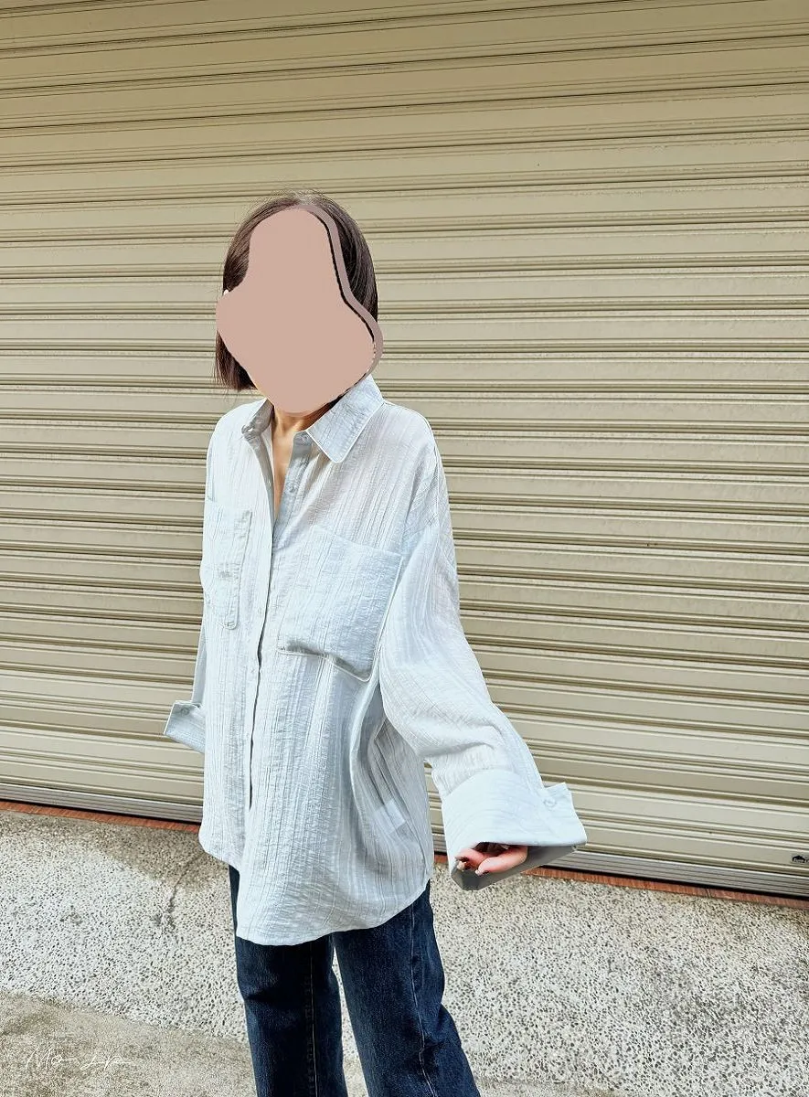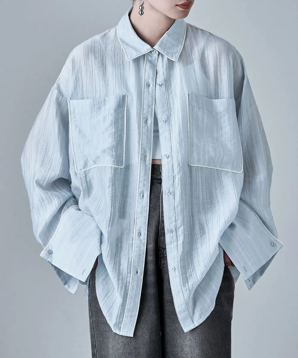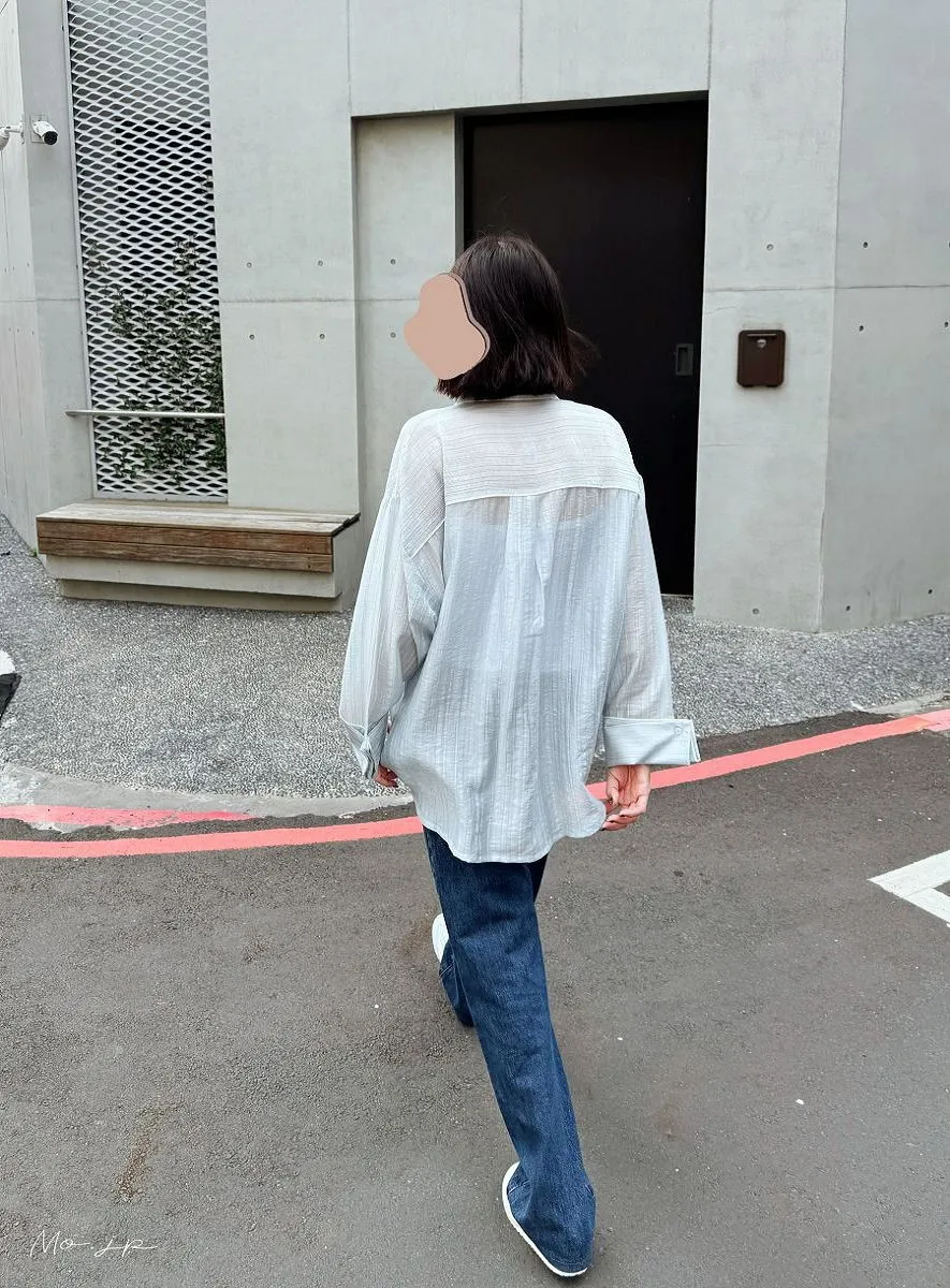小幫自留水藍/米白光面料就非常有質感它是有立體的紋路~微微的霧面光澤立體紋路~超級美利用線條立體滾邊~好好看中長版~面料軟有墜度~非常舒服喔微透~建議內搭或搭配BRA TOP真心美的一款襯衫~專櫃折扣請入手請注意它的手部設計~超級好看喔手部設計加長~完美設計感如果反折又更美~真的超級推薦