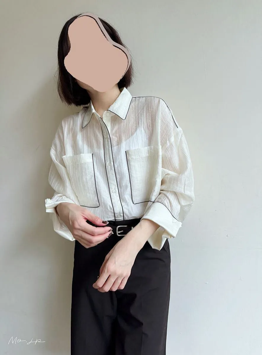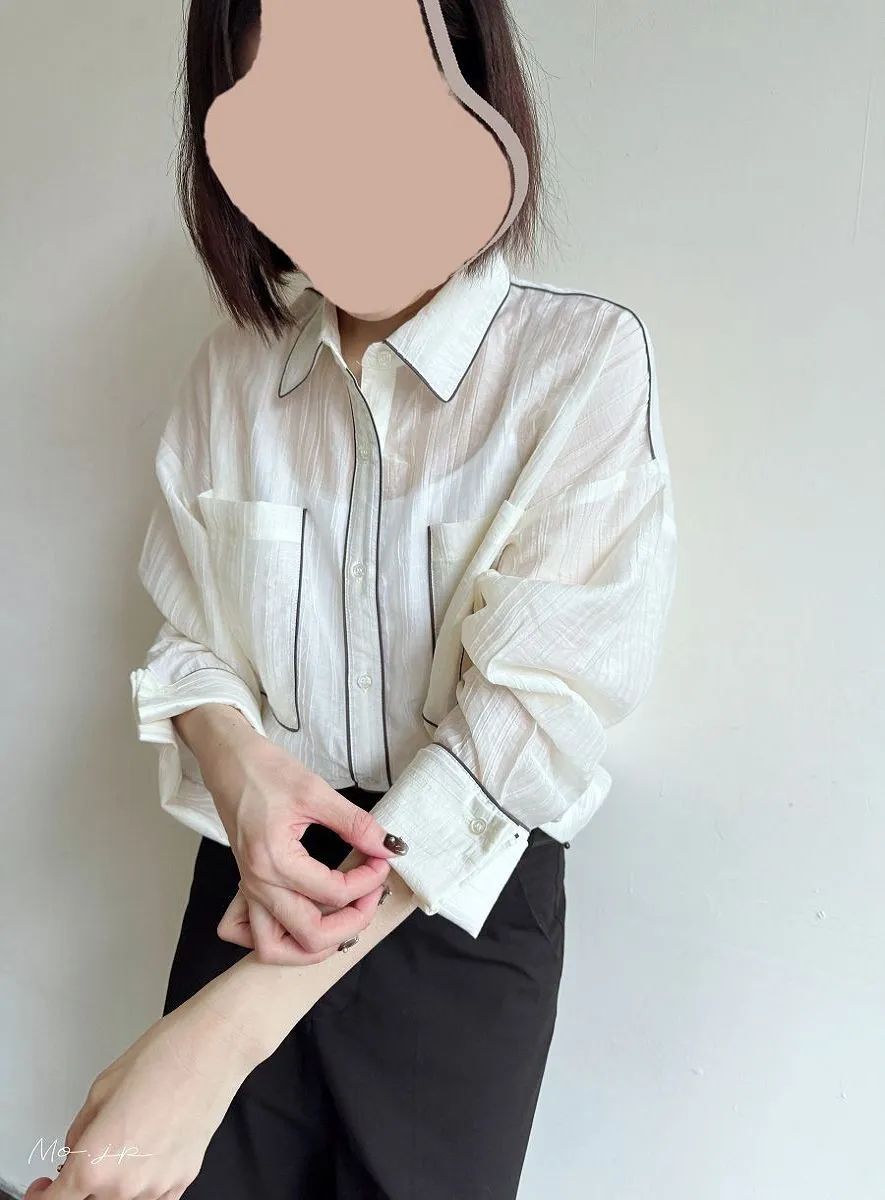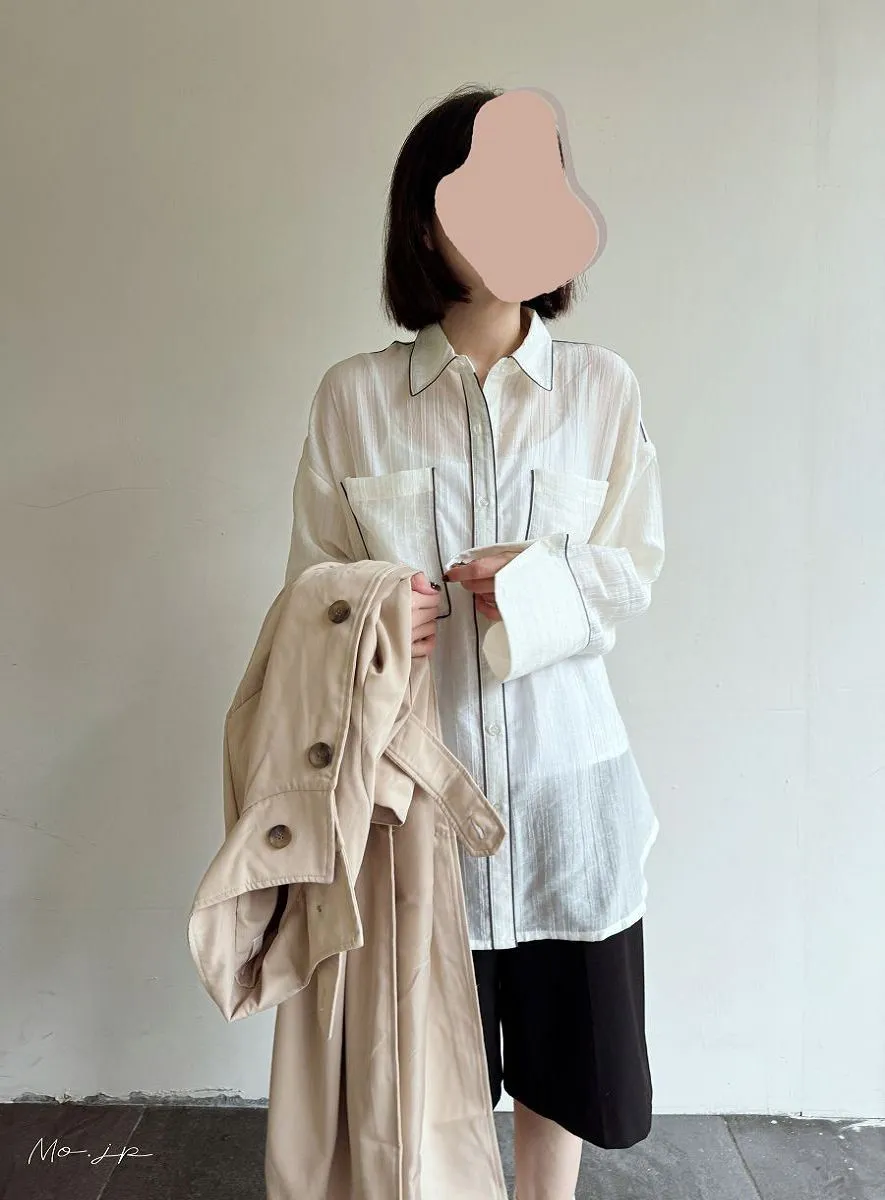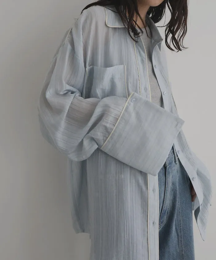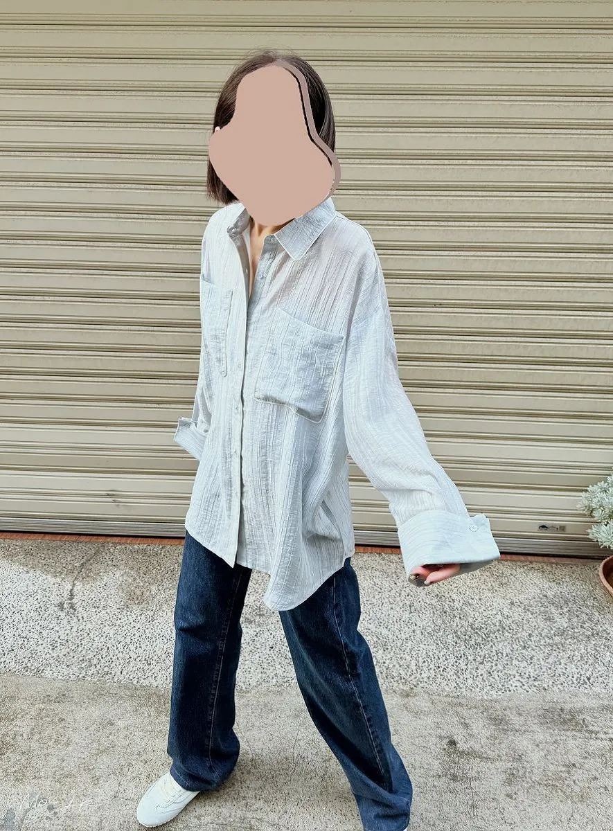 小幫自留水藍/米白光面料就非常有質感它是有立體的紋路~微微的霧面光澤立體紋路~超級美利用線條立體滾邊~好好看中長版~面料軟有墜度~非常舒服喔微透~建議內搭或搭配BRA TOP真心美的一款襯衫~專櫃折扣請入手請注意它的手部設計~超級好看喔手部設計加長~完美設計感如果反折又更美~真的超級推薦