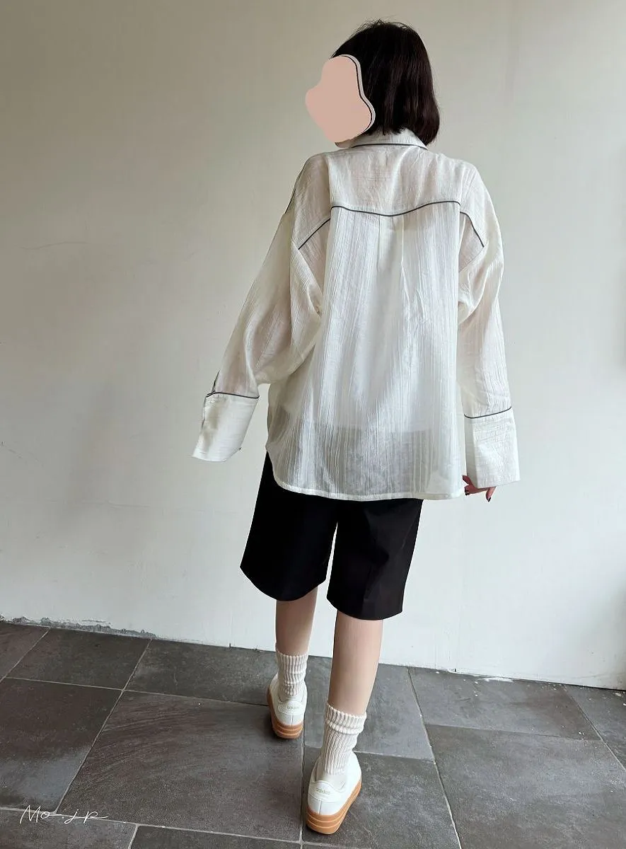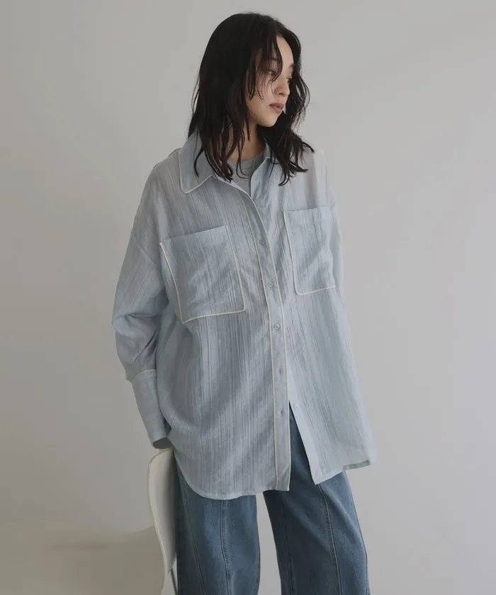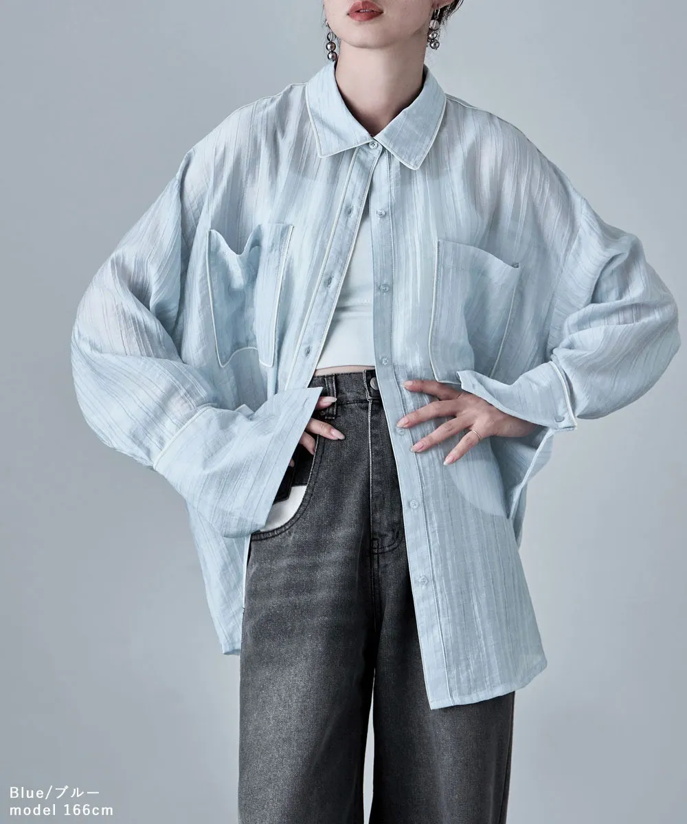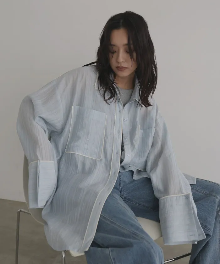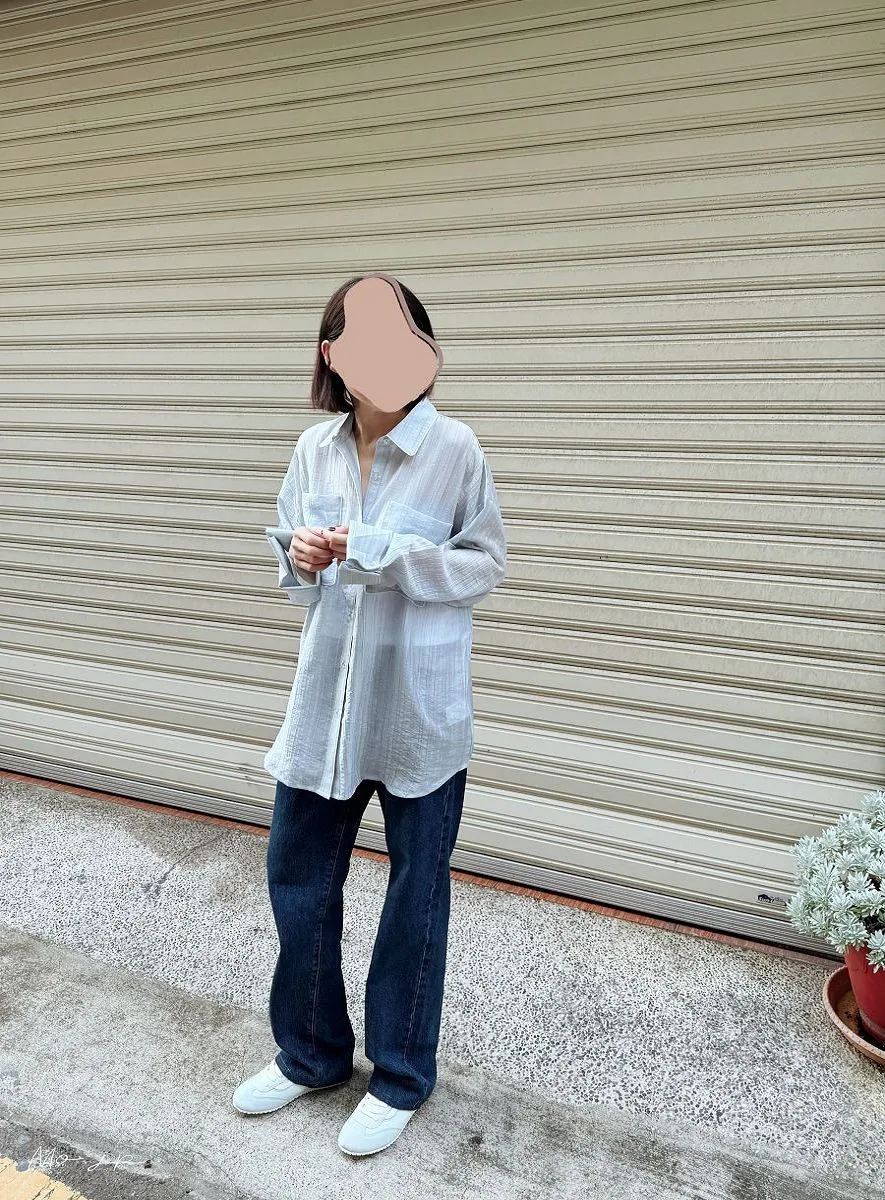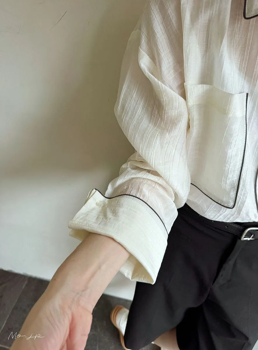 小幫自留水藍/米白光面料就非常有質感它是有立體的紋路~微微的霧面光澤立體紋路~超級美利用線條立體滾邊~好好看中長版~面料軟有墜度~非常舒服喔微透~建議內搭或搭配BRA TOP真心美的一款襯衫~專櫃折扣請入手請注意它的手部設計~超級好看喔手部設計加長~完美設計感如果反折又更美~真的超級推薦