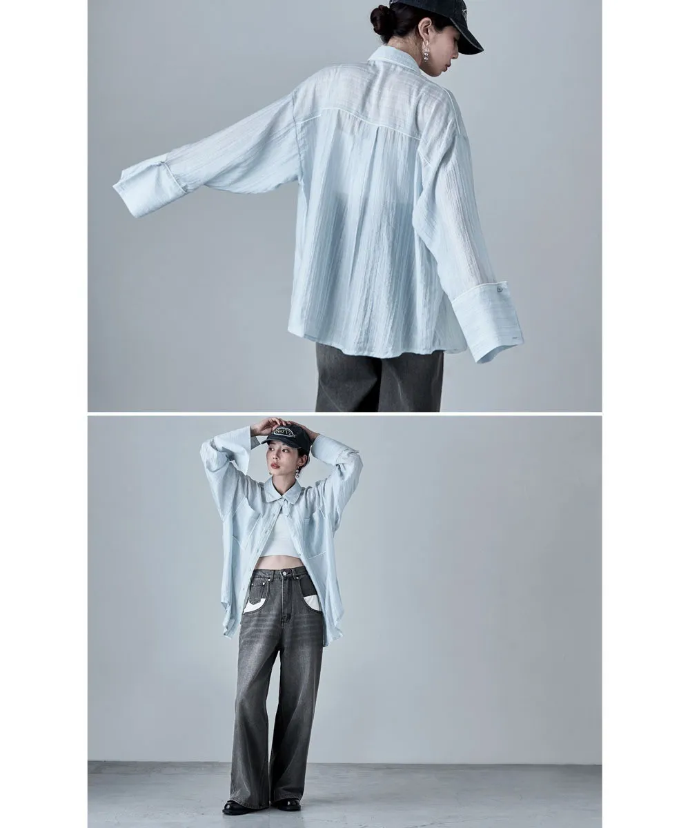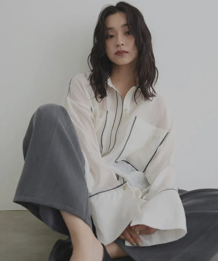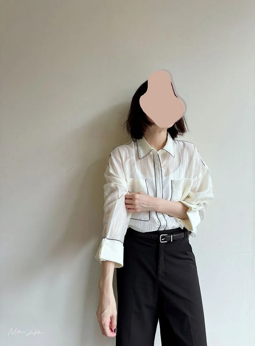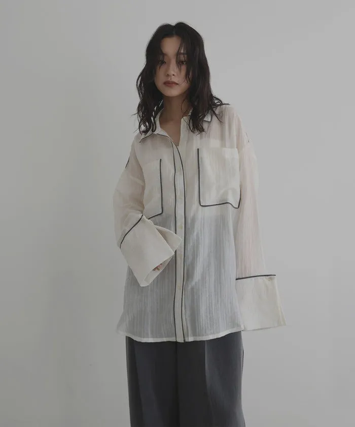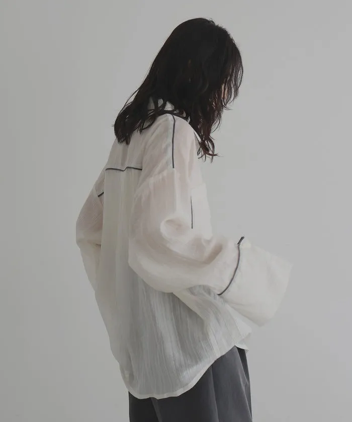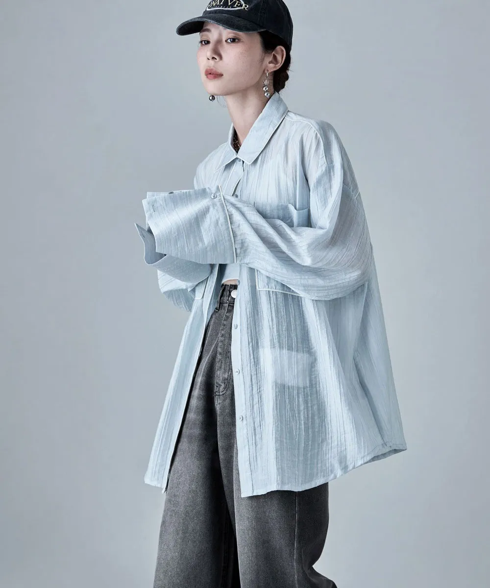 小幫自留水藍/米白光面料就非常有質感它是有立體的紋路~微微的霧面光澤立體紋路~超級美利用線條立體滾邊~好好看中長版~面料軟有墜度~非常舒服喔微透~建議內搭或搭配BRA TOP真心美的一款襯衫~專櫃折扣請入手請注意它的手部設計~超級好看喔手部設計加長~完美設計感如果反折又更美~真的超級推薦