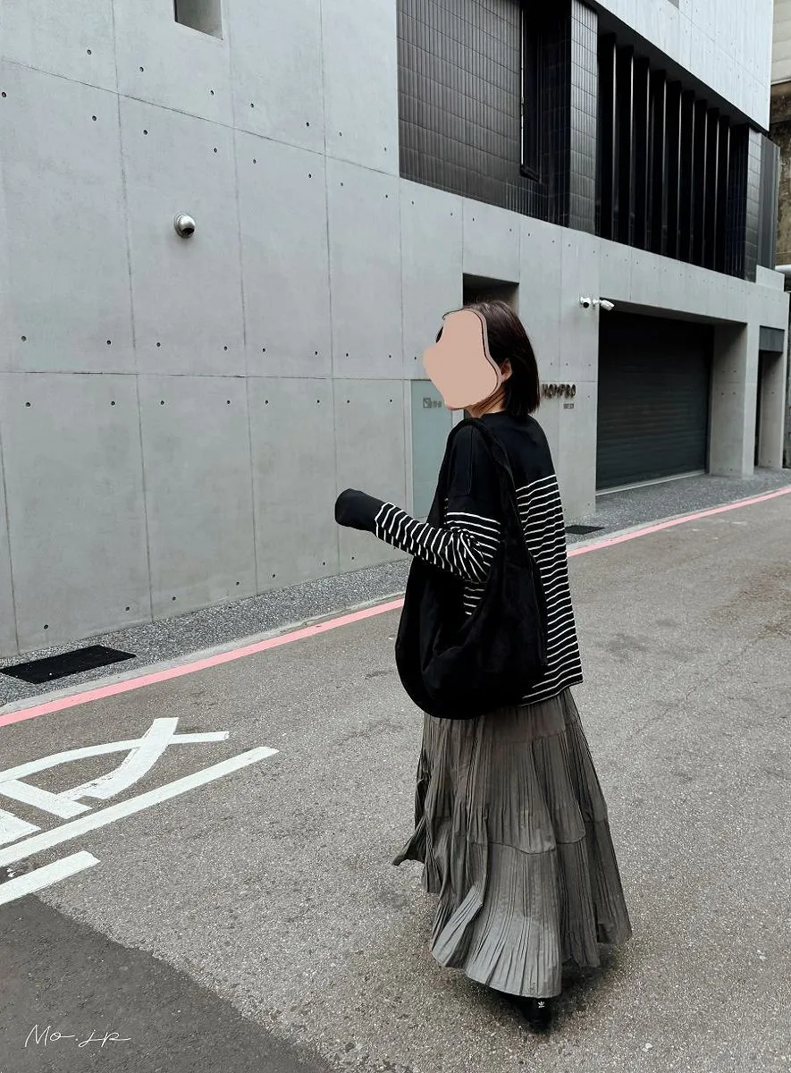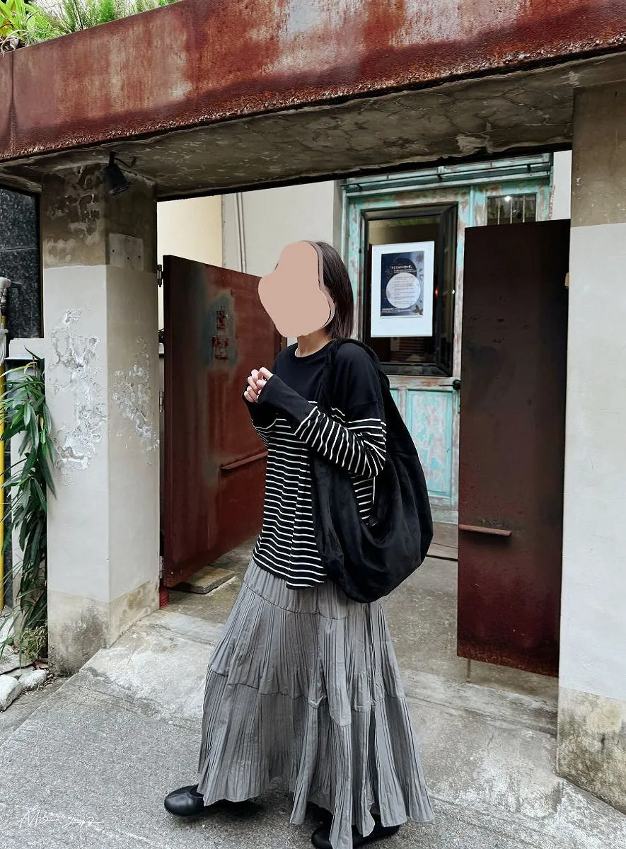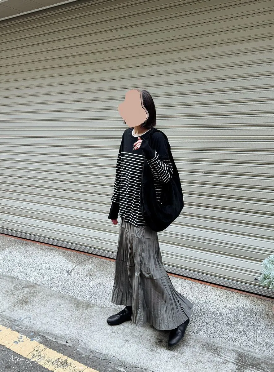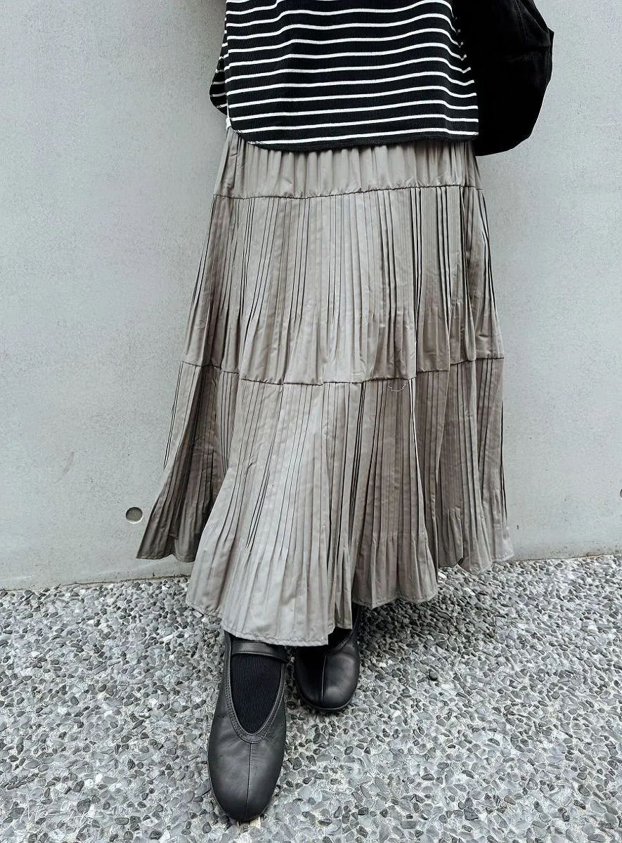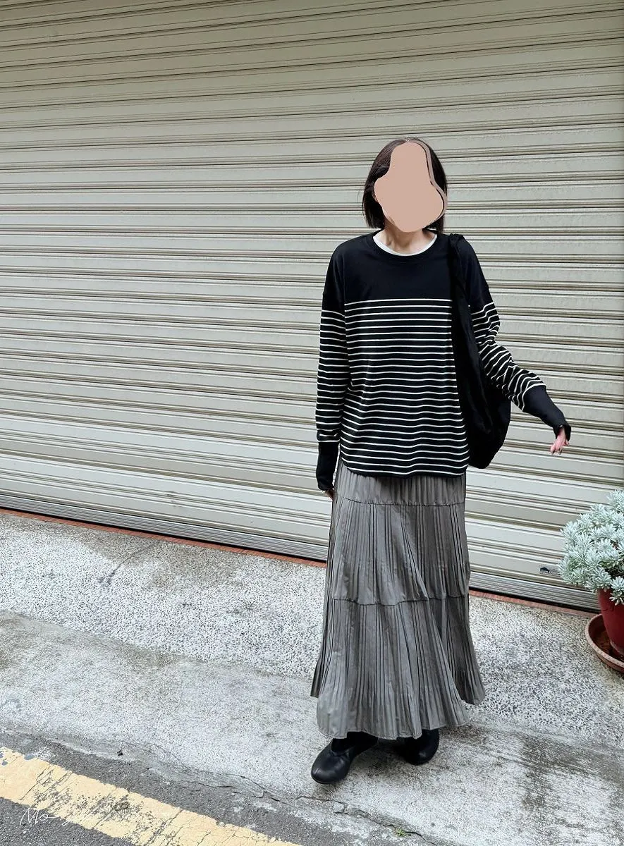 這款是品牌推出的壓紋百折款它的百褶是直接服貼在裙子上面的腰部鬆緊~好穿裙襬的弧度也很順身自然顏色是低調的灰軍綠喔~秋天非常適合面料不會過厚重4季都可以穿搭的面料有內裡可以單穿.無口袋小幫<164CM>穿搭心得嬌小女孩推薦這款喔小幫自己穿搭的時候覺得還可以在長一點點搭配時穿在比較低腰的位置喔舒服順身