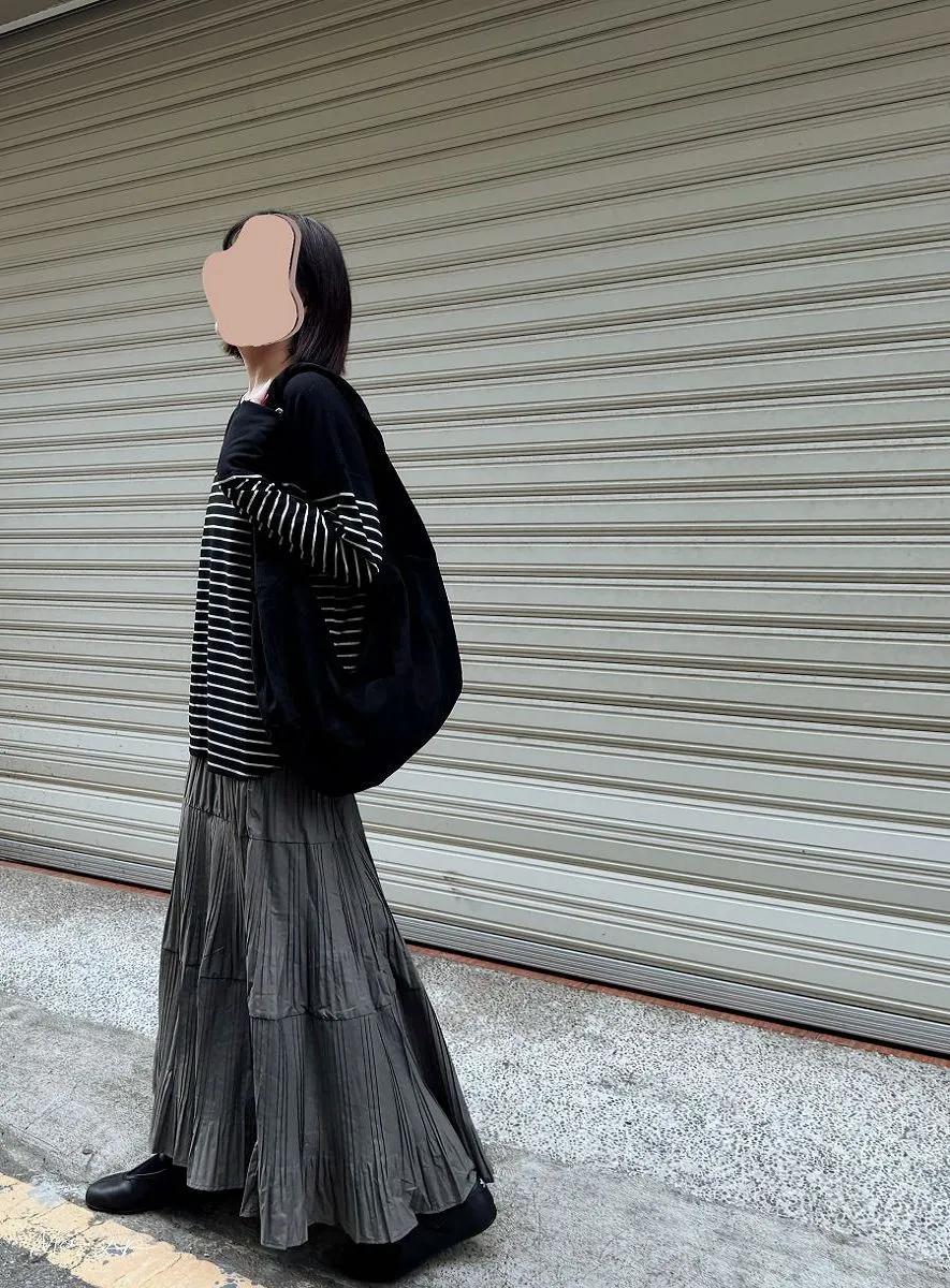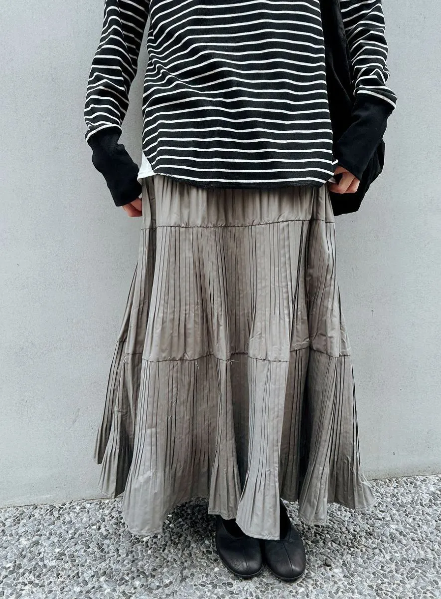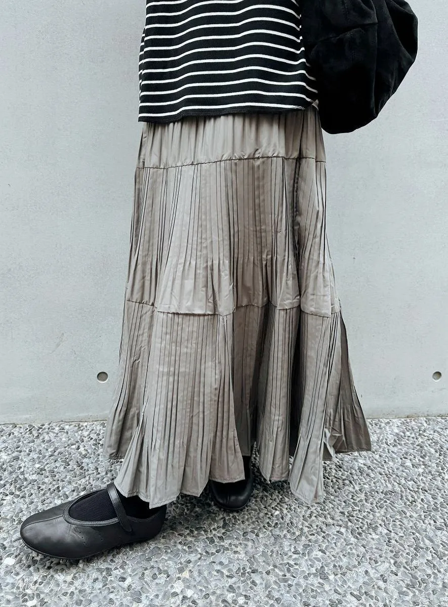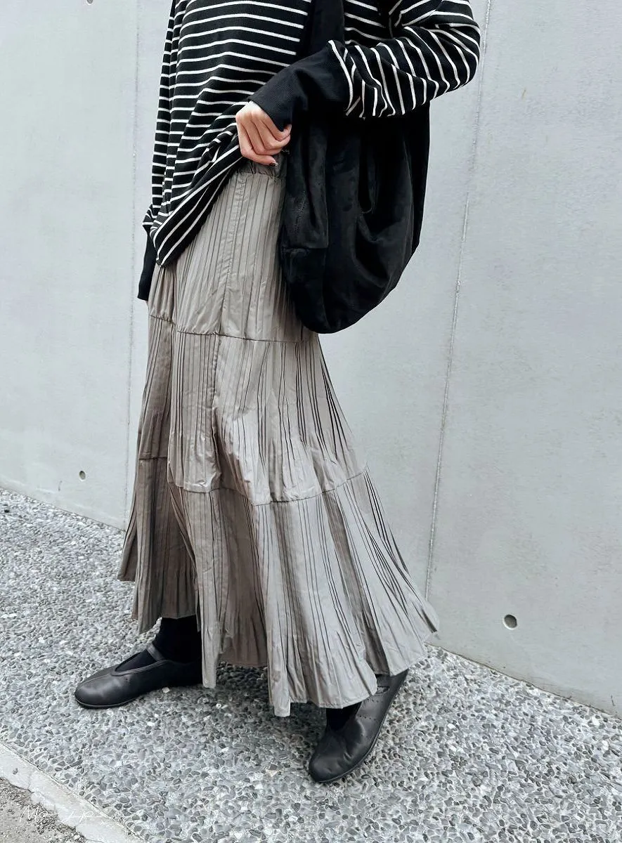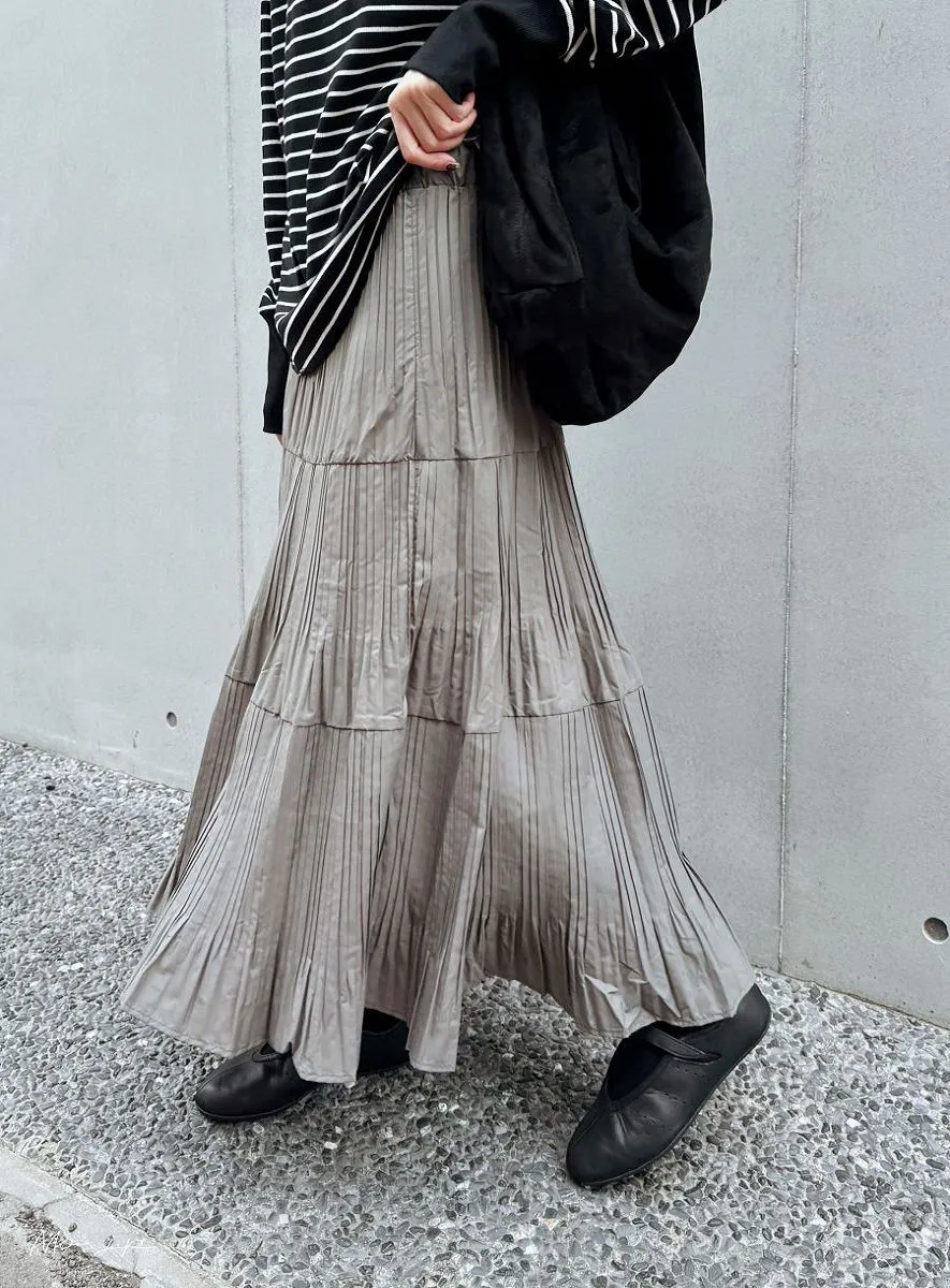 這款是品牌推出的壓紋百折款它的百褶是直接服貼在裙子上面的腰部鬆緊~好穿裙襬的弧度也很順身自然顏色是低調的灰軍綠喔~秋天非常適合面料不會過厚重4季都可以穿搭的面料有內裡可以單穿.無口袋小幫<164CM>穿搭心得嬌小女孩推薦這款喔小幫自己穿搭的時候覺得還可以在長一點點搭配時穿在比較低腰的位置喔舒服順身