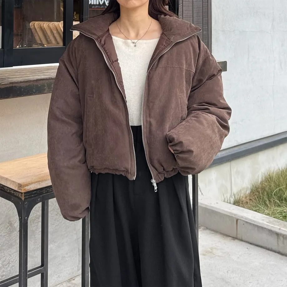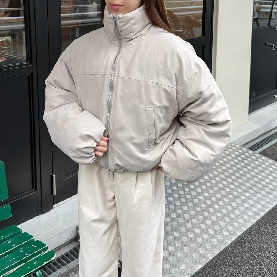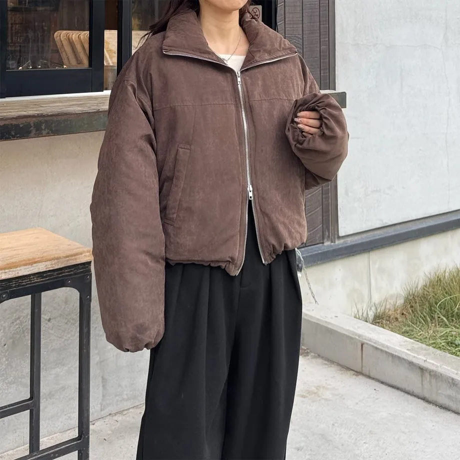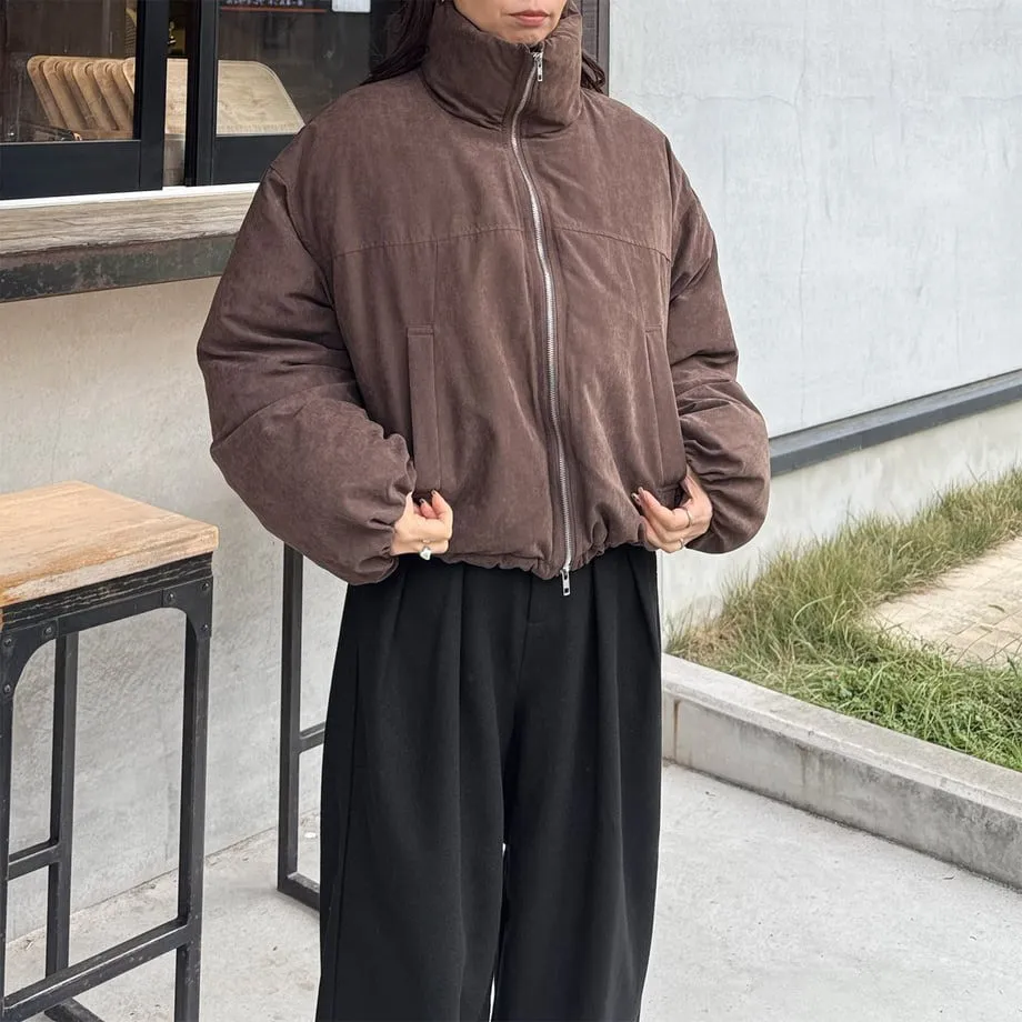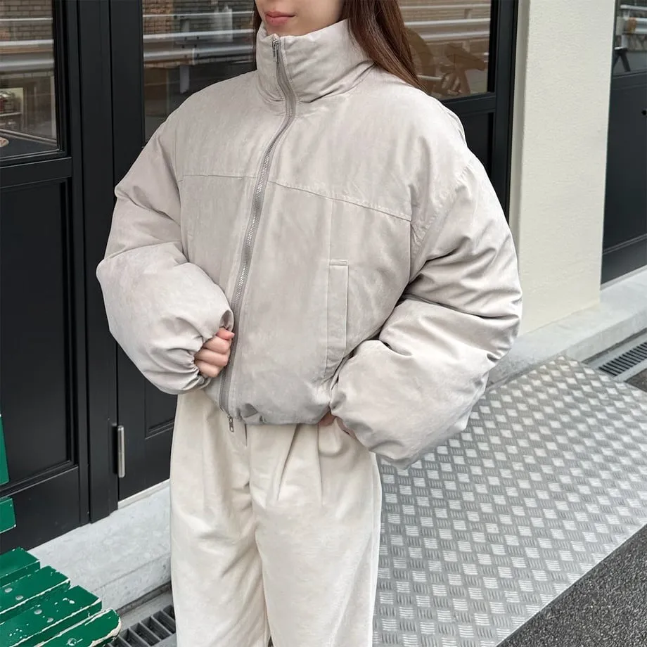 這款輕盈的短版外套採用霧面仿麂皮布料製成