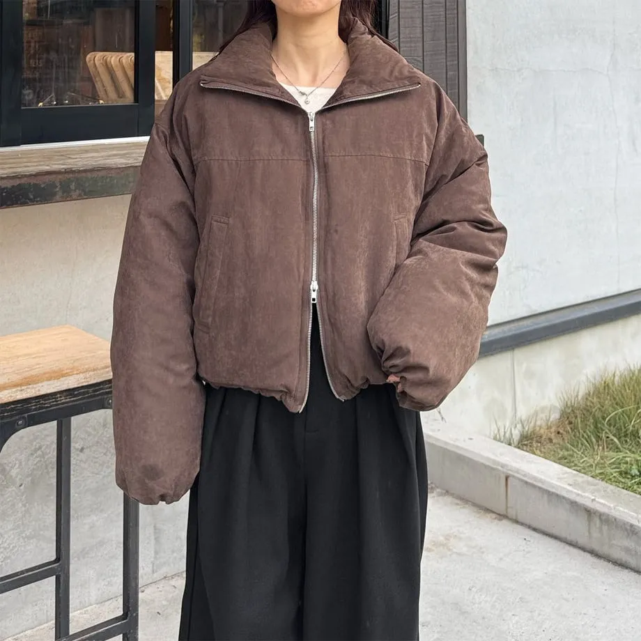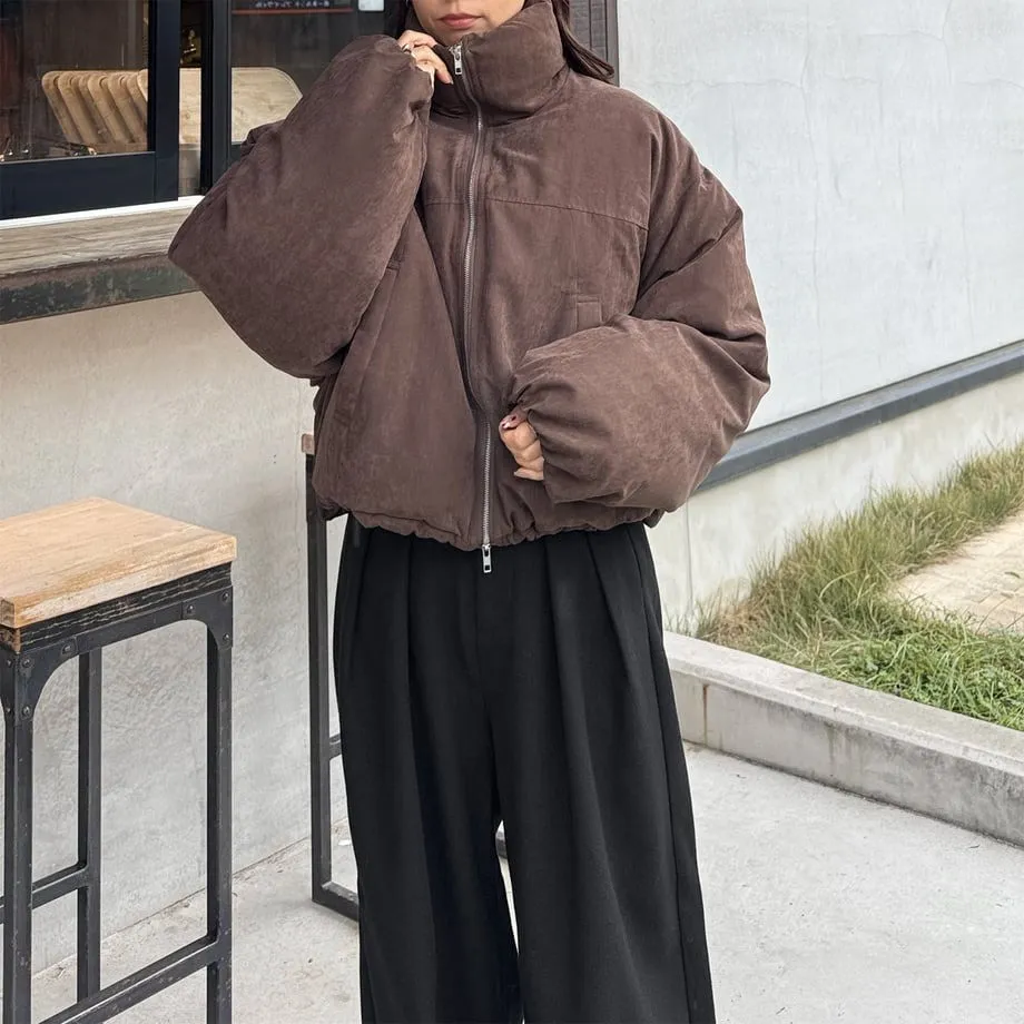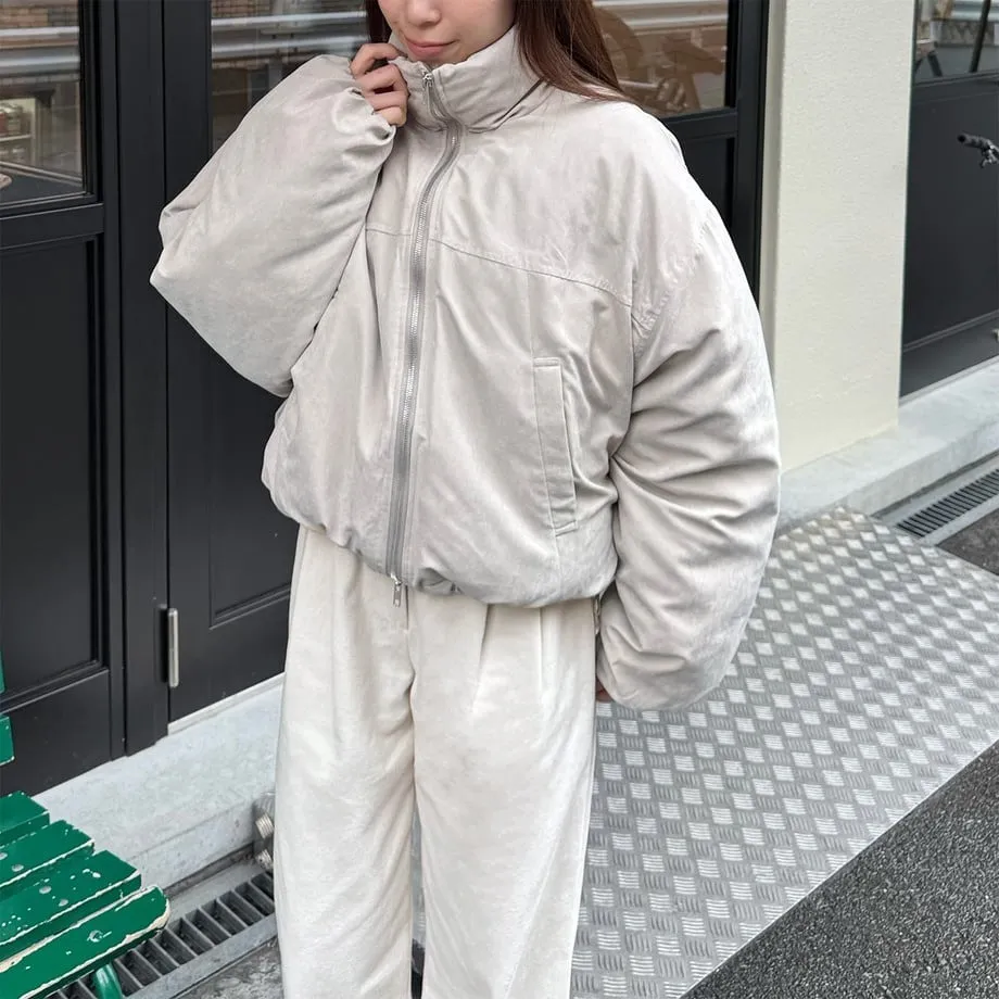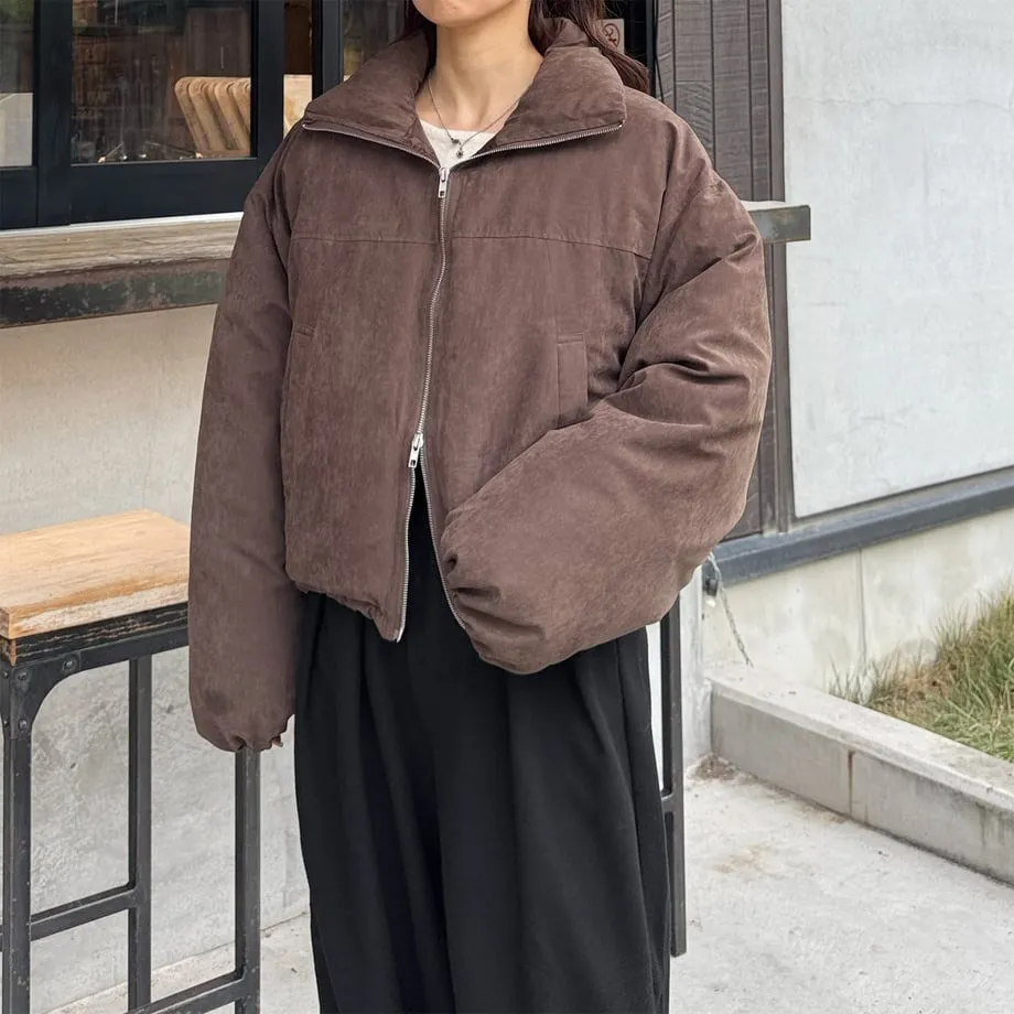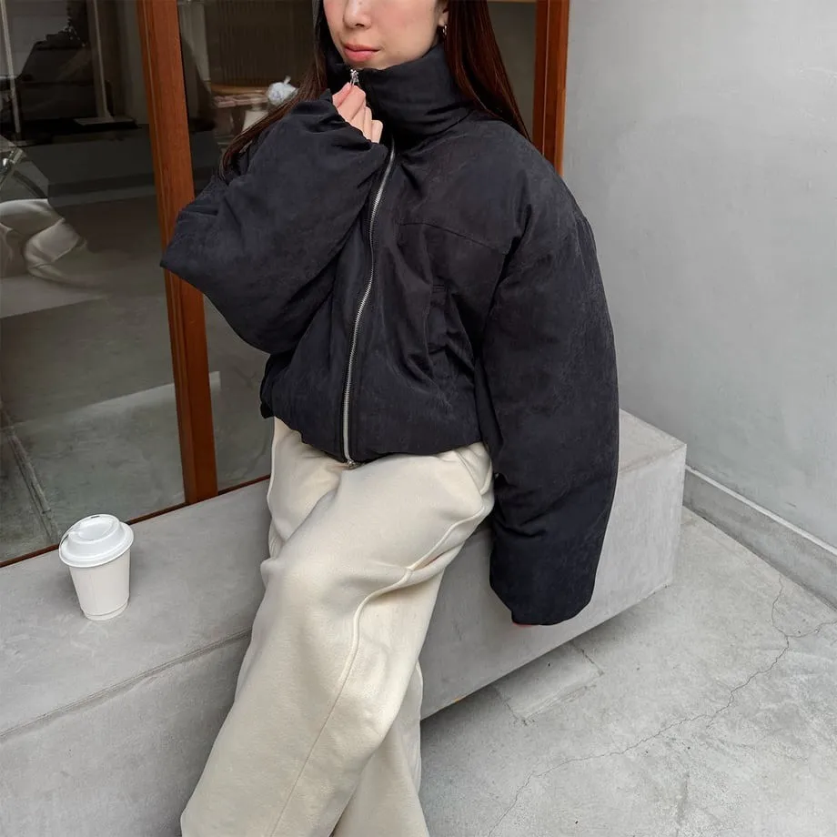 這款輕盈的短版外套採用霧面仿麂皮布料製成