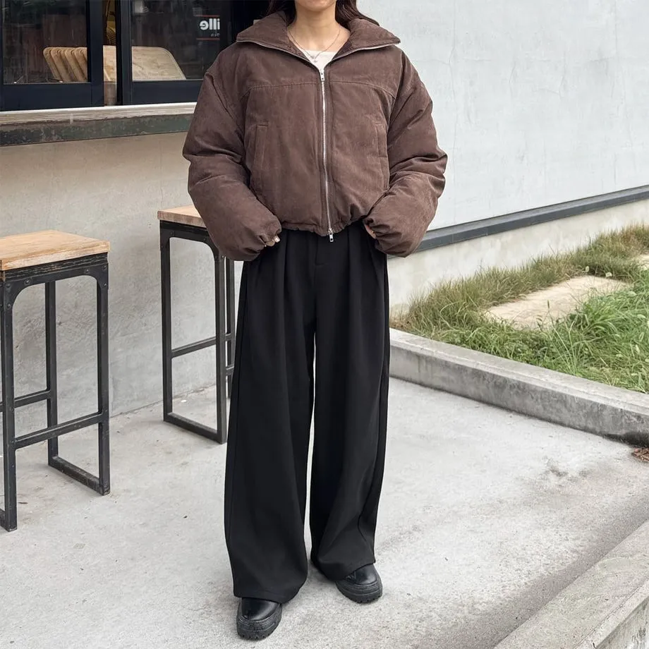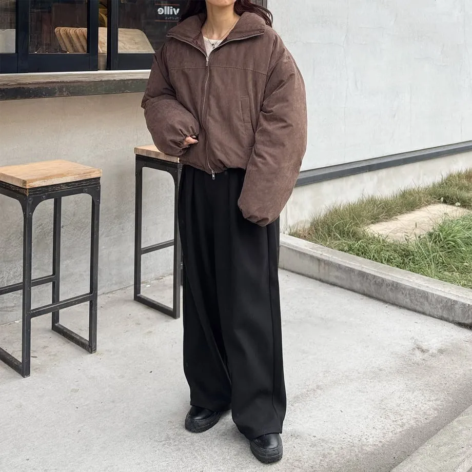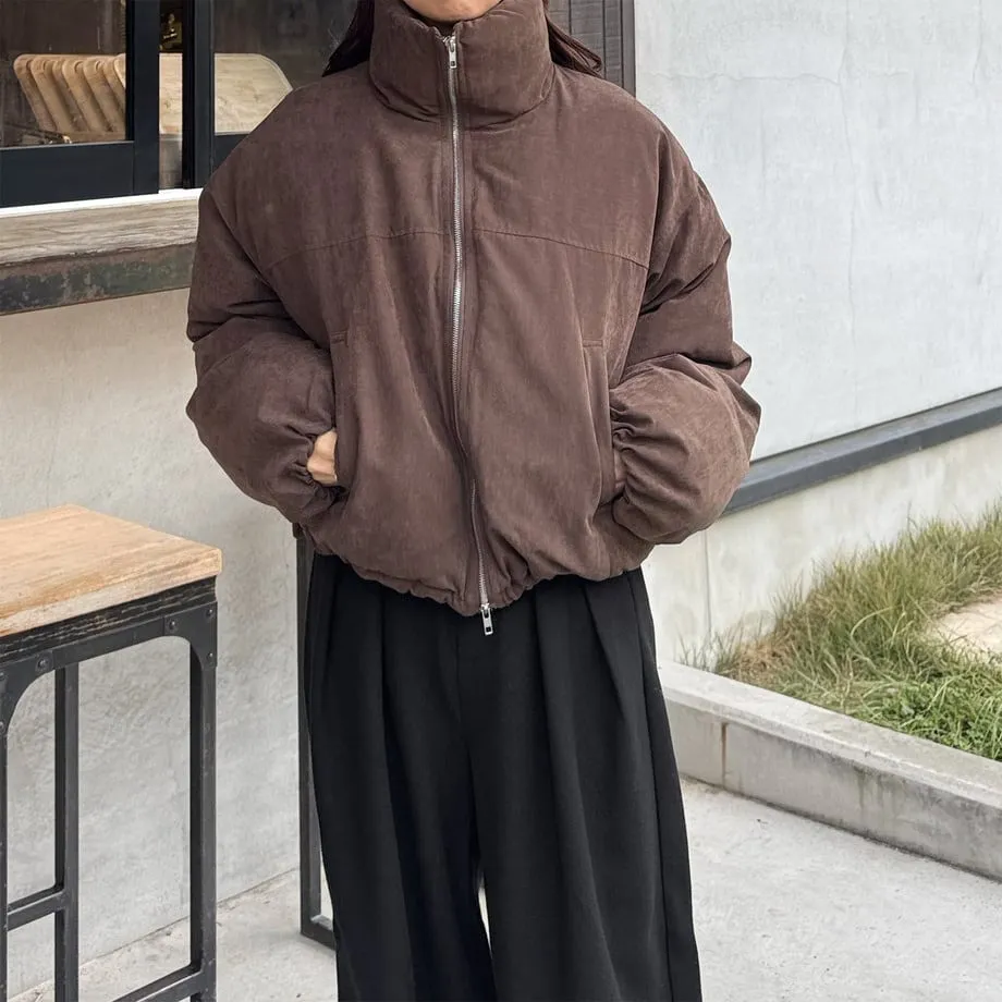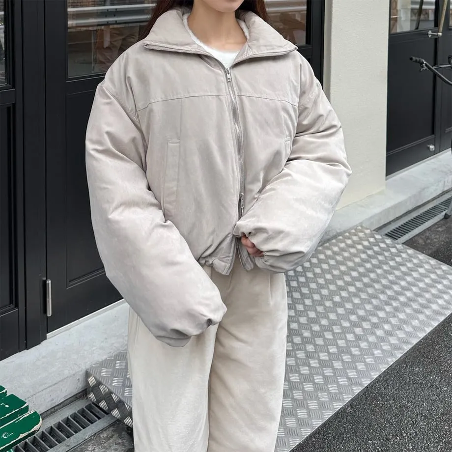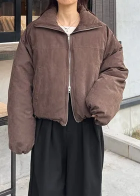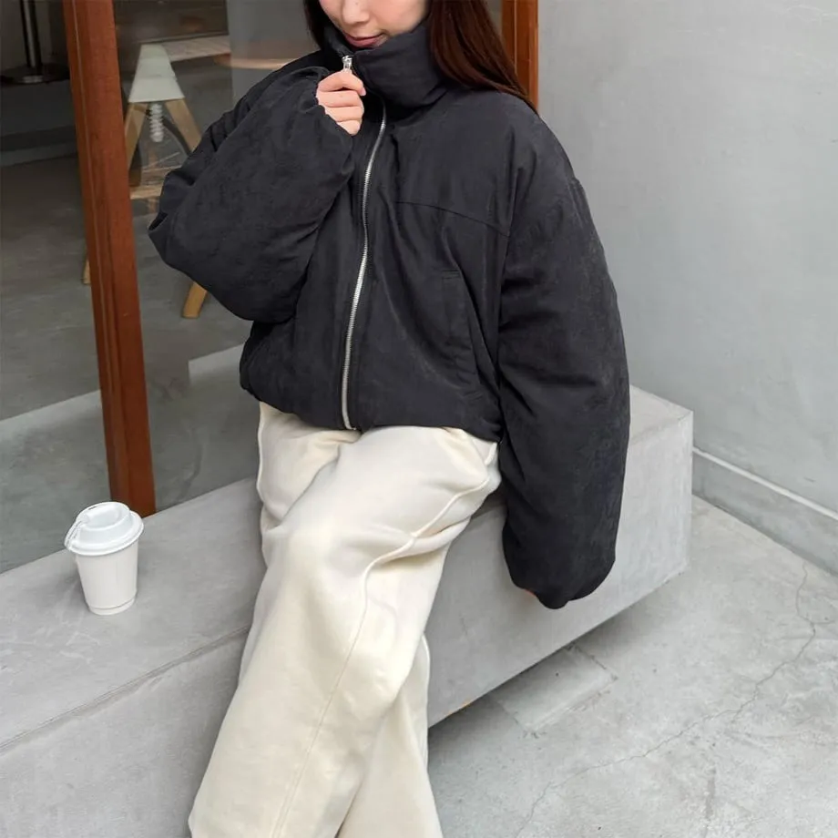 這款輕盈的短版外套採用霧面仿麂皮布料製成